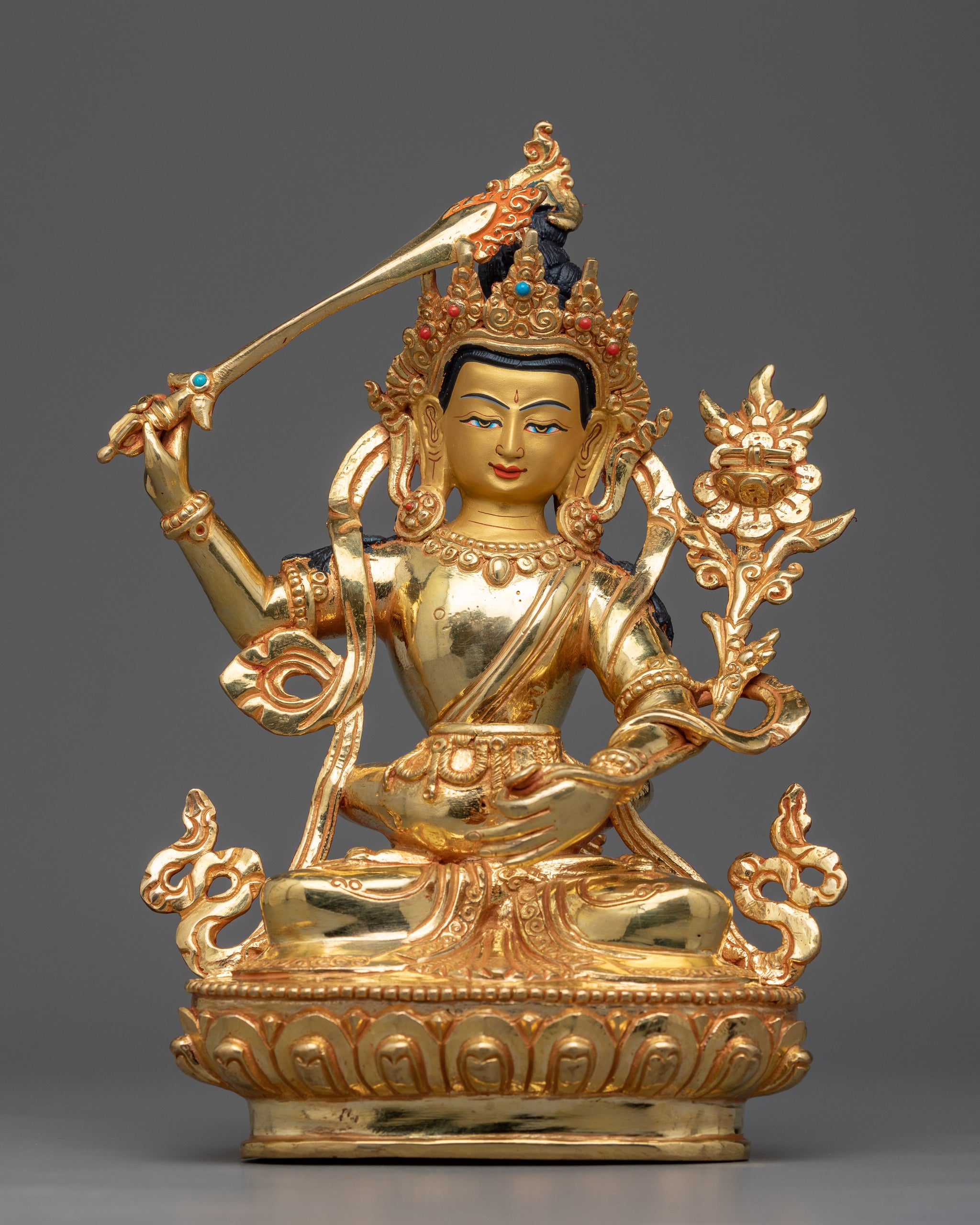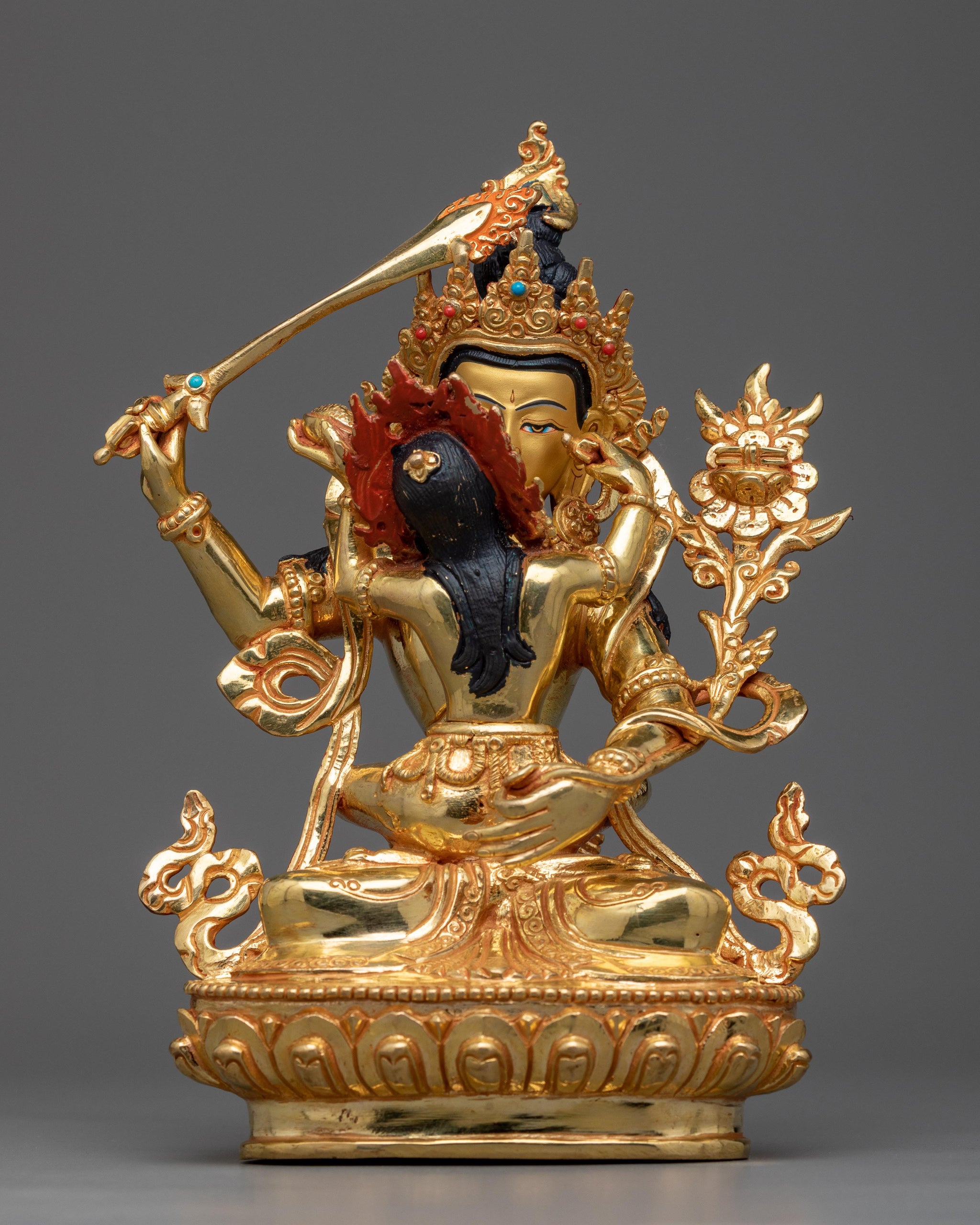 With our Manjushri with Consort statue, you can go deep into the realm of enlightened understanding. This sculpture represents the confluence of divine wisdom and understanding, which has always attracted spiritual seekers. This statue is from the heart of Nepal and exhibits exceptional craftsmanship. The brilliant copper body, gilded in 24k gold and adorned with vibrant acrylic paintings, captures every detail and is a visual joy.
