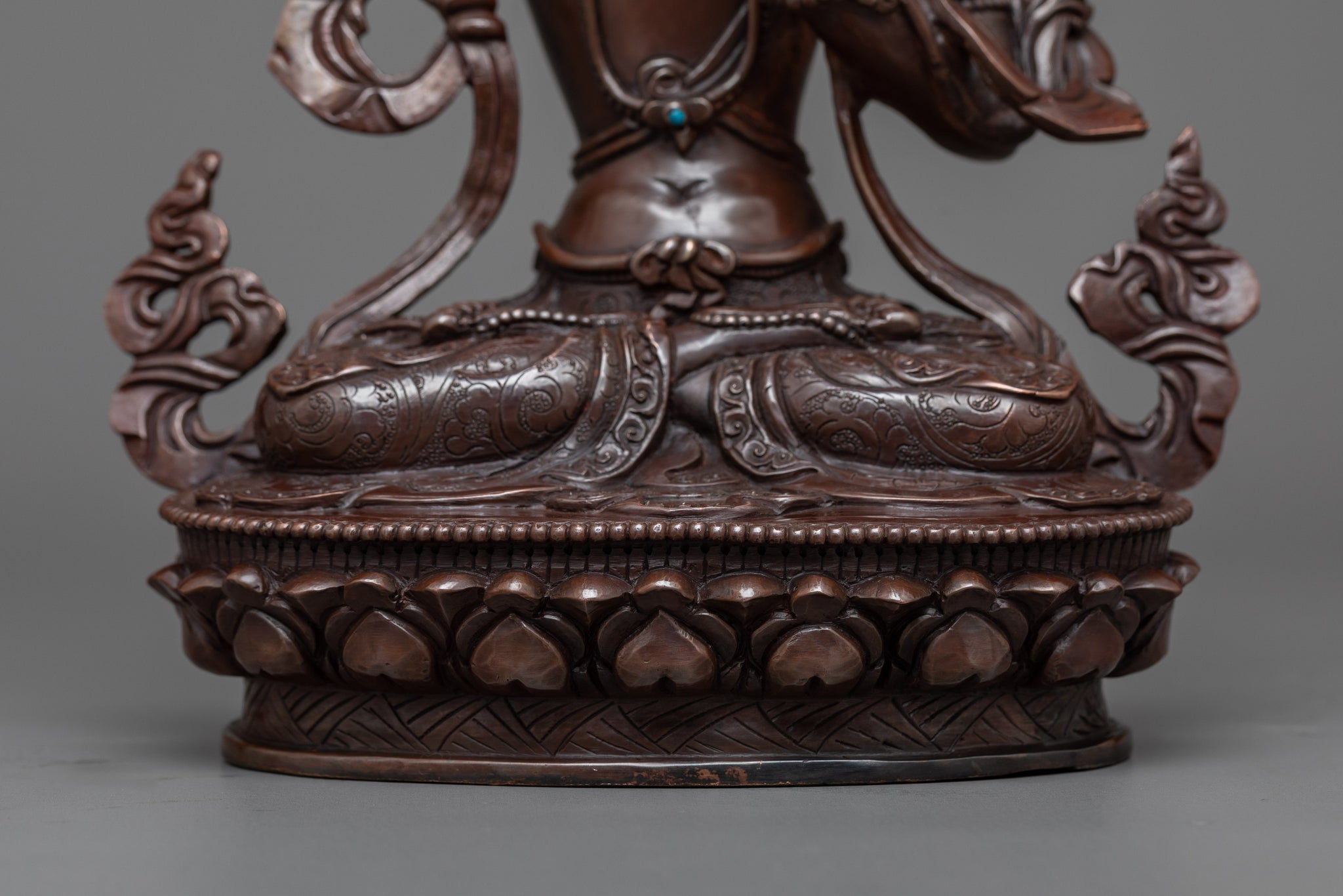 Vajrayogini is stunning. The details are amazing. It's easy to make out her facial expressions, skulls, feet, and the ring of fire around her. You can tell she's handmade. There is a consecration hole in her back.