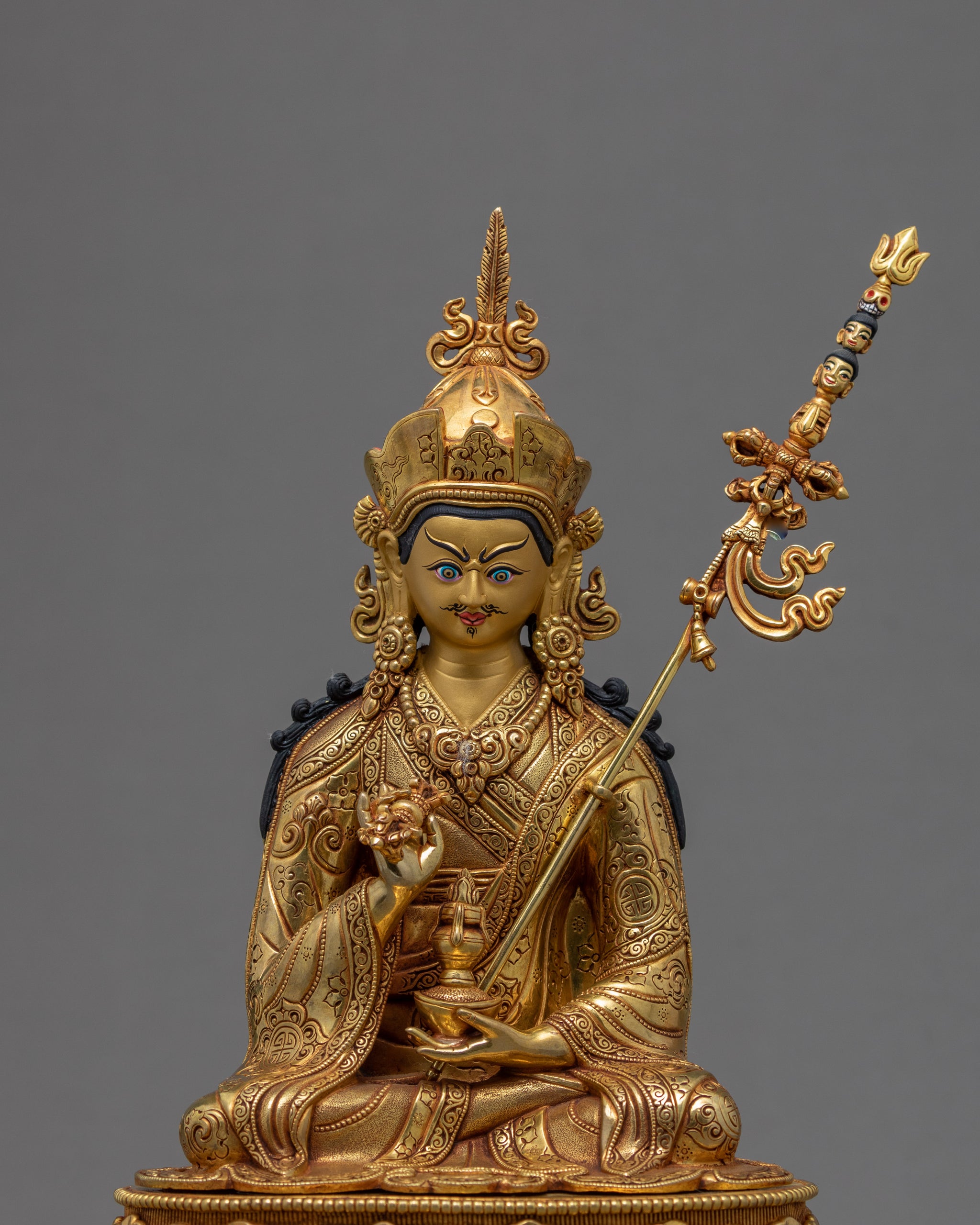 Master Rinpoche is an important figure in Vajrayana and Tibetan Buddhism. The lotus-born deity art is excellently made in this gold statue, seated on a moon disc on a lotus in a royal posture with anger on his face. He wears a tantric hat with an eagle wing on top of his black hair flowing through his shoulder and a richly patterned robe. In his right hand, he holds a Vajra, while in his left, he holds a skull cup filled with immortality nectar. In the curve of his left hand, he holds the Khatvang trident, which has three skull heads, a vajra, a bell, and a trishool on top.