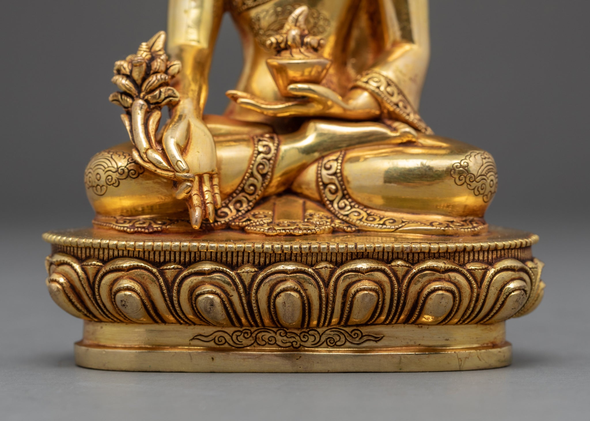 The artist of Kathmandu valley has exquisitely deft and sculpted the Medicine Buddha sculpture in traditional Himalayan style. We have elegantly hand-carved this statue in a copper body and gilded it with genuine 24k gold. He has an alms bowl full of long-life nectar in his left hand which is in meditation mudra. Similarly, his right hand is in an earth-touching gesture, holding the "great medicine," the myrobalan plant. The design of the robe, lotus seat, and other essentials are magnificently embellished with precious gems and stones.