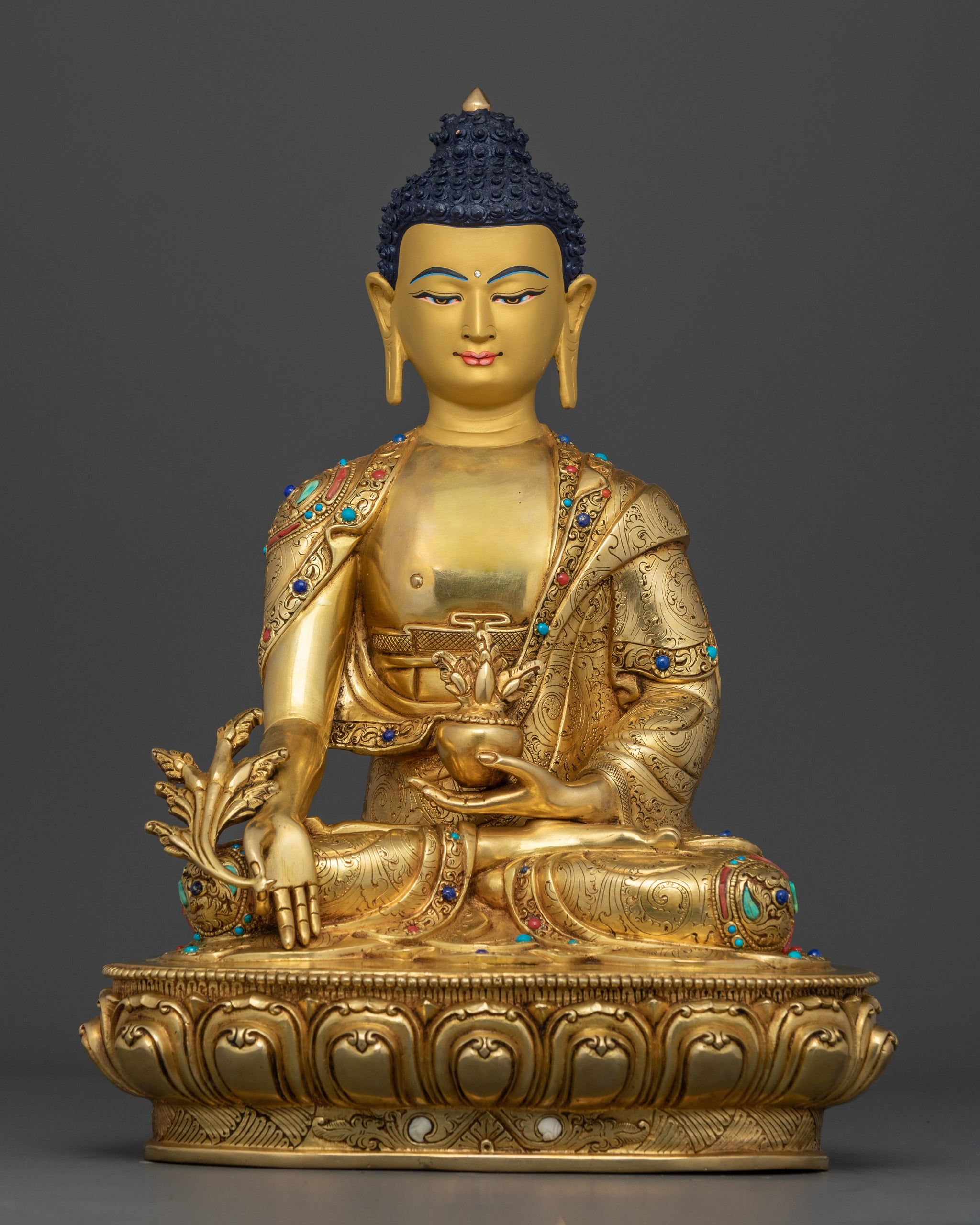 Introducing the Buddha Medicine Guru, a mesmerizing figure measuring 13.2 inches (33.5 cm) tall with a base width of 9.6 inches (24.5 cm) and weighing 4.50 kg. This statue is precisely constructed from 24K gold gilded materials, with elaborate gold and acrylic paintings and hand-carved gemstone accents, all set on a copper body.
