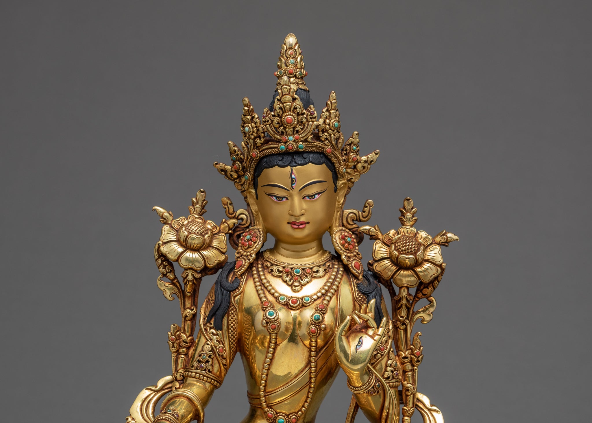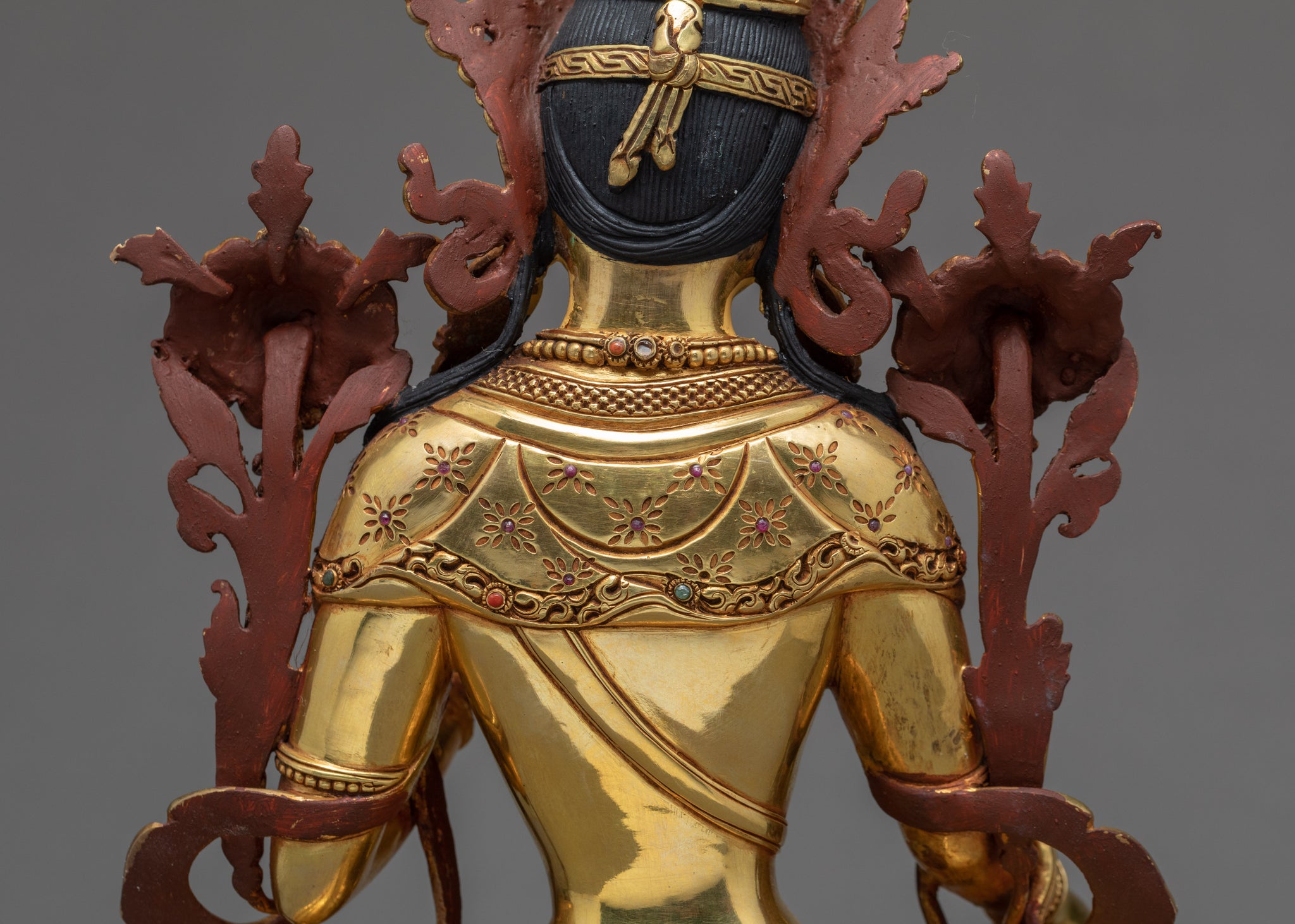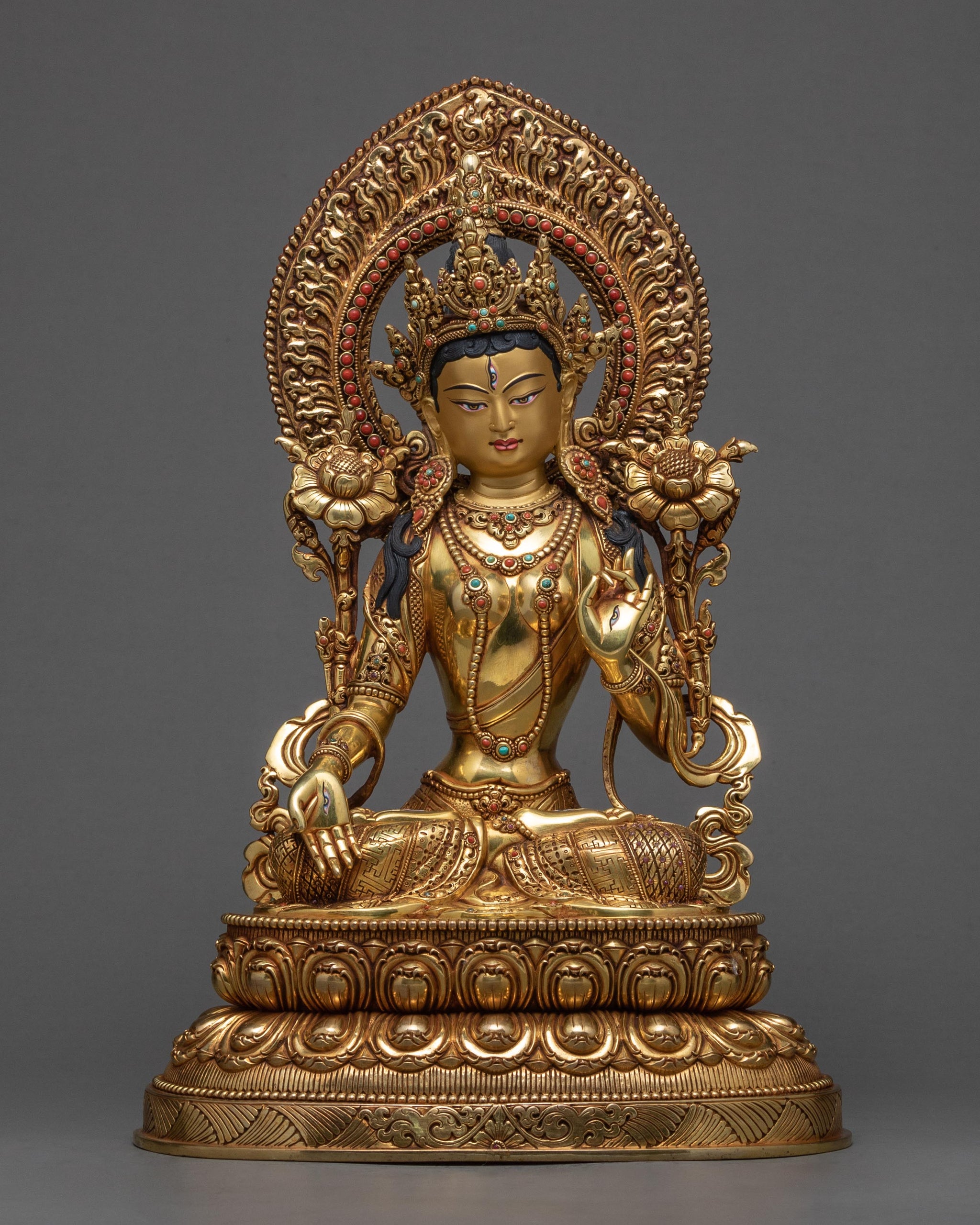 This medium White Tara Statue was crafted using traditional Himalayan craftsmanship. This meticulous sculpture was carved in a copper body and coated with gold by a Nepali artist. In a very tranquil expression, she wears a tiara, a long and short necklace, gold and jewel embellishments, and widely patterned silk attire. The corals and jewels inlaid in her accessories give the statue an attractive appearance which will be a great gift for a practitioner like you.