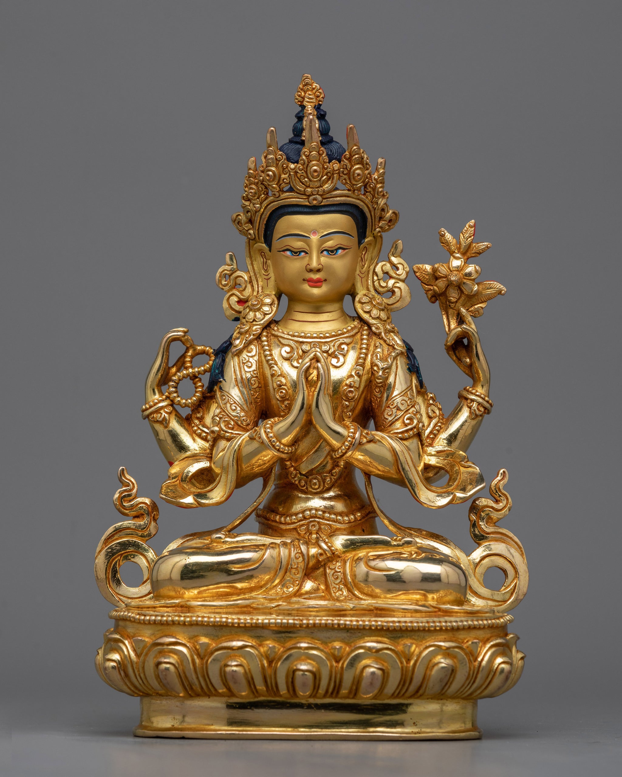 This Merciful Deity Chenrezig Statue is a beautiful piece that will brighten your spiritual path as you embrace the infinite compassion. This statue, which is 9.4 inches in height and 5.9 inches in base, is built of the best materials, including copper with 24K gold plating and beautiful paintings in gold and acrylic. It emits a sense of divine mercy and benevolence. Chenrezig's enlightened energy is embodied in every aspect, from the calm countenance to the soft posture, which will lead you on a journey of spiritual development.