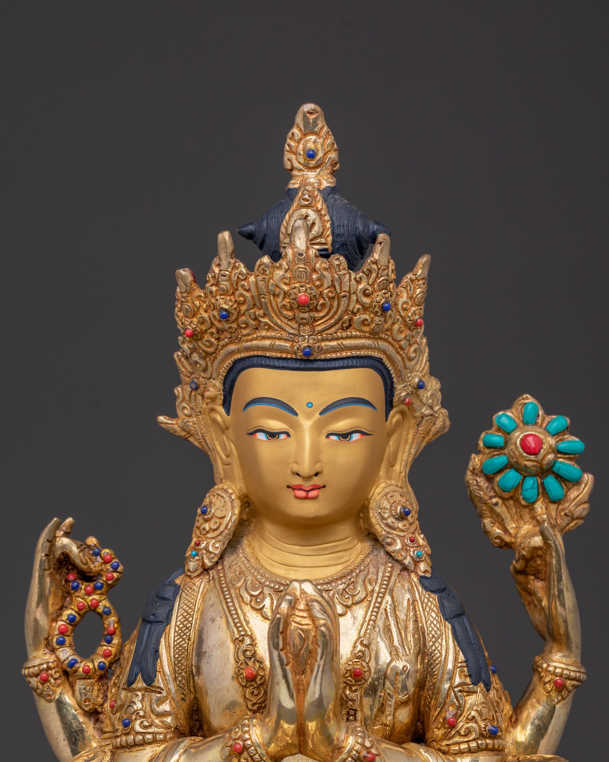 Chenrezig's four-armed posture, holding the wish-fulfilling jewel, lotus, and mala beads, symbolises his active and ceaseless dedication to alleviating suffering. His gentle expression conveys profound inner peace, inviting reflection on the path of compassion. This meditation statue inspires connection to the boundless love within, a tangible representation of spiritual virtue.
