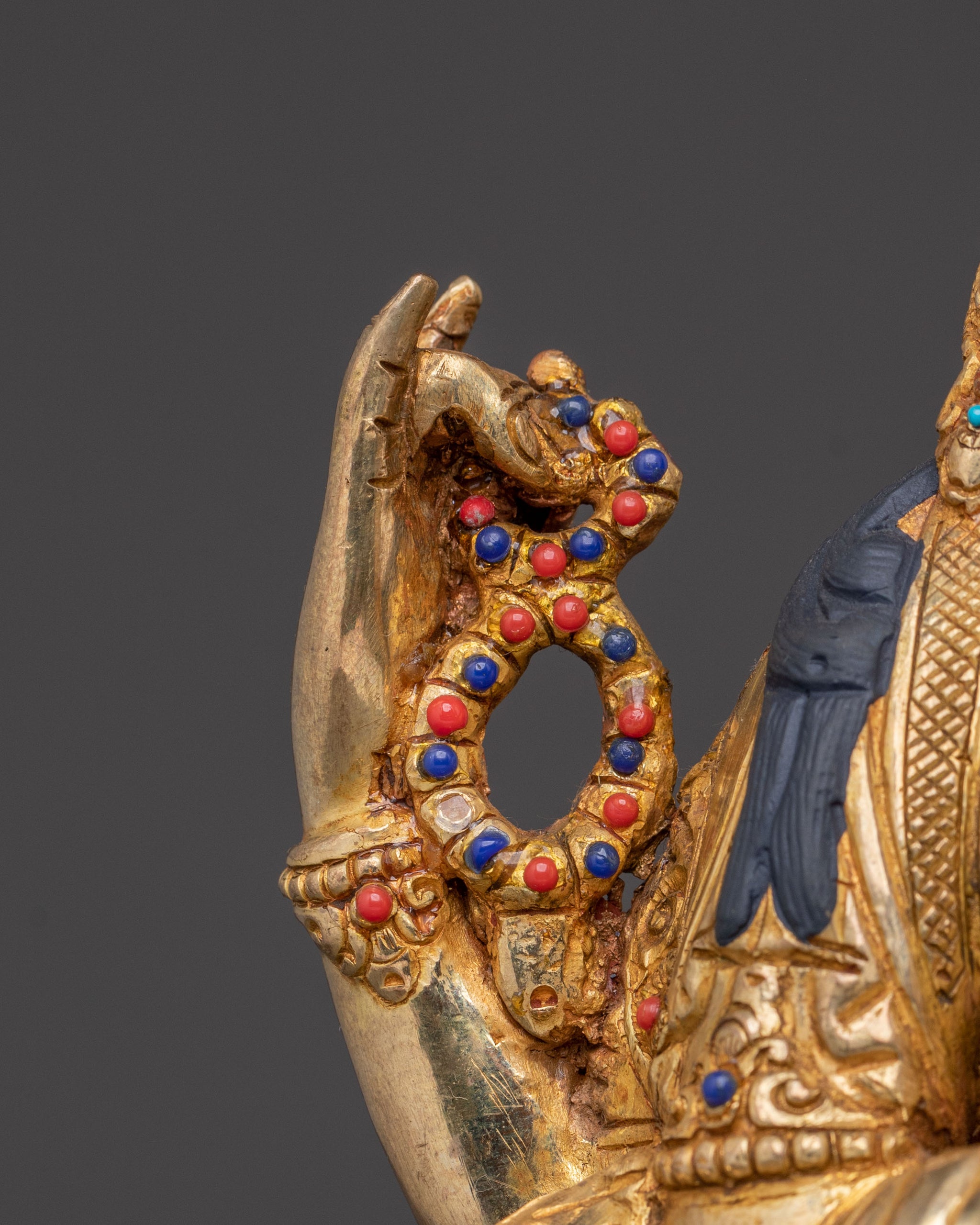 Chenrezig, known as Avalokiteshvara in Sanskrit, is the Bodhisattva of Compassion, revered across all schools of Buddhism. He is believed to hear the cries of all sentient beings and assists them on their path to liberation. His mantra, Om Mani Padme Hum, is one of the most widely recited prayers in Tibetan Buddhism, embodying universal love and compassion and providing solace.