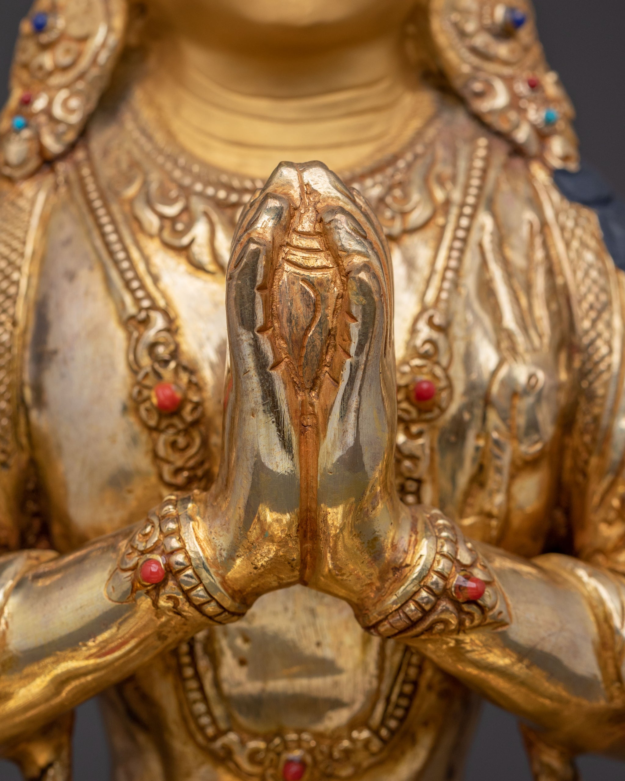 Adorned in radiant 24K gold, this exquisite mercy bodhisattva Chenrezig statue embodies boundless compassion and serenity. Standing 13.0 inches (33cm) tall, this handcrafted copper sculpture from Nepal offers a comforting presence, radiating peace into any sacred space. It is a profound representation of infinite empathy, designed to inspire quiet reflection.