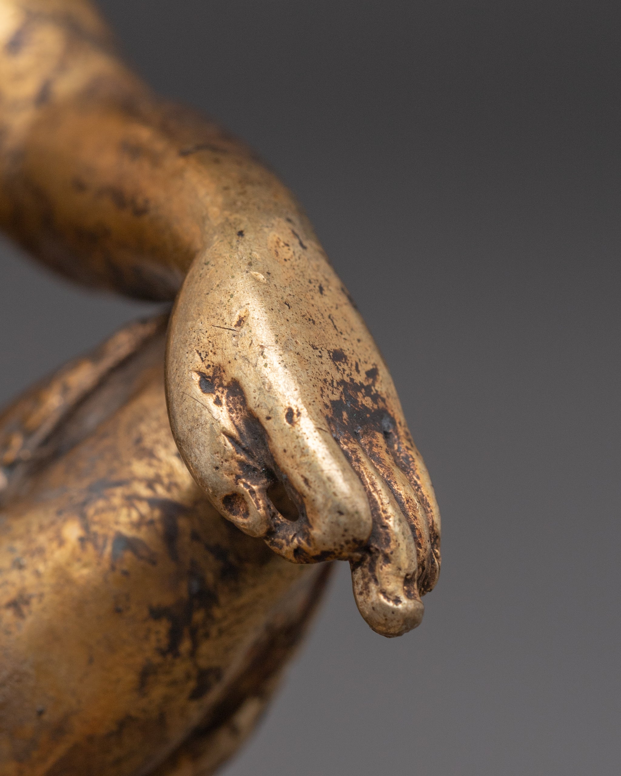 Milarepa is depicted with a radiant pale body, embodying the ascetic purity and spiritual dedication for which he is revered. His right hand rests behind his leg while his left hand is placed above his left knee, reflecting deep meditation and serene composure. He sits upon a lotus pedestal covered with deer skin, a symbol of renunciation, humility, and mastery over worldly attachments. The intricate detailing, from his flowing robes to the subtle adornments, brings to life the devotion and artistry of Himalayan craftsmen.