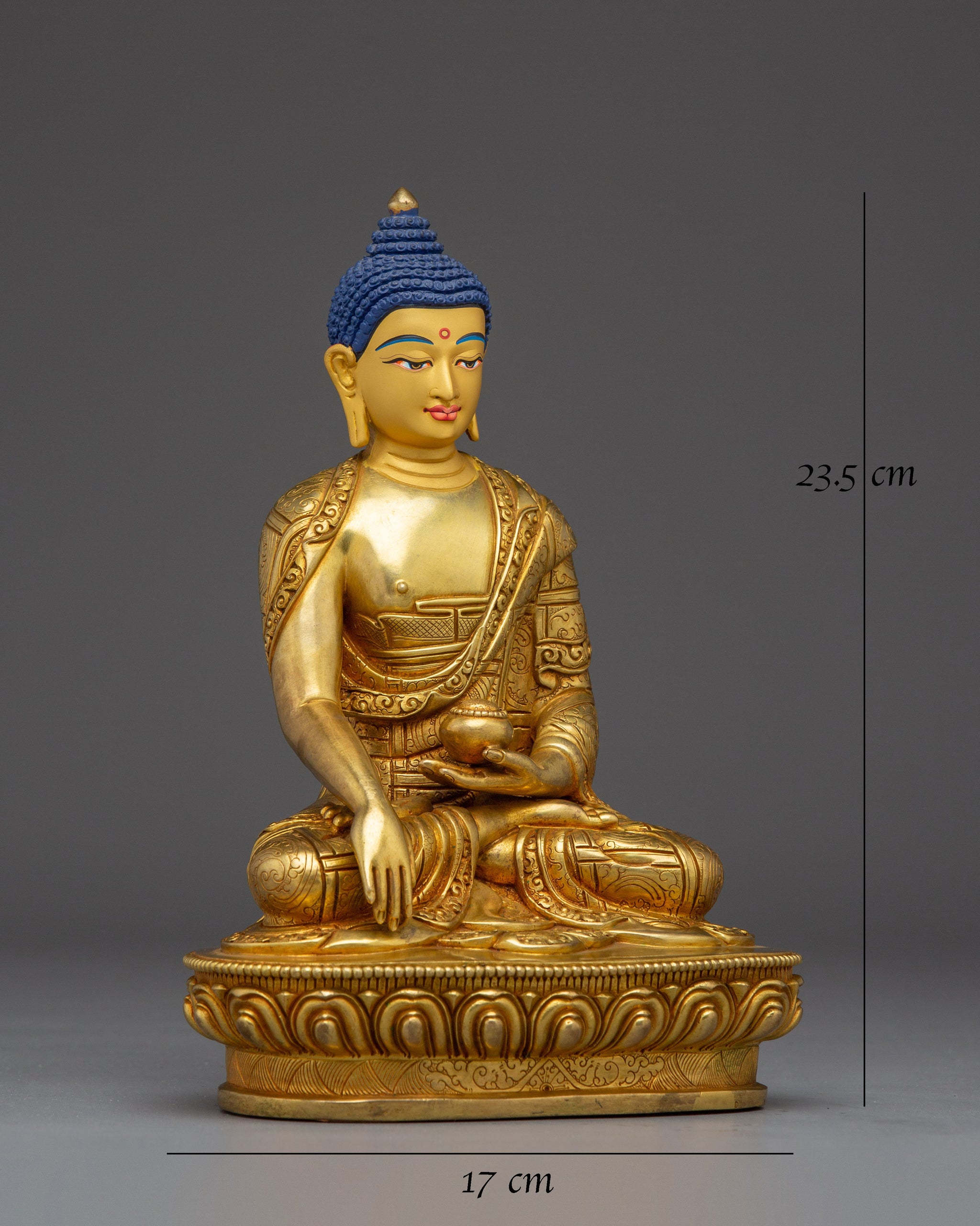 Mindfulness Symbol of Shakyamuni Buddha measures 9.3 inches (23.5 cm) in height and 6.7 inches (17 cm) at the base. It weighs 2.01 kilograms and is crafted with a copper body, adorned with 24K gold gilding, gold and acrylic paintings. The intricate craftsmanship reflects traditional Tibetan Buddhist artistry, making it a beautiful and meaningful spiritual piece.