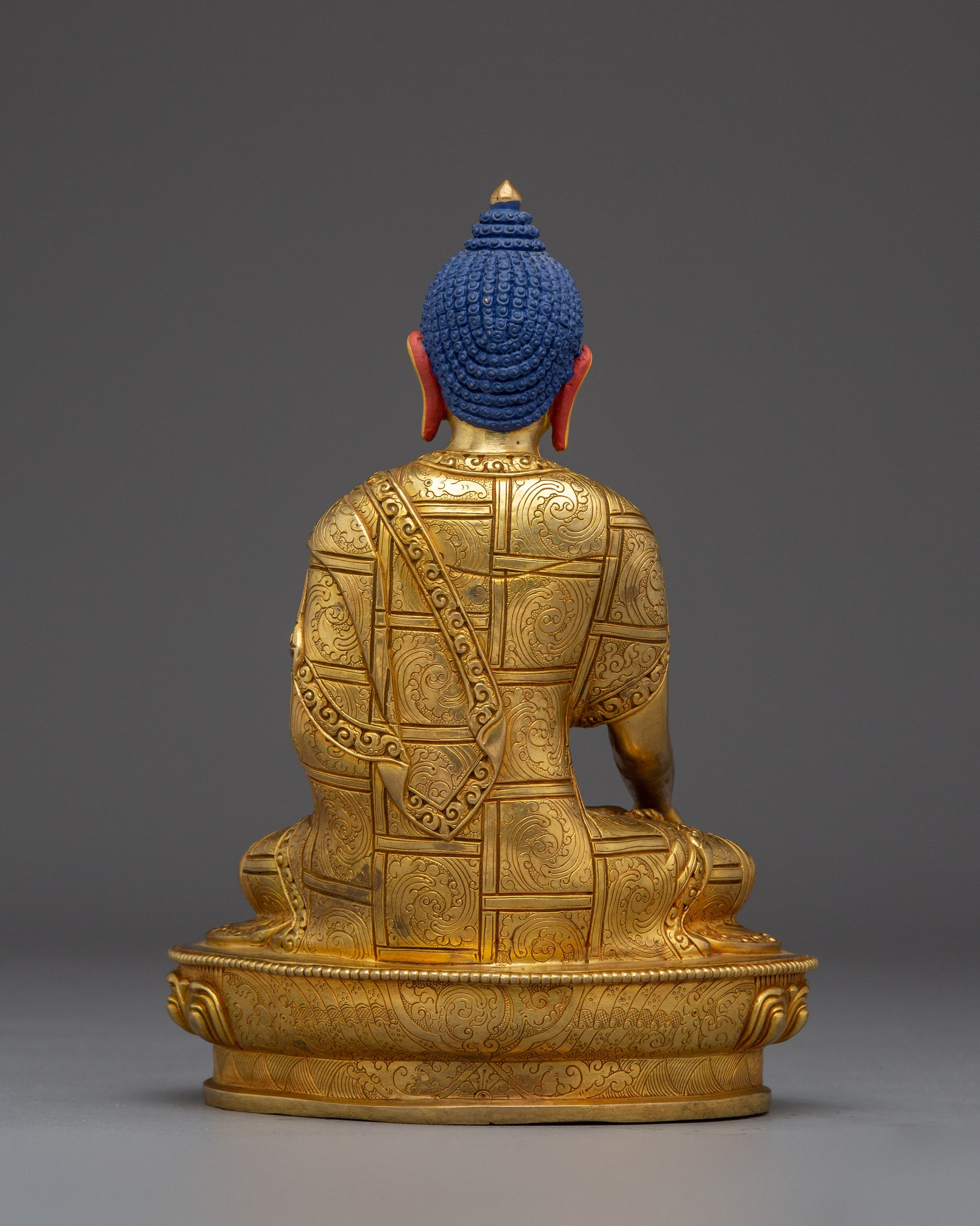 The Shakyamuni Buddha is depicted seated on a lotus base, symbolizing purity and spiritual awakening. His right hand performs the bhumisparsha mudra, or earth-touching gesture, representing the moment of his enlightenment when he called the earth to witness his awakening. The left hand holds an alms bowl, signifying renunciation and the monastic life. His calm face is crowned with an ushnisha, a cranial protuberance symbolizing supreme wisdom, often associated with the legend of snails that protected his head from the sun during meditation.