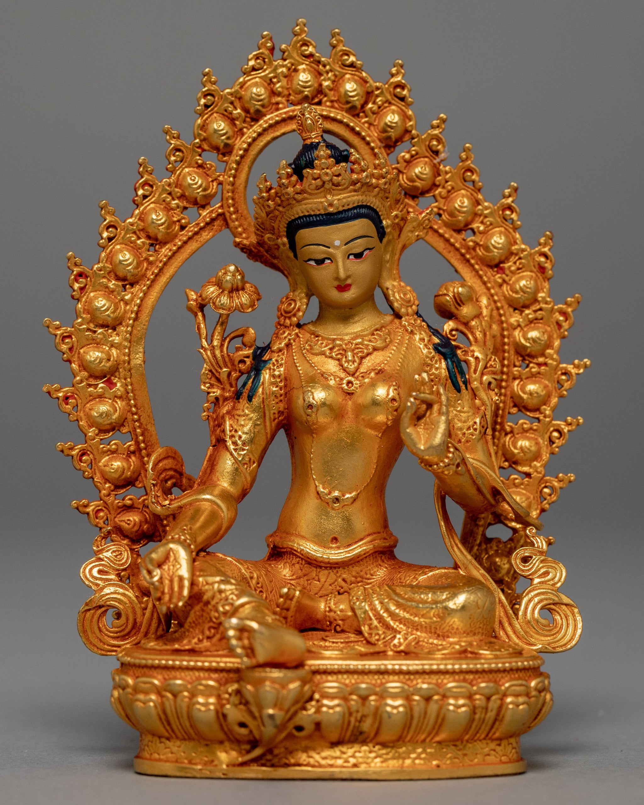The Mini Green Tara Sculpture was carved using a machine in a pure copper body and gilded with 24k genuine gold over the body. The use of acrylic paint which was done by hand, further highlights the carvings of the figure. the deity is peacefully seated atop a moon disc lotus with a calm expression. The supreme deity Green Tara directs wandering and disoriented souls back to their native state. This miniature statue of the Green Tara will be the perfect gift from Nepal. The statue's modest size makes it ideal for carrying along for regular meditation exercises.