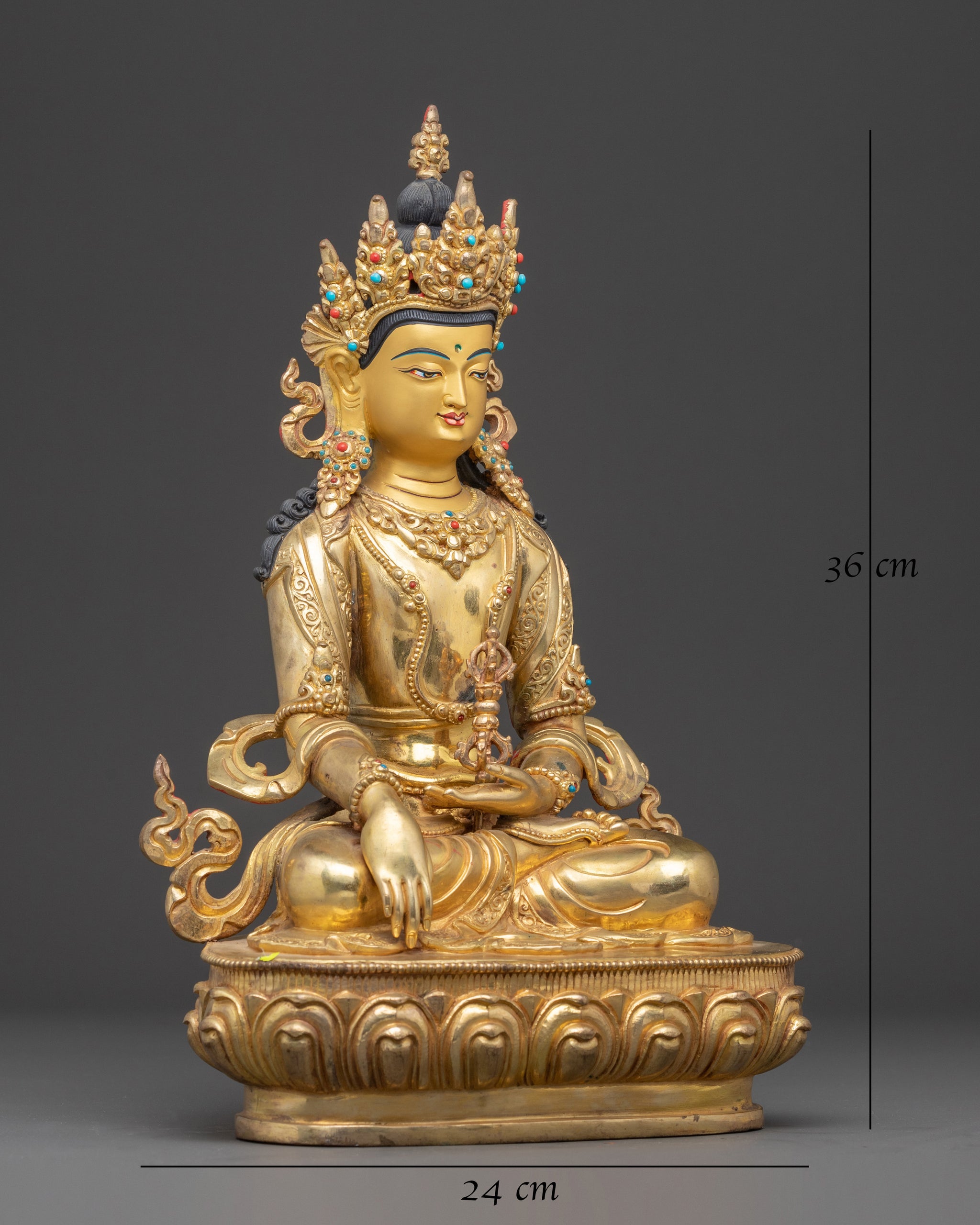 The Mitrüpa statue is depicted with his right hand in the bhumisparsha mudra, symbolizing the Earth as a witness to enlightenment. His left hand holds a vajra, representing indestructible wisdom and the power to overcome obstacles. He is seated on a lotus base, signifying purity and spiritual awakening, and wears a five-pointed crown, highlighting his status as a realized Mahasiddha and master of tantric teachings. This depiction emphasizes both his meditative focus and his enlightened authority.