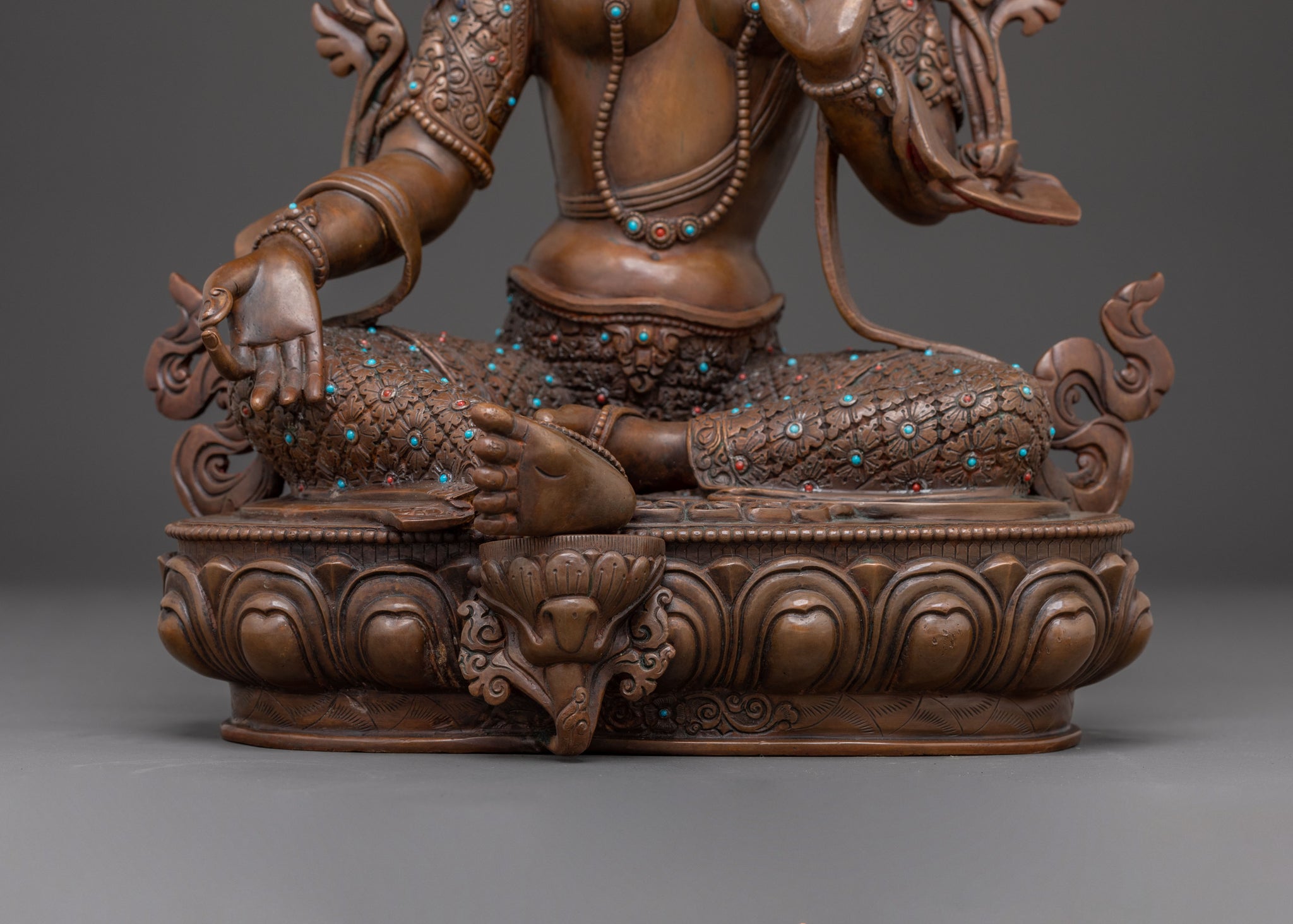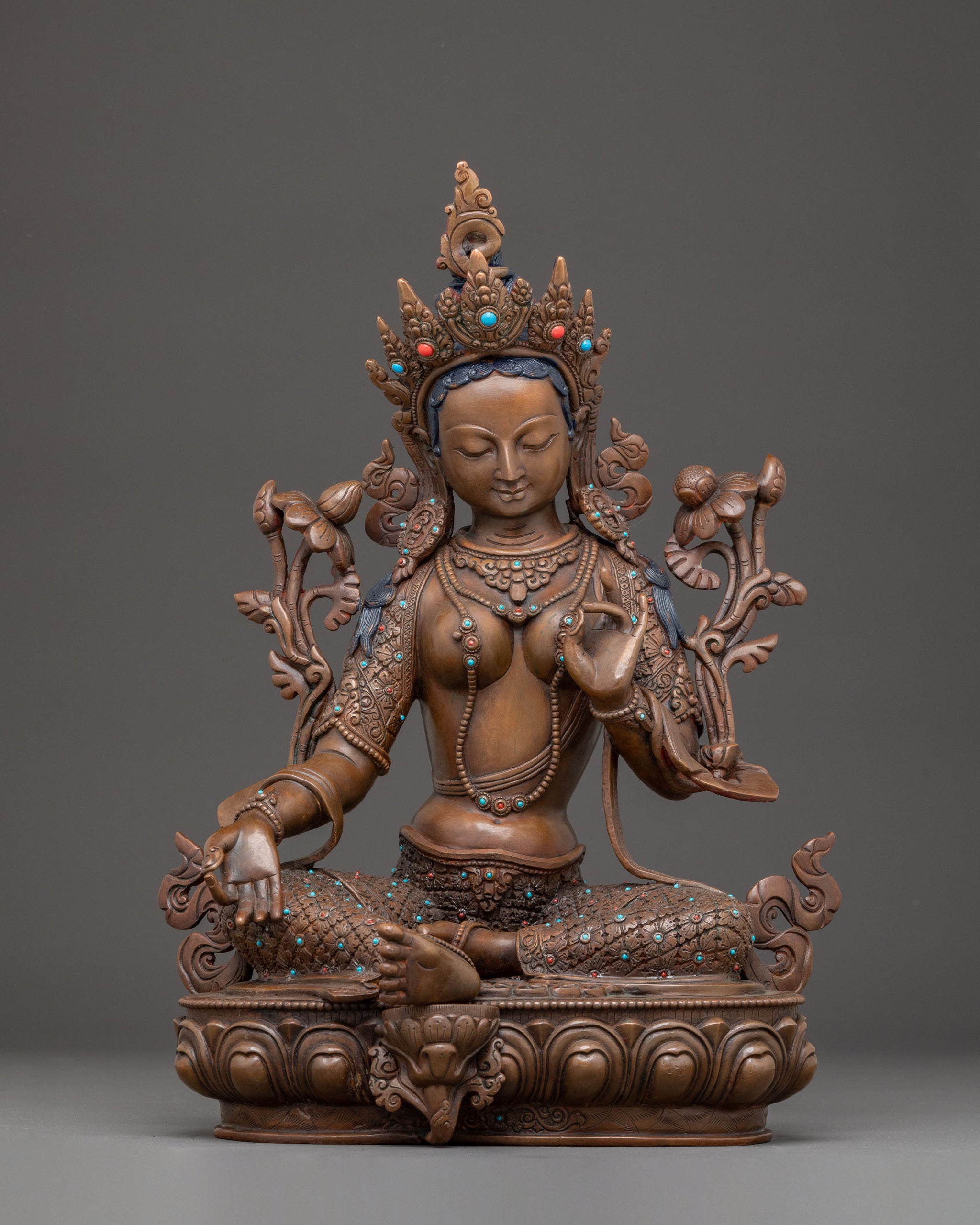 Mother Green Tara is depicted seated gracefully on a lotus throne, symbolizing purity and spiritual awakening. Her right leg is extended, showing readiness to help and compassion. She holds a lotus flower in her right hand, representing purity and enlightenment, while her left hand forms the Three Jewel Mudra, honoring the Buddha, Dharma, and Sangha. She also holds a lotus flower in her left hand, symbolizing continuous spiritual growth. Her green color signifies vitality, healing, and a deep connection to nature. Green Tara is adorned with elaborate jewelry and a crown, reflecting her divine beauty and enlightened presence. Her serene yet dynamic posture embodies her role as a compassionate protector and swift helper, offering comfort and guidance to all beings on their spiritual journey.