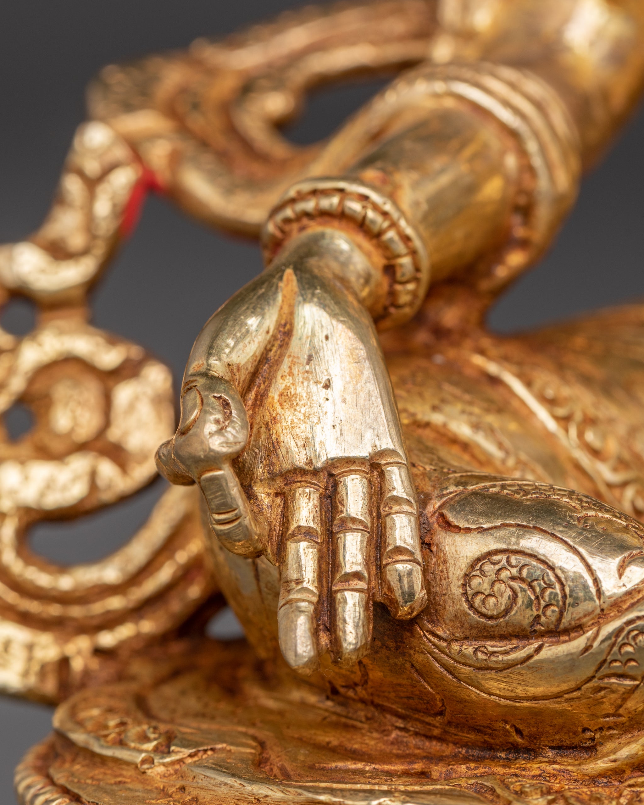 Green Tara is depicted seated in a relaxed yet ready position, with her right leg extended, symbolizing her willingness to take swift action for the benefit of all beings. She holds a lotus flower in her right hand, representing purity and spiritual awakening, while her left hand forms the Three Jewel Mudra, honoring the Buddha, Dharma, and Sangha, and also holds another lotus, signifying continuous spiritual growth. She is crowned with a five-pointed crown, symbolizing the Five Dhyani Buddhas, which represent the five aspects of transcendent wisdom. Resting upon a lotus pedestal, she embodies purity and enlightenment, radiating compassion and readiness to assist all who seek her help on their journey toward awakening.