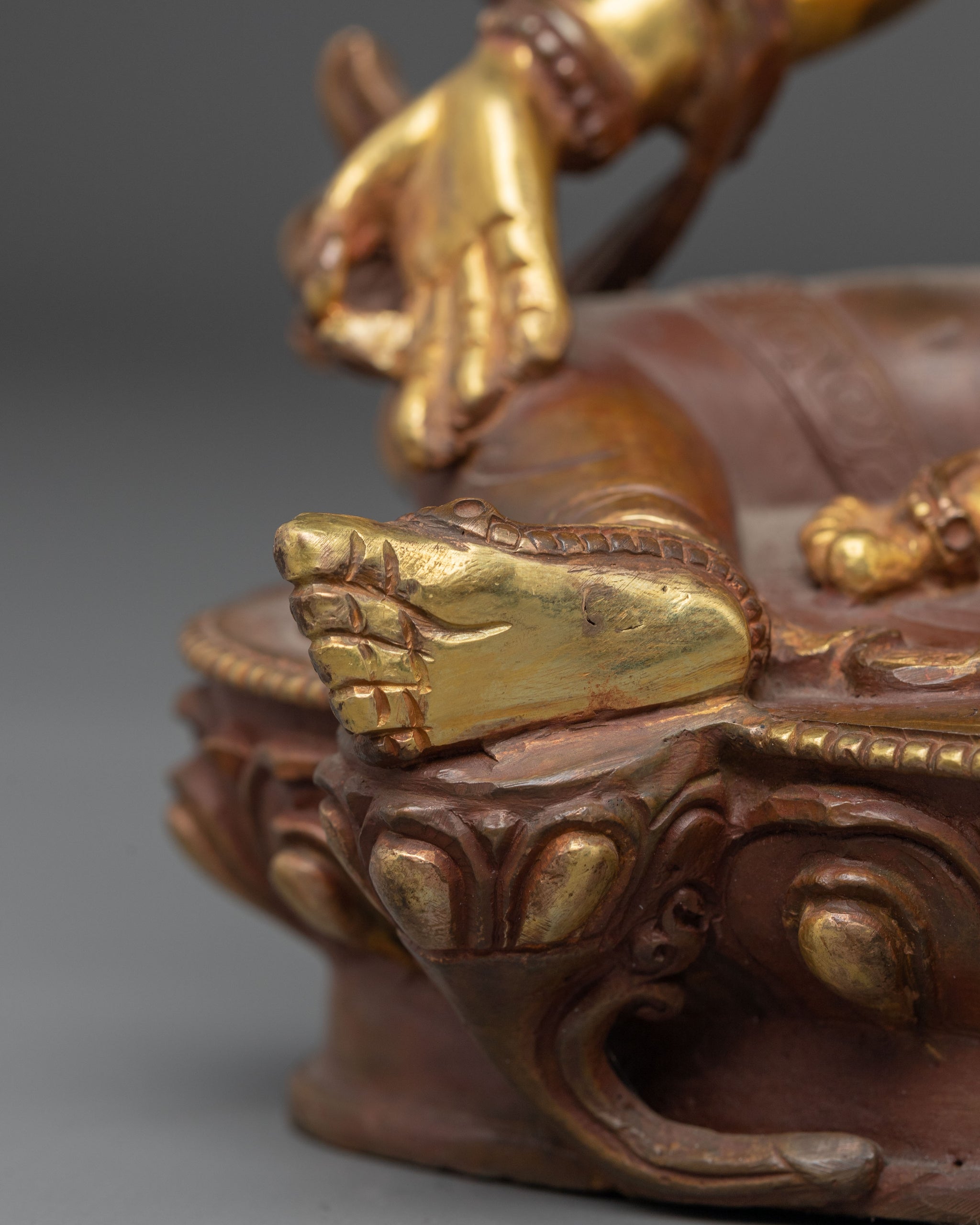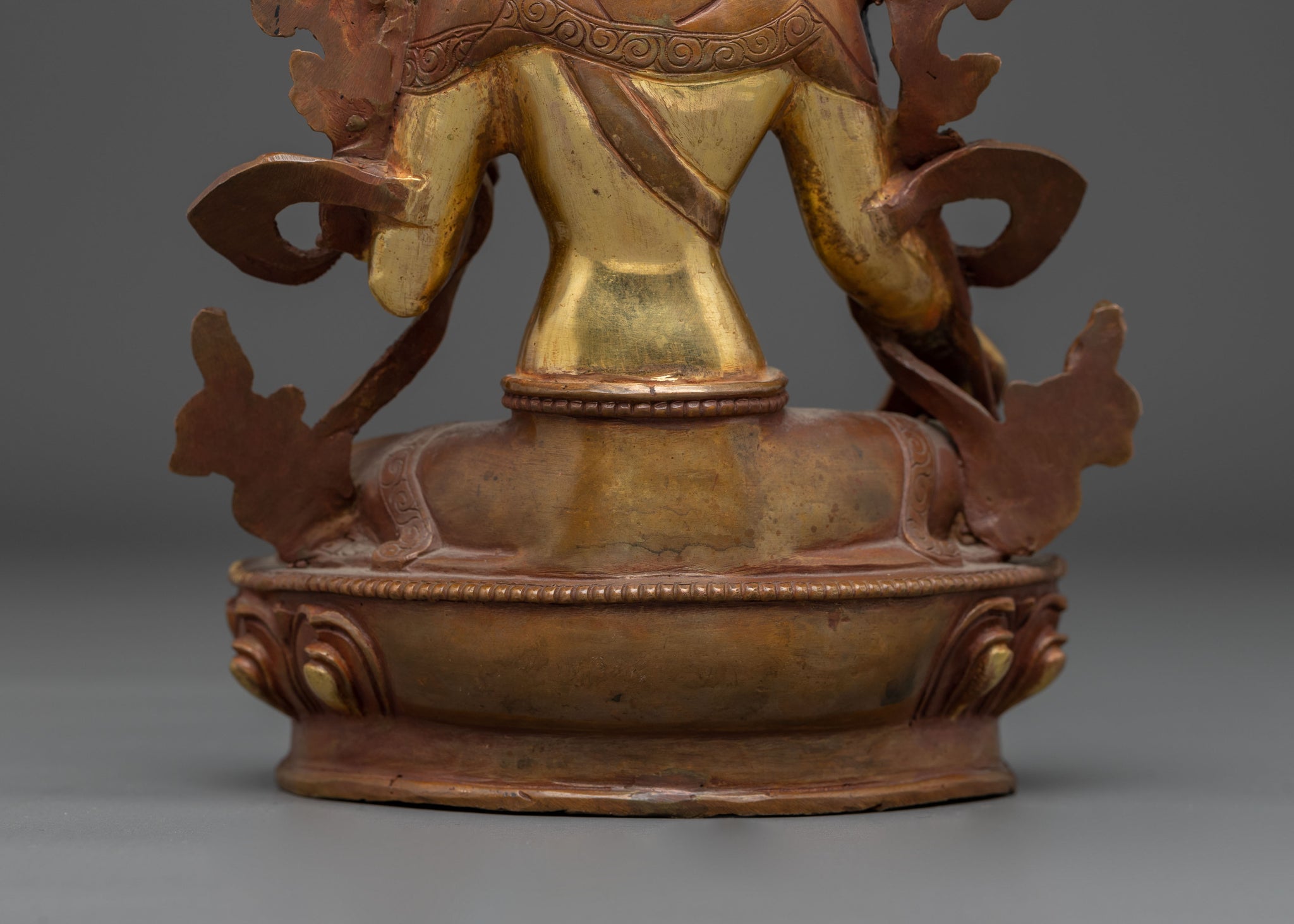 This Mother Green Tara Statue measures 8.8”/22.5cm (Height) x 5.9”/15cm (Base) and weighs 1.42 kg. Crafted from a copper body adorned with 24K gold gilding and detailed with gold and acrylic paintings, it reflects the exquisite skill of Nepali artisans. This piece is ideal for personal altars, meditation spaces, or as a meaningful spiritual decor item.