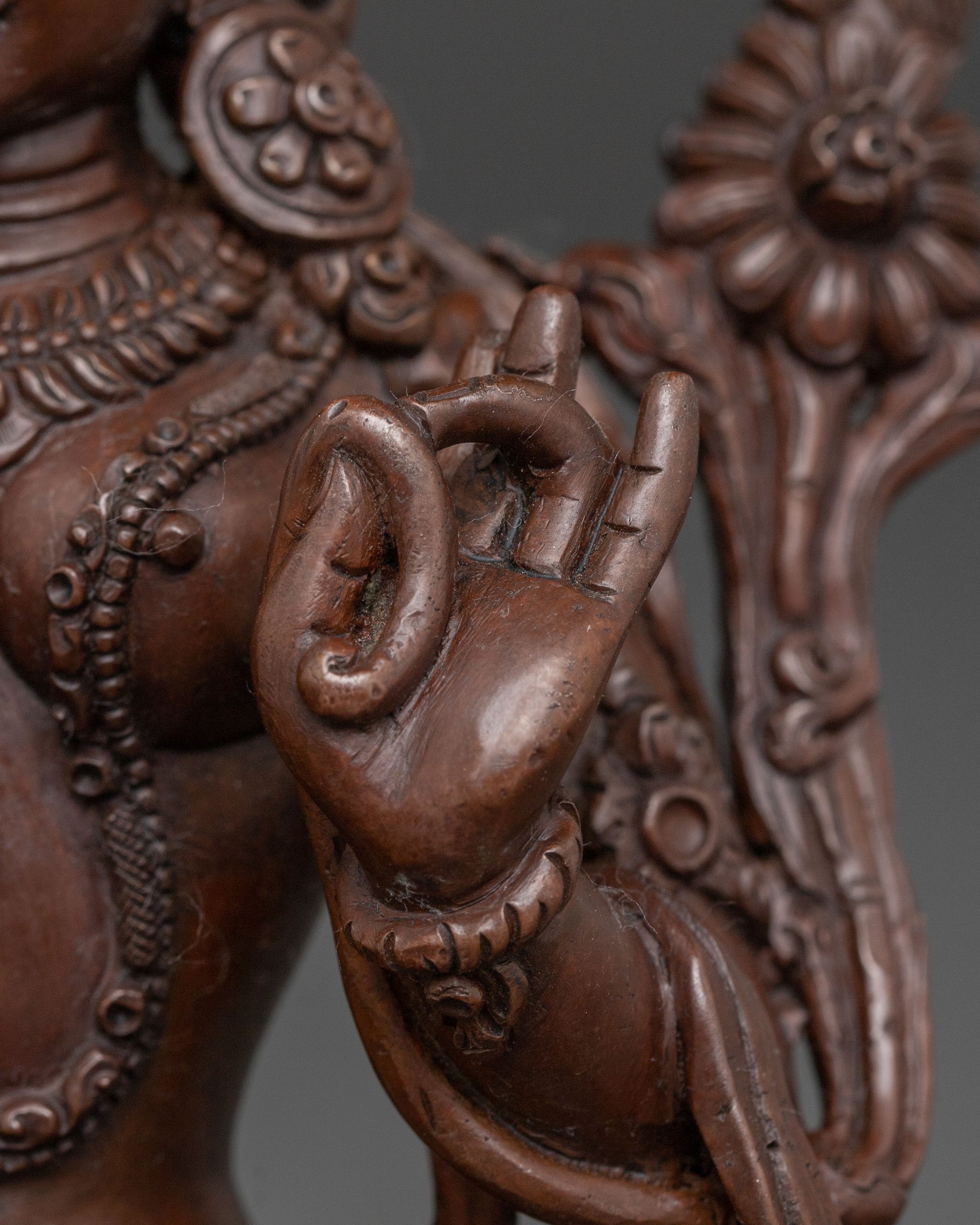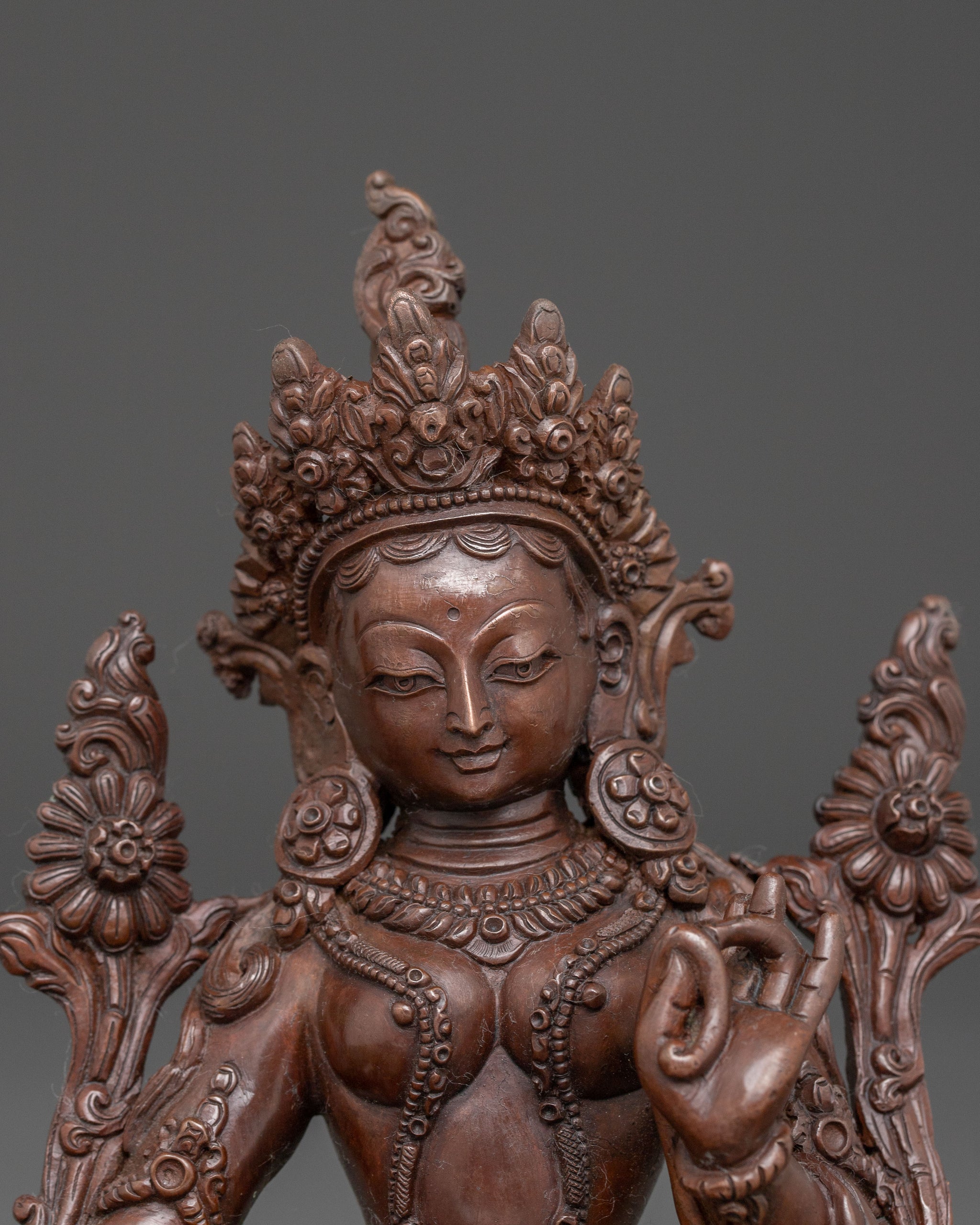 This handmade Mother Shyama Tara statue, also known as Green Tara, stands at 7.3”/18.5cm in height and 5.1”/13cm at the base, weighing 1.34 kg. Made from oxidized copper, it beautifully captures the serene yet powerful presence of Tara, the embodiment of compassion and protection. Expertly crafted by skilled artisans, this statue reflects traditional craftsmanship and makes a meaningful addition to altars, meditation spaces, or personal spiritual collections.