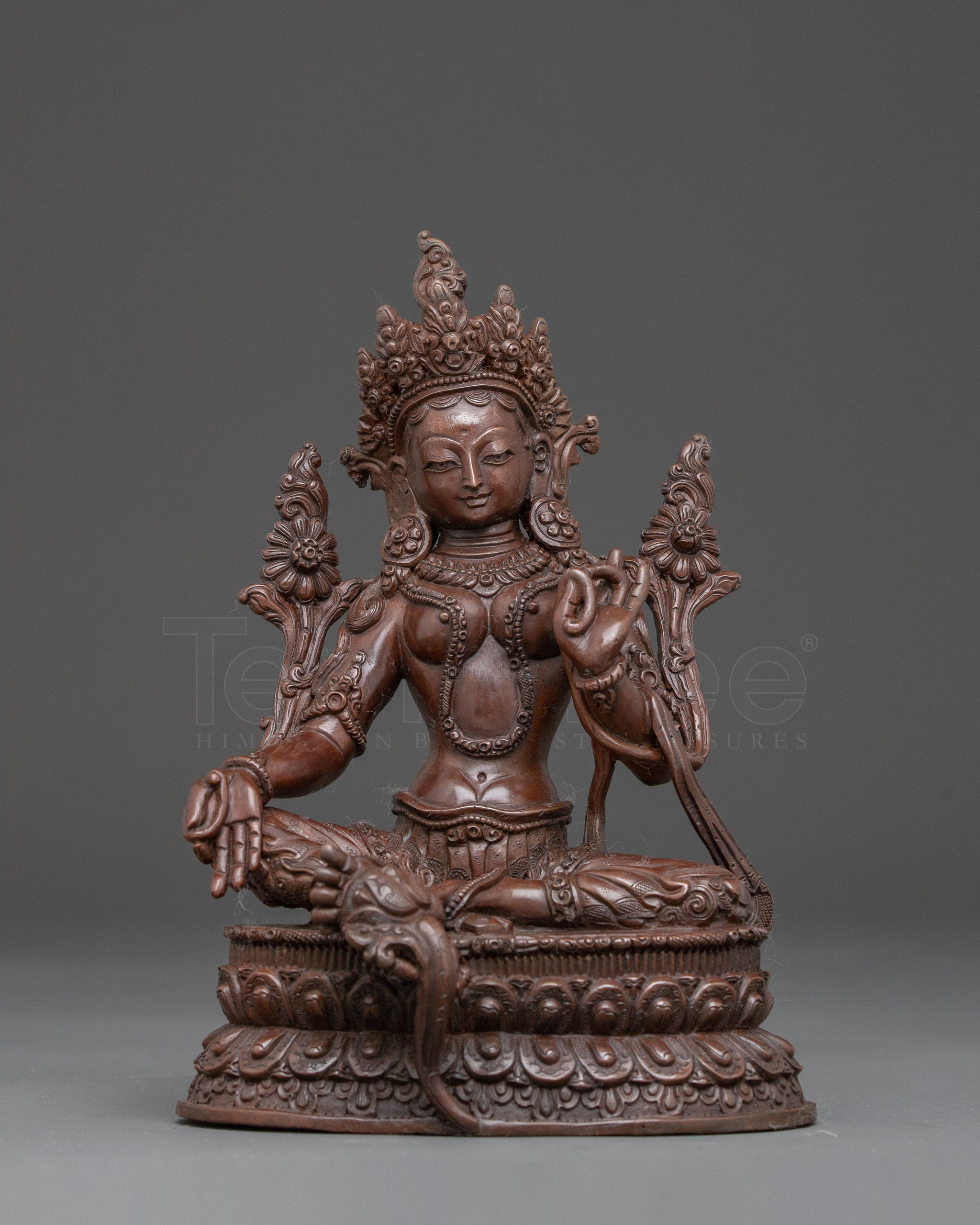 Green Tara sits gracefully upon a blooming lotus throne, symbolizing purity and spiritual awakening. Her right leg extends forward, ready to step into the world and offer aid, while her left leg remains folded in meditative stillness. She holds a blossoming lotus in both hands, embracing tranquility and the blossoming of enlightenment. Her right hand reaches out in the gesture of giving, offering blessings and compassion to all beings. At the same time, her left hand gently holds a blue utpala flower, a symbol of purity and protection. Adorned with a five-pointed crown representing the Five Dhyani Buddhas and elegant ornaments, she radiates divine wisdom and beauty.