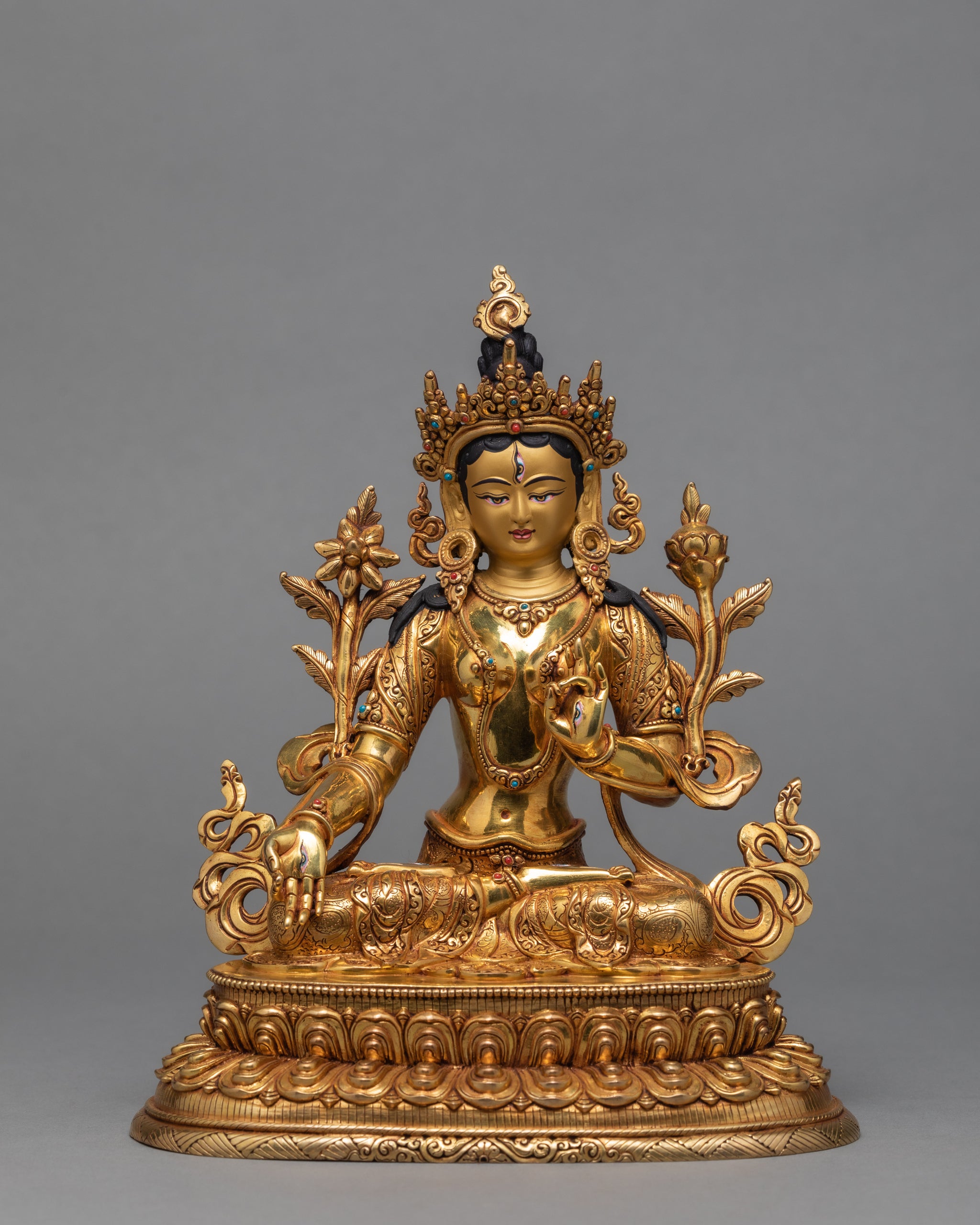 The goddess Mother White Tara statue is depicted sitting cross-legged on a lotus seat. In the Buddhist tradition, this statue is hand-carved and made with pure 24K Gold. In the Buddhist belief, she is a female Buddha who has appeared as a female bodhisattva and goddess for the benefit of all living beings. According to tradition, she was created from Avalokiteshvara's tear that dropped to the earth and formed a lake. A lotus blossomed from its waters, and when it was opened, the goddess was unveiled.