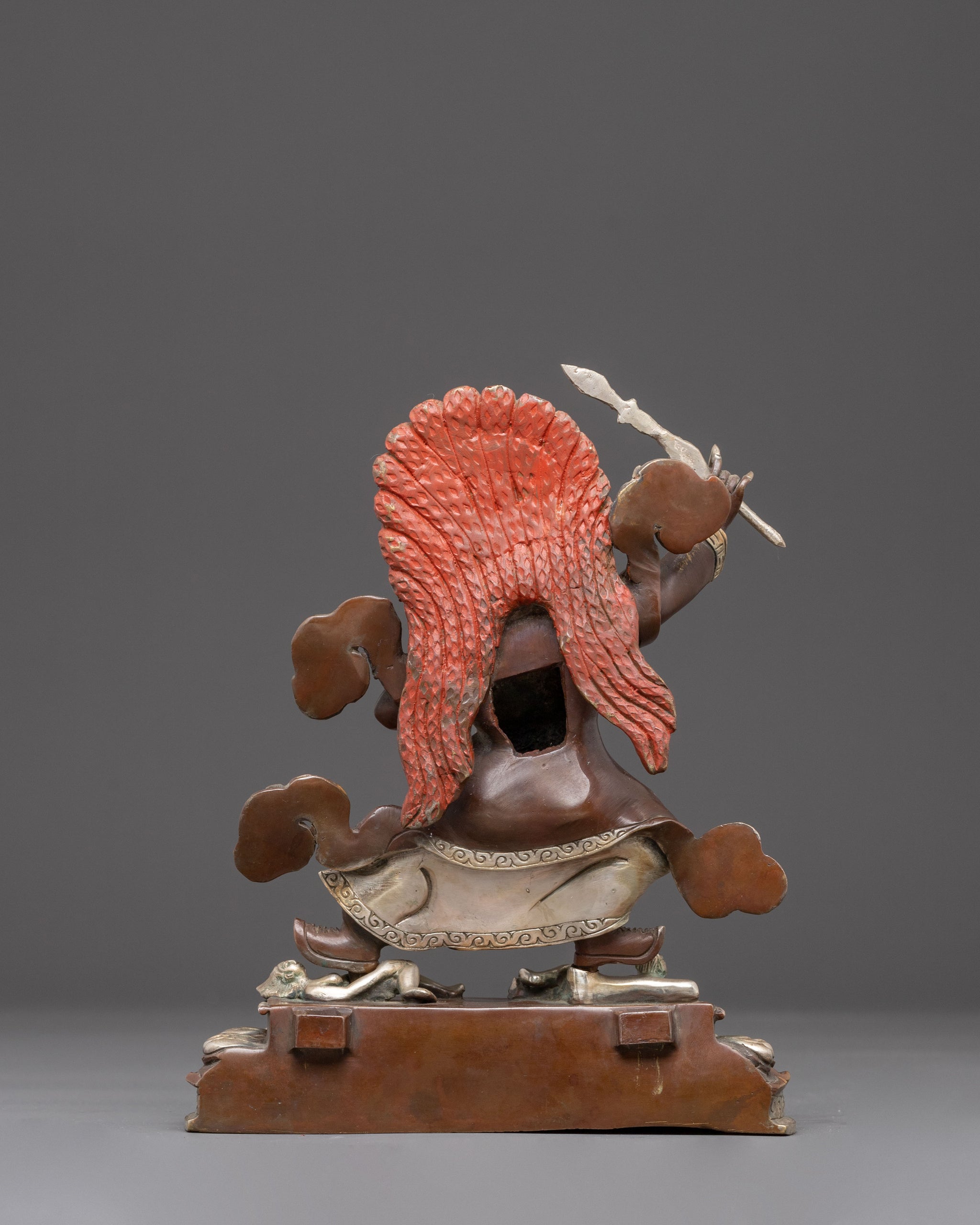 This handmade Naga Mahakala statue stands at 9.4”/24cm in height and 7.1”/18cm at the base, weighing 2.35 kg. Expertly crafted from oxidized copper, it is adorned with silver plating and deeply engraved with detailed carvings that produce a magnificent 3D-like effect. Reflecting traditional craftsmanship, this statue embodies both artistic excellence and spiritual significance, making it a powerful centerpiece for any altar or meditation space.