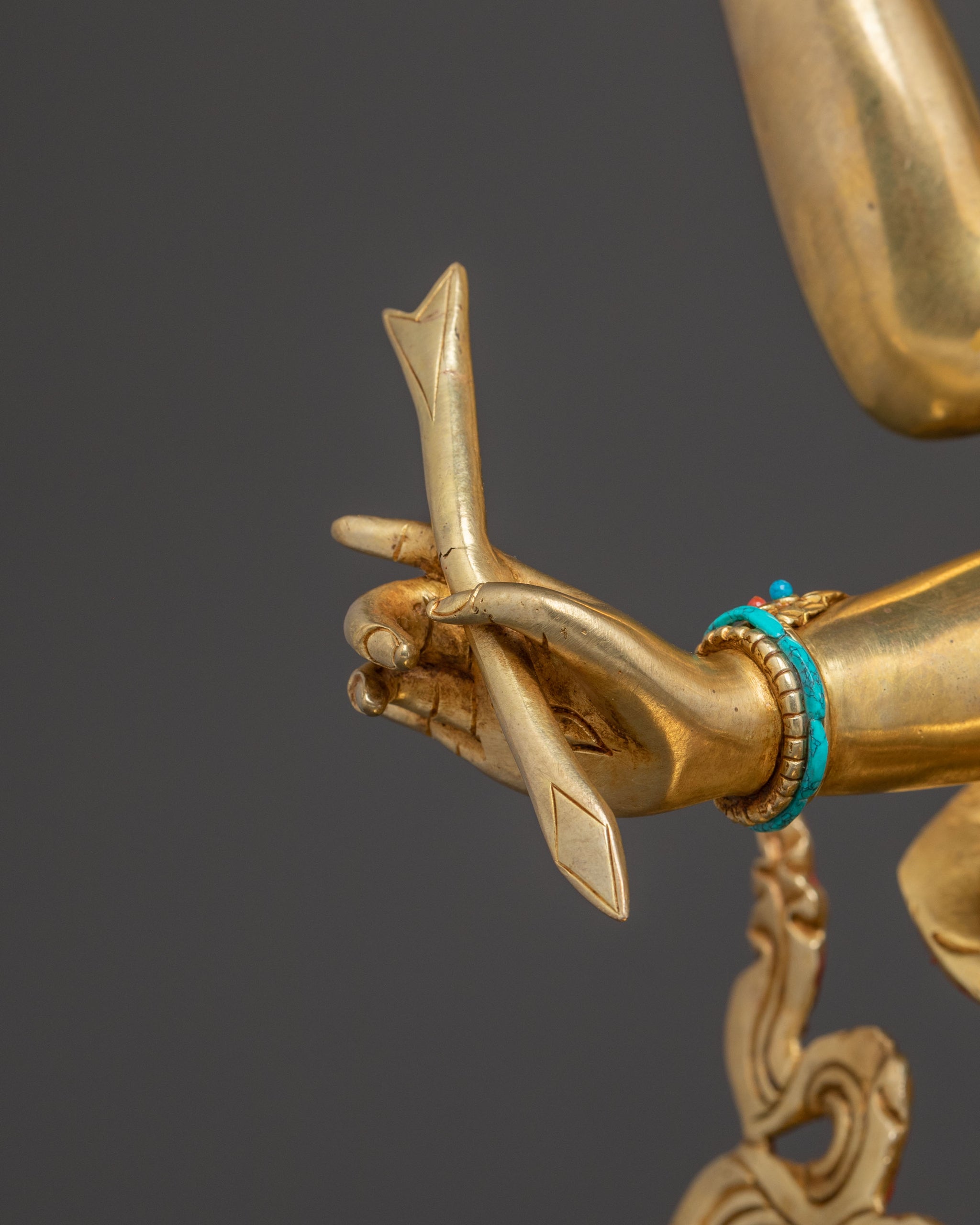 From the heart of Nepal's artisan tradition comes a magnificent Namgyalma divine statue, exquisitely crafted from pure copper and gilded in 24K gold. This 48.5 cm (19.09”) representation of Ushnishavijaya radiates serene spiritual grace, covered with a triple layer of 24K gold gilding and carved with deeply engraved carvings that produce a magnificent 3D-like effect. Enhanced by fine acrylic paintings and gemstone detailing, it possesses a solid presence at 10.67 kg and a 40 cm (15.75”) base, bringing beauty, blessing, and tranquility to any sacred space.
