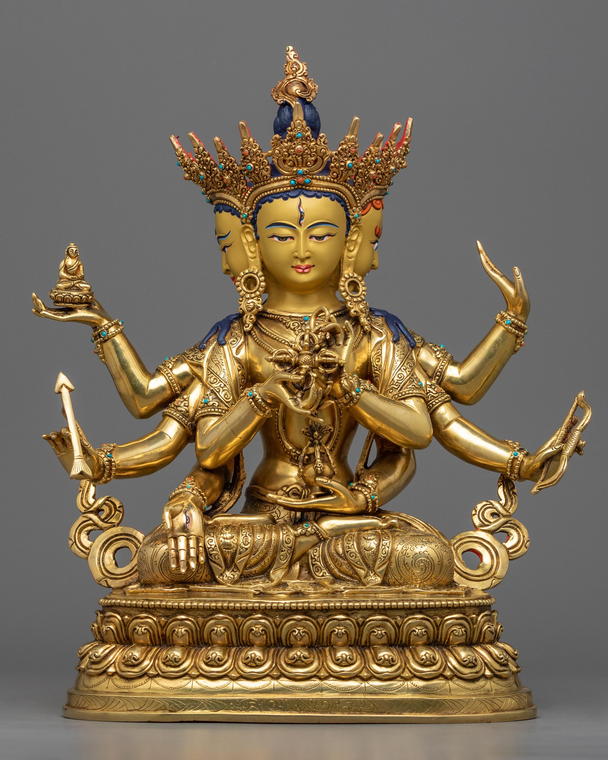 We have masterfully hand-carved the Namgyalma Mantra Practice statue in the traditional Himalayan style. Crafted from a copper body and gilded with 24k genuine gold, which highlights the intricate design patterns of the statue. The three Buddhas—past, present, and future—are said to be represented by Namgyalma. Three faces are used to symbolize the deity: a peaceful face, a semi-wrathful face, and a wrathful face. These faces indicate the deity's associations with protection, long life, and cleansing, respectively. The deity's eight hands are holding various items that are symbolic of her divine powers. It is a beautiful piece made by our artists after months of hard work, and the addition of jewels to the statue only beautifies the statue more.