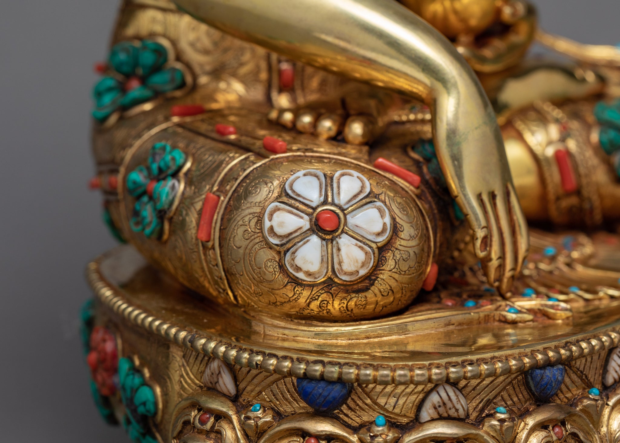 The historical Buddha and the creator of Buddhist philosophy is Shakyamuni Buddha, often known as "the Buddha." Each "Kalpa" (Buddhist eon) is said to have its own Buddha, whose teachings are considered to vanish when the next Buddha appears. He depicts on atop a moon disc lotus seat, holding a begging bowl in his left hand. Similarly, his right hand is in earth touching mudra.