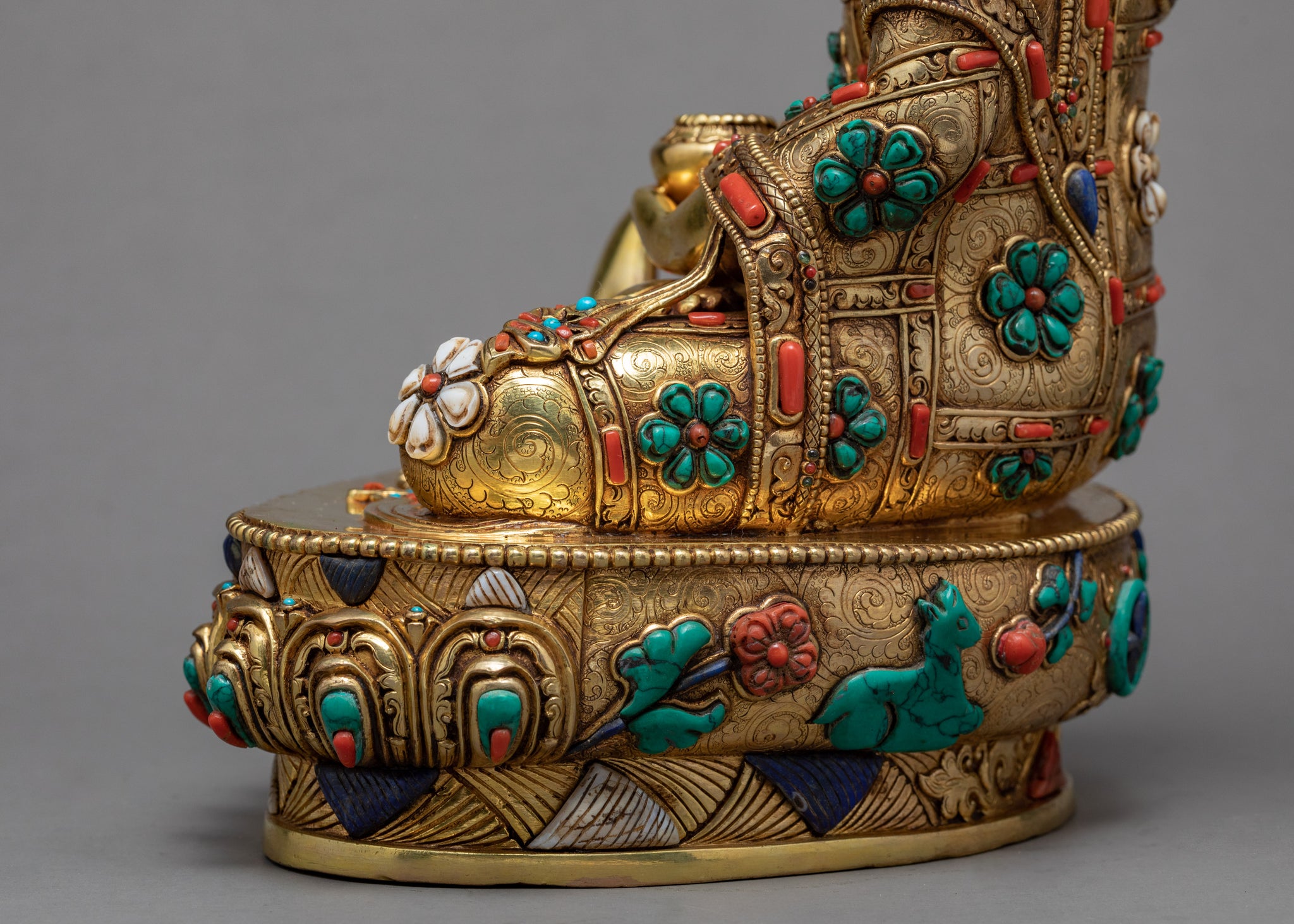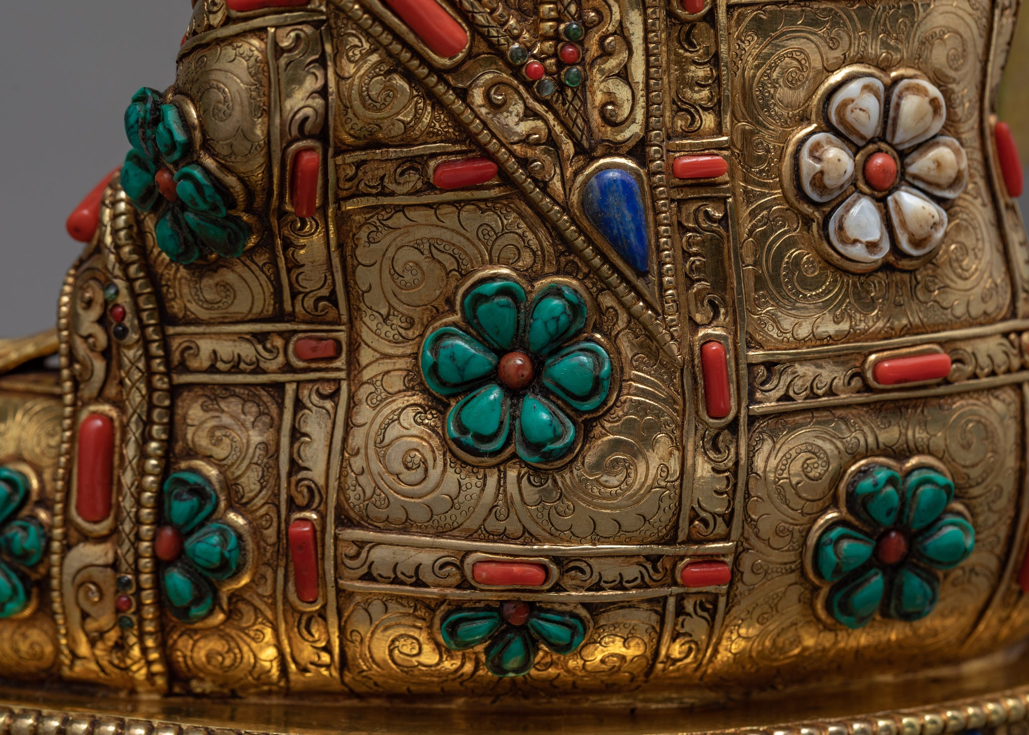 Namo Shakyamuni Buddha, seated atop a moon disc lotus seat, is shown in this statue which is hand carved in Kathmandu. The artistically crafted floral motifs on his robe, as well as the colorful lotus petals, have added to the statue's attractiveness. The exquisitely carved elongated earlobes represent a willful rejection of the material world in favor of spiritual enlightenment. The Ushnisha above the head is entirely handcrafted by the artist, and it represents Buddha's wisdom.