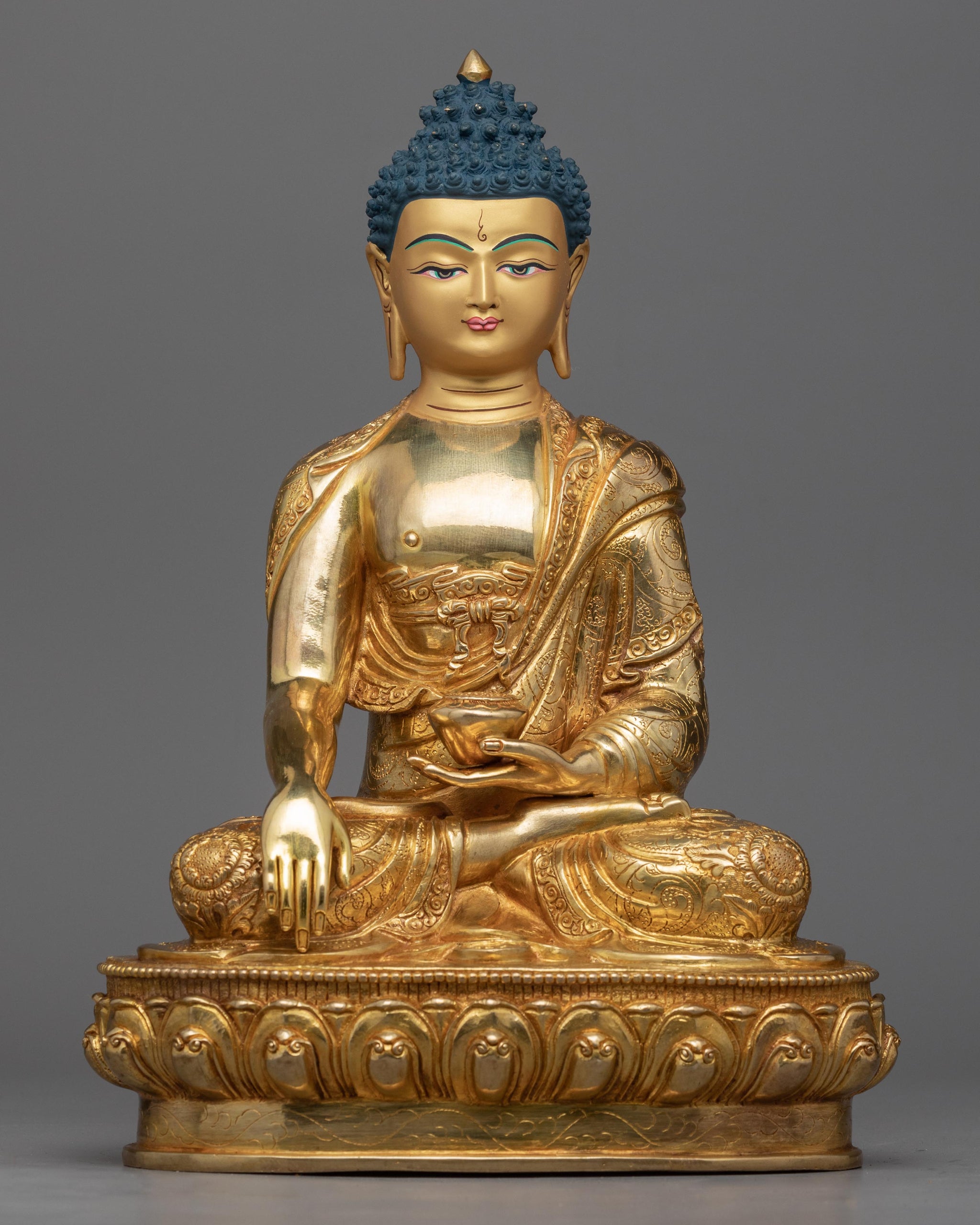 The Namo Shakyamuni Buddha statue is an intricately handcrafted piece produced in our studio and designed with unique Nepali motifs. Carved out of copper, the statue was gilded in genuine 24K gold for the sheen and highlighted with acrylic colors. Shakyamuni Buddha, in the statue, is depicted seated atop a moon disc lotus seat with an alms bowl over his lap on his right hand with his characteristic calm and peaceful appearance. He forms the 'Bhumisparsa Mudra' with his left hand, representing one of the most important moments of Buddha's life, i.e., when the Buddha achieved enlightenment as he claimed the earth as his witness for it.