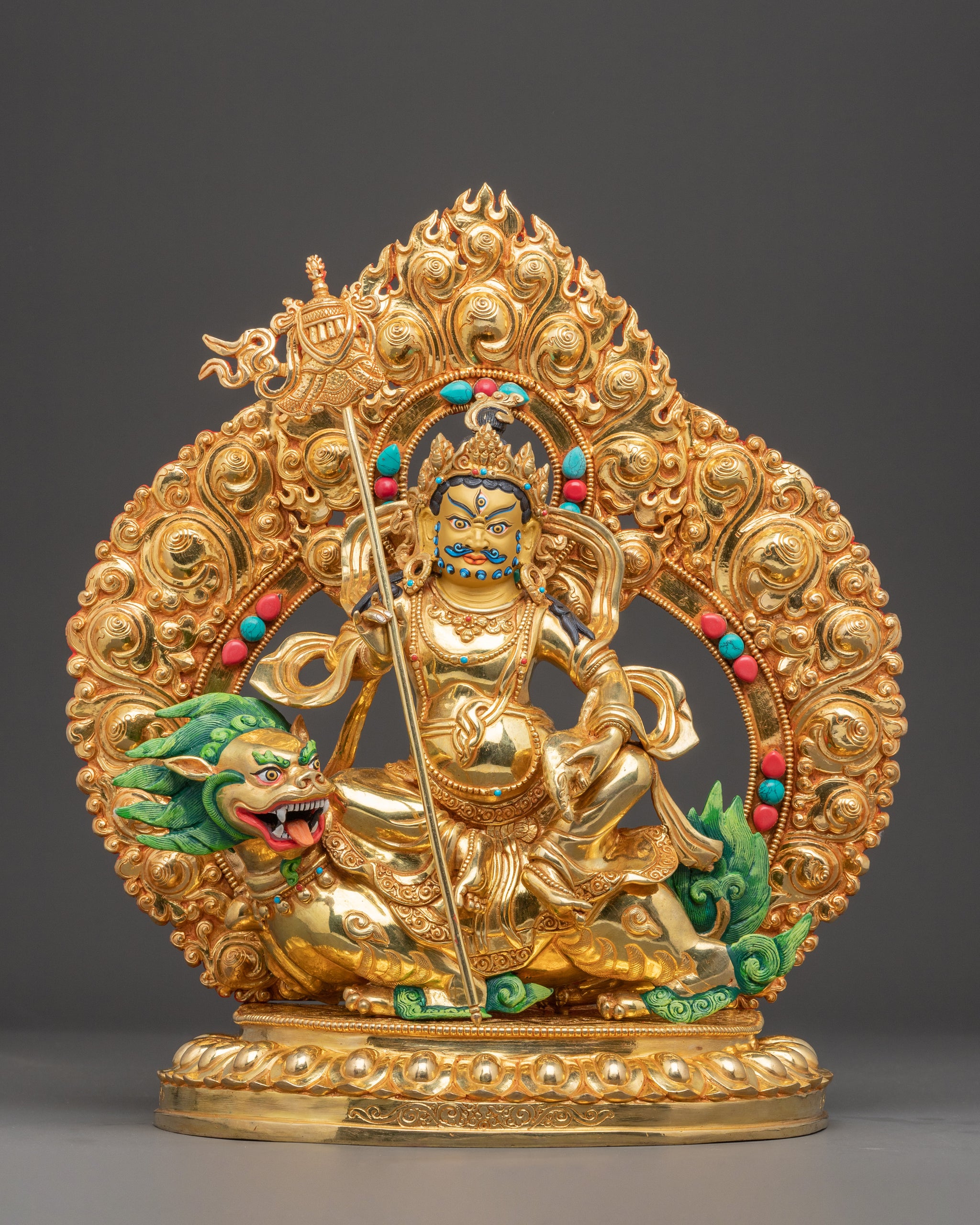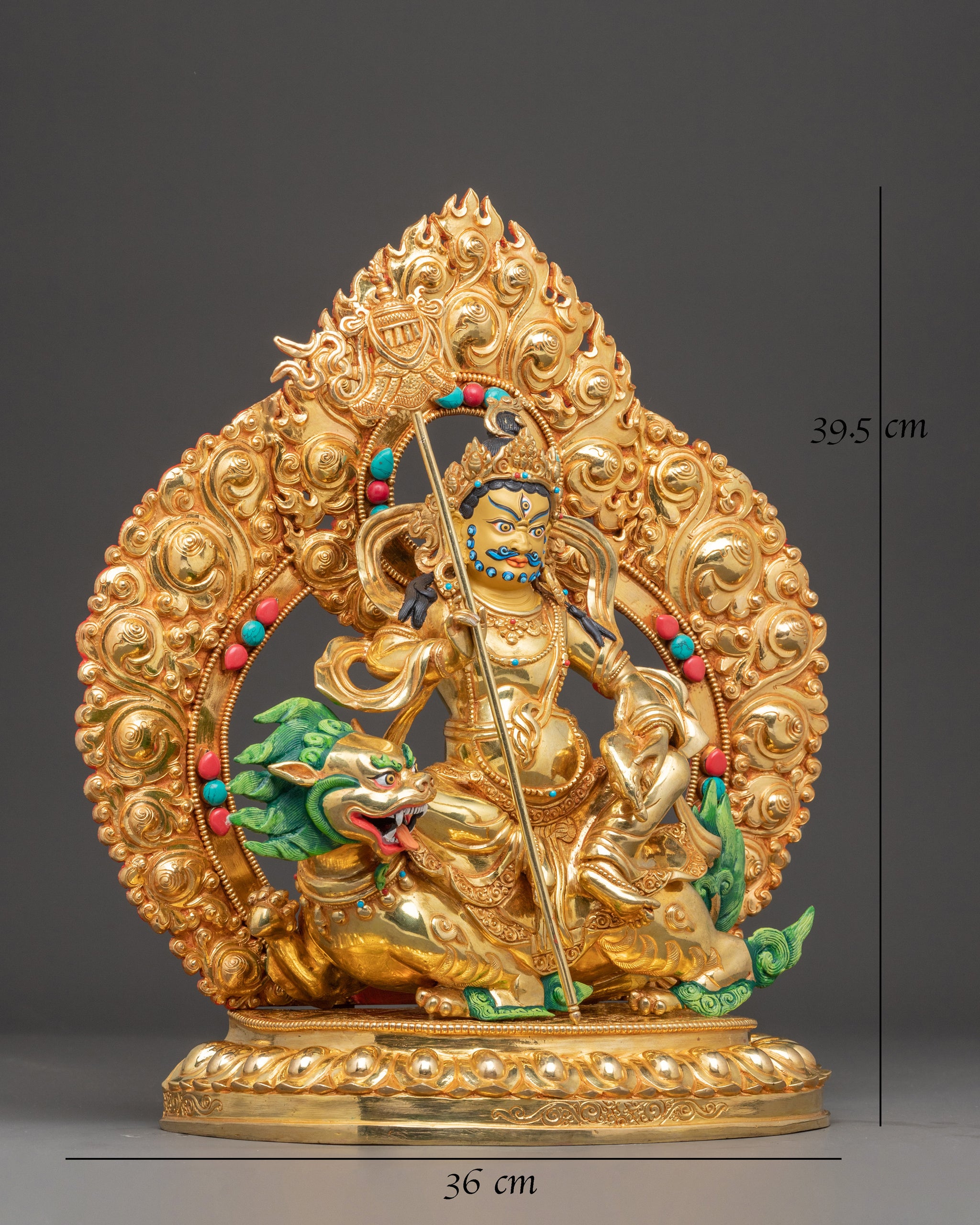 This handmade Namtoshe Art in 24K gold gilding represents the furious guardian of the Dharma, a powerful emblem of strength and spiritual might. The sculpture, which measures 15.6" (Height) x 14.2" (Base) and weighs 6.78 kg, is made of copper and has a durable and sacred appearance. It is carefully gilded in 24K gold, enhancing its heavenly appeal. The acrylic paints and gemstone embellishments provide a touch of vibrancy and holiness, underlining the deity's heavenly status.