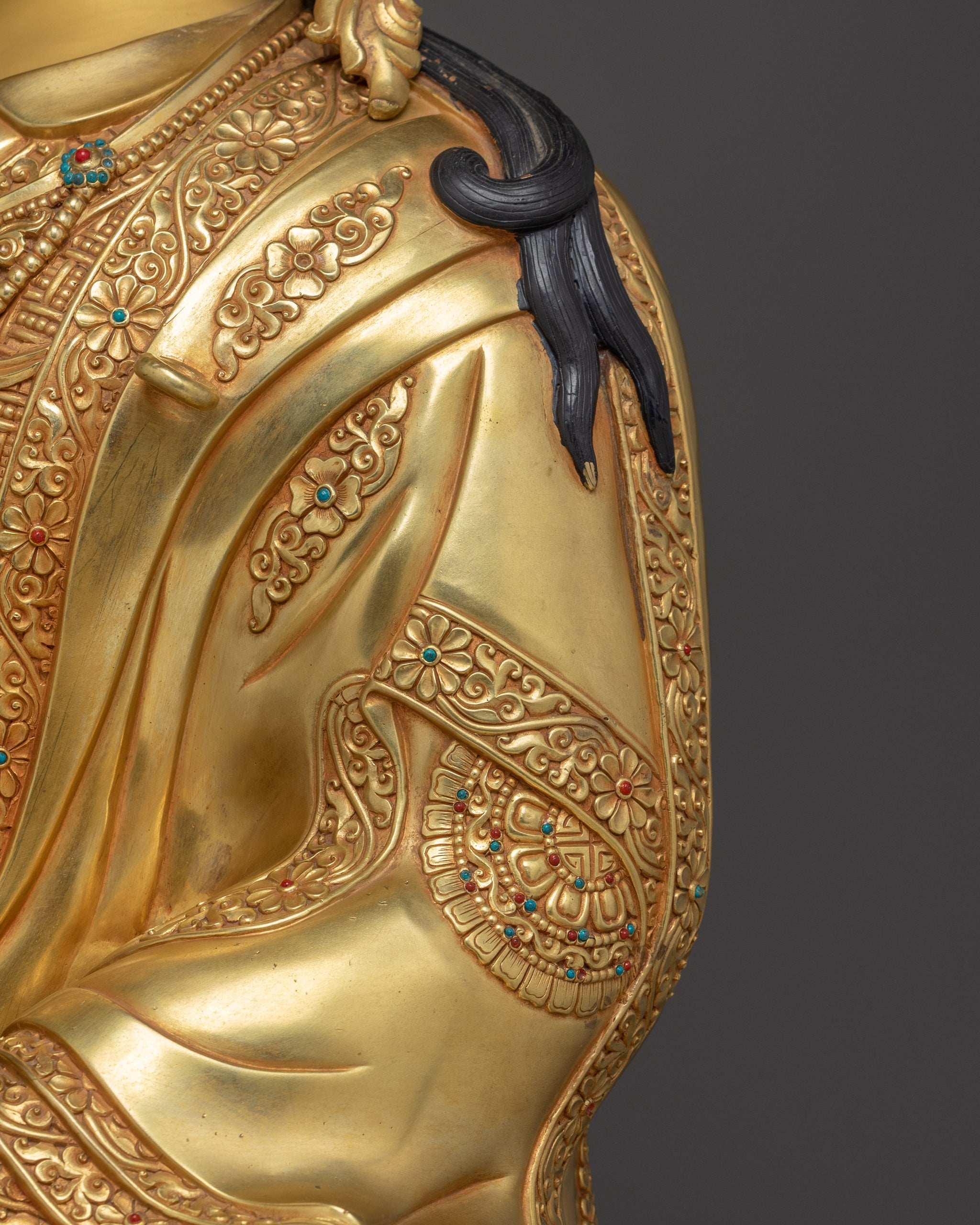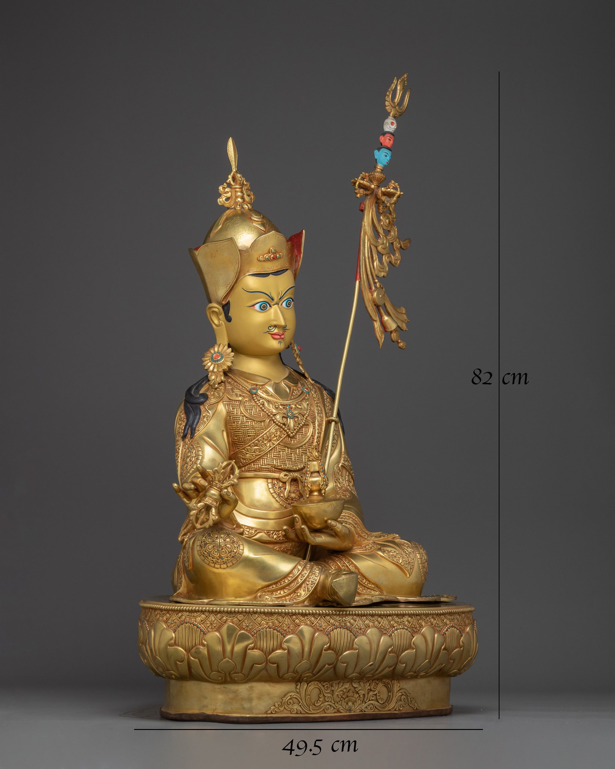 The Nepalese Handmade Guru Rinpoche Artwork, also known as Padmasambhava, the founder of Tibetan Buddhism, represents enlightenment, compassion, and spiritual mastery. This handcrafted statue is 32.3" (Height) x 19.5" (Base) and weighs 29.70 kg. It is made of copper, adorned with 24K gold gilding, and enhanced with detailed gold and acrylic paints. Created by expert Nepalese artisans, it represents Himalayan Buddhism's holy traditions, making it an appealing addition to altars, meditation places, or sacred collections.
