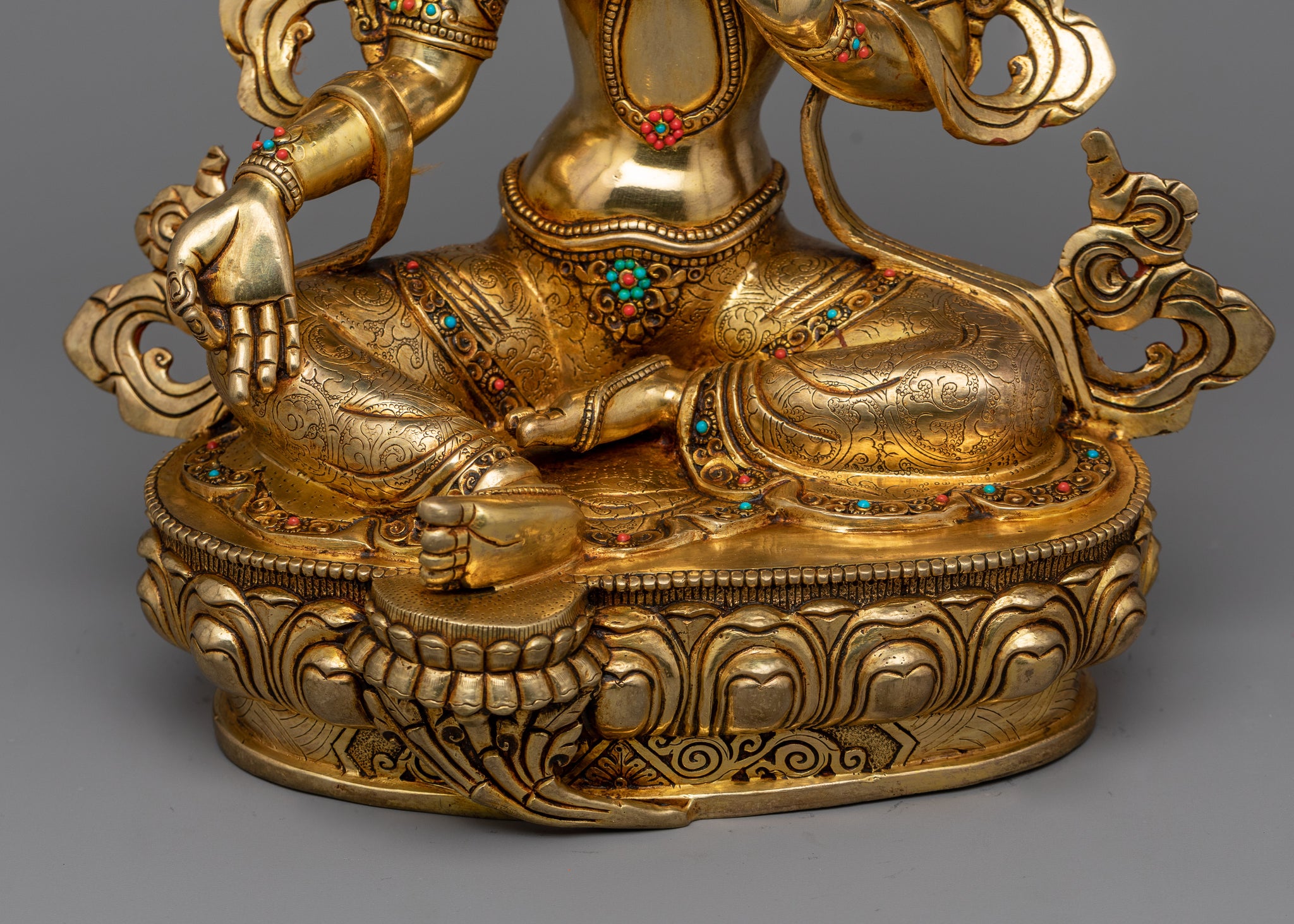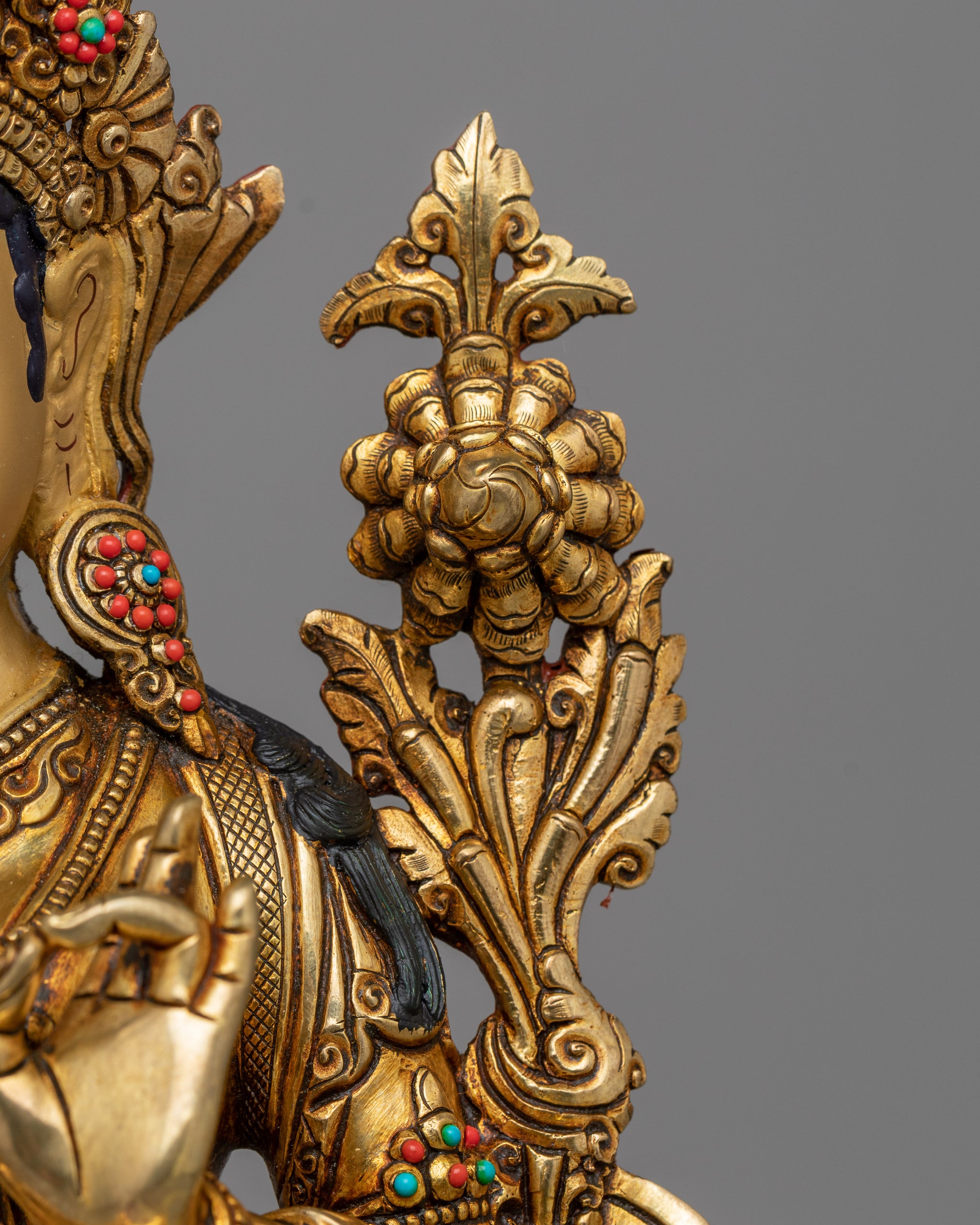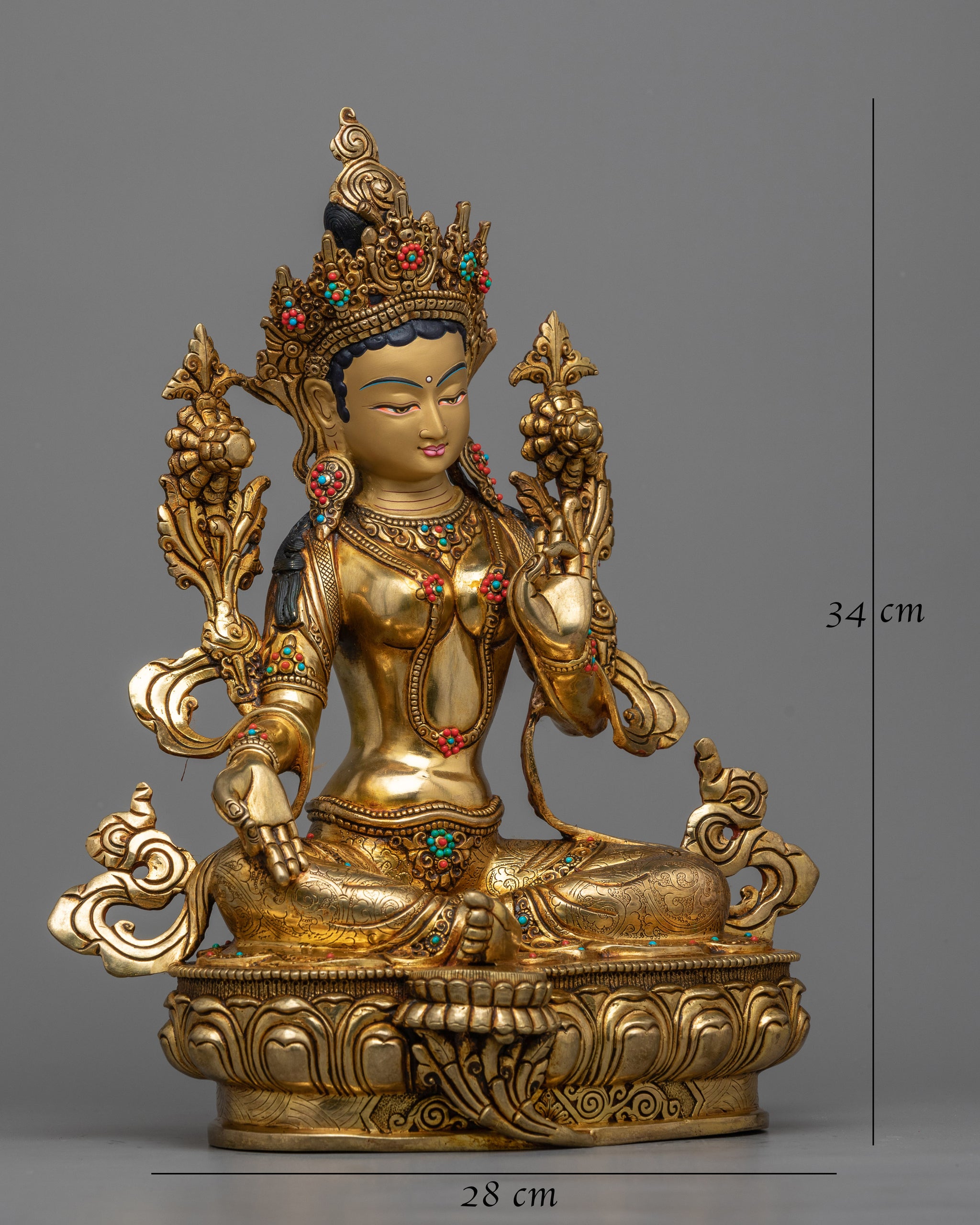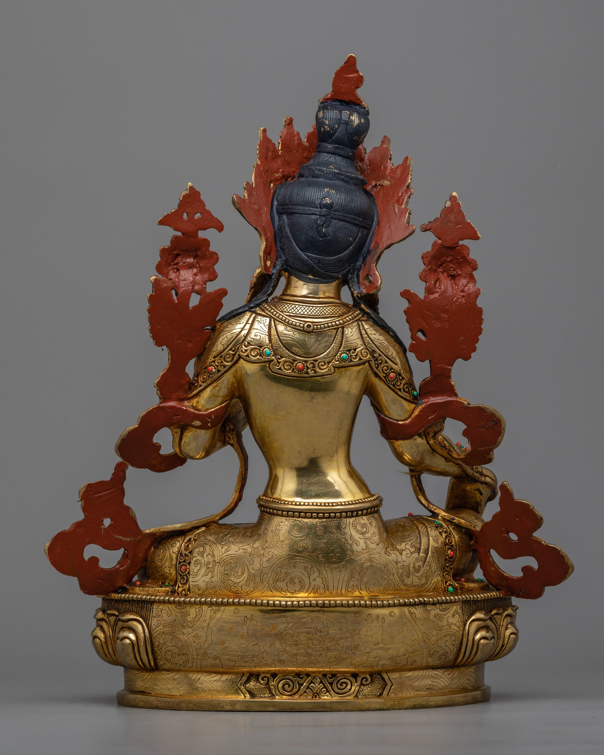 The Noble Shyamatara Statue is a creation of art that will enhance your spiritual practice by fusing fine craftsmanship with spiritual splendor. Crafted with exquisite care by skilled artisans, every little detail captures the amazing brilliance of Green tara. It is a piece of unparalleled beauty and artistry, adorned with paintings in both gold and acrylic, hand-carved gemstones, and 24K gold gilding. You are invited to immerse yourself in its divine essence by each and every detail, which showcases the skill and dedication of the creators through delicate curves and exquisite forms. Allow this sacred artwork to deepen your relationship with Arya Tara and advance your spiritual growth to unprecedented levels.