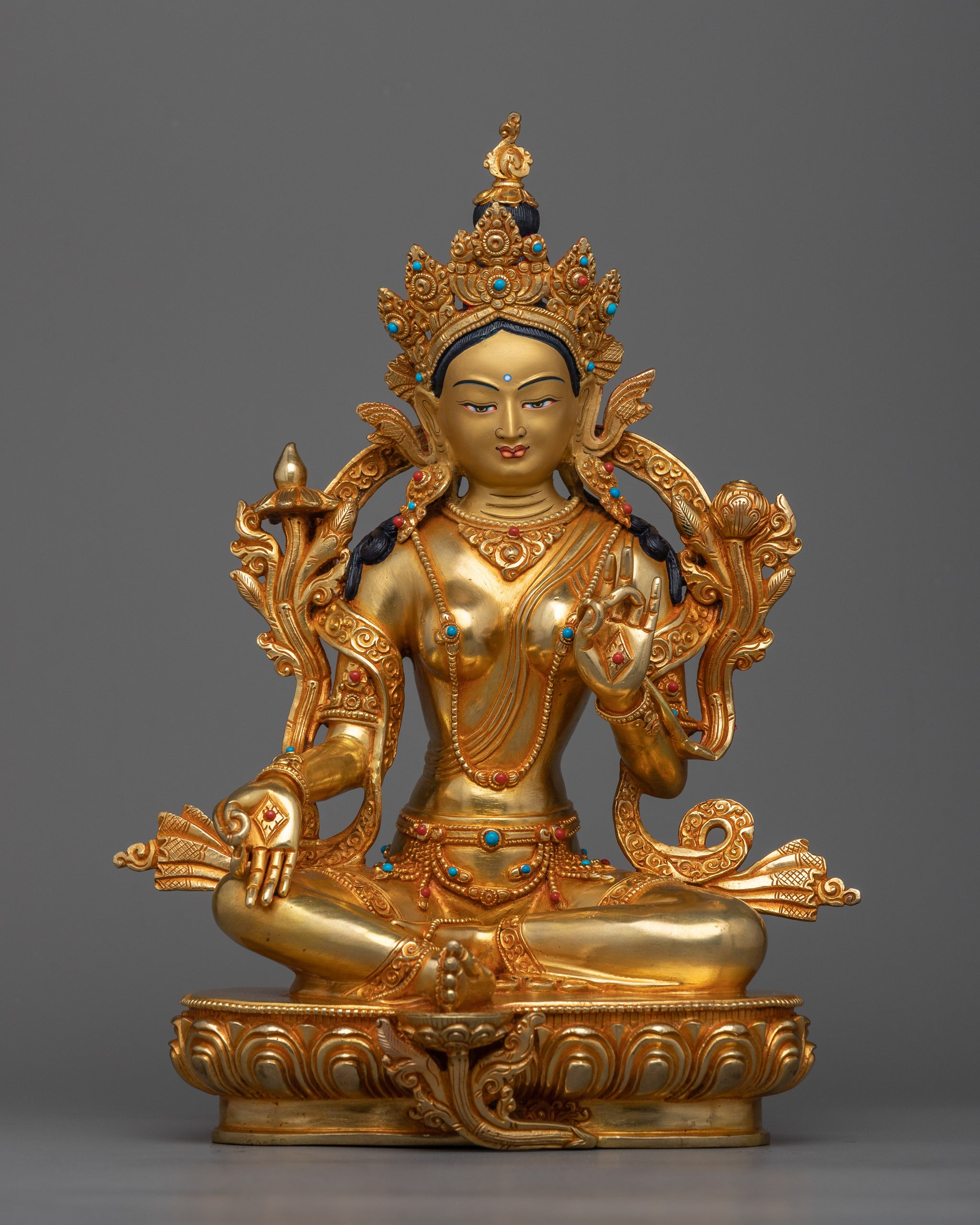 This sculpture, made of sturdy copper, exemplifies the long legacy of Buddhist workmanship. The statue is beautifully gilded with 24K gold, which gives it a bright brilliance that represents Green Tara's divine essence and the purity of her compassion. The gold finish not only improves the statue's outward appeal, but also lifts it to the level of spiritual grace and elegance.