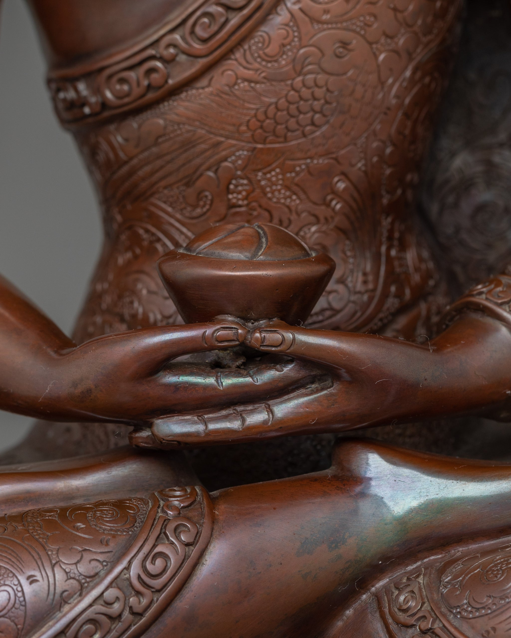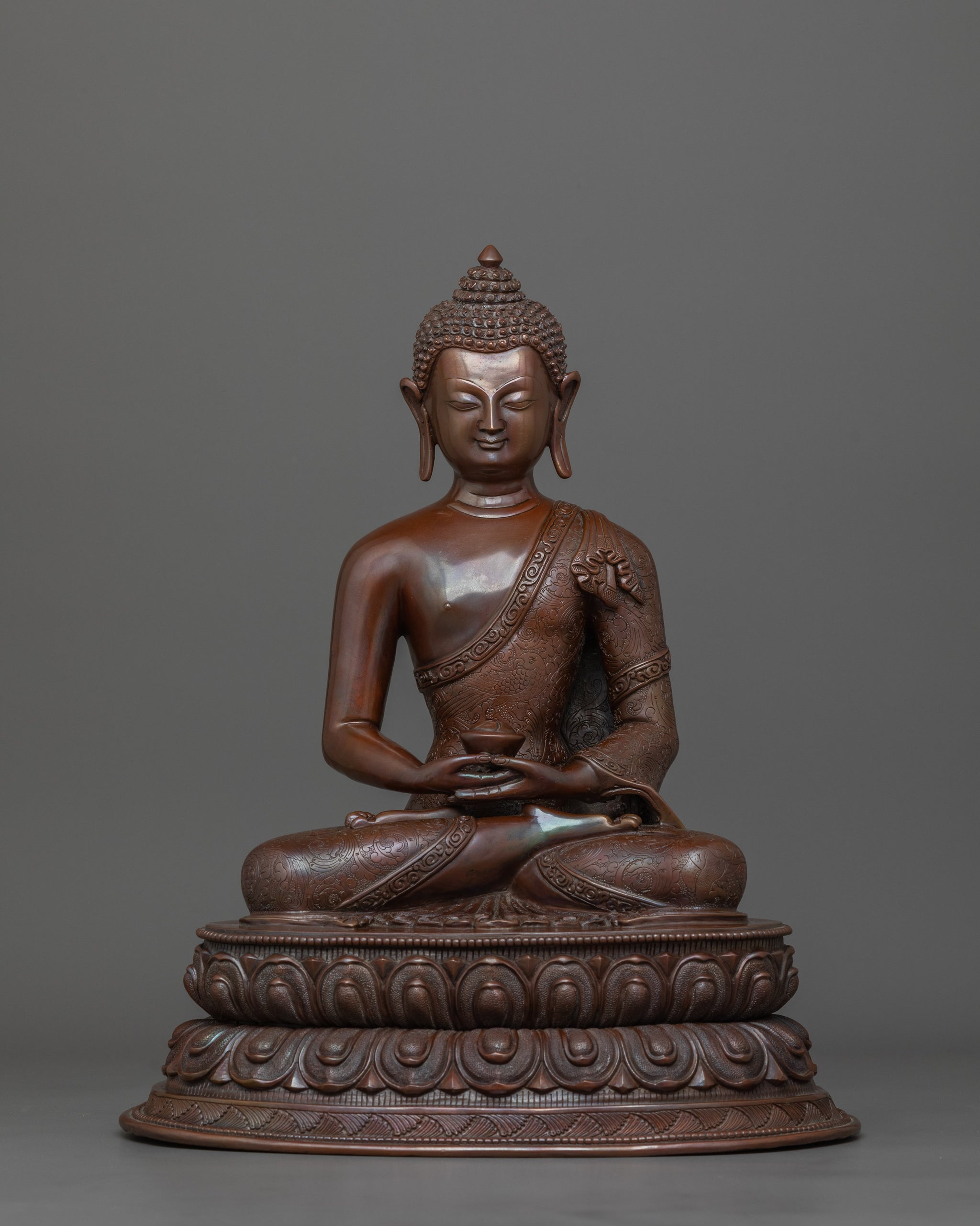 Amitabha is shown in a tranquil sitting stance, holding an alms bowl in his lap to symbolize renunciation and the simplicity of the enlightened life. His peaceful countenance represents the knowledge and compassion he bestows on individuals seeking rebirth in his Pure Land; Amitabha's dedication to assisting all creatures in achieving spiritual awareness and freedom is demonstrated by this gesture.