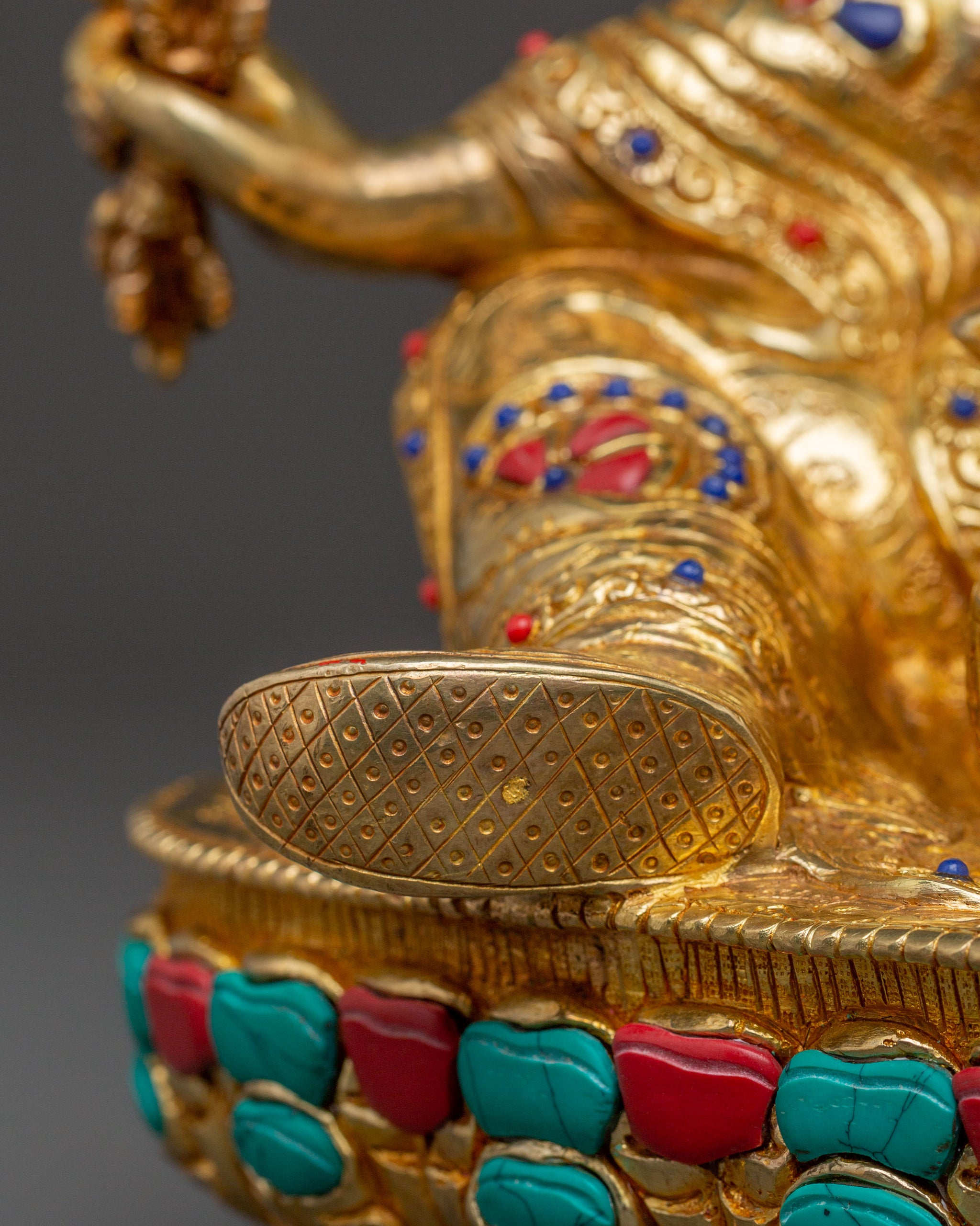 The masterful artistry of Nepal shines through every detail of this handcrafted treasure. A radiant 3-layer 24K gold gilding envelops the copper body, reflecting light and devotion. Intricate repoussé and chasing techniques bring his robes and attributes to life, while carefully hand-carved gemstones and vibrant acrylic paintings add depth and sacred adornment. This meticulous process ensures not only a beautiful piece of Himalayan craftsmanship but a durable heirloom for generations.
