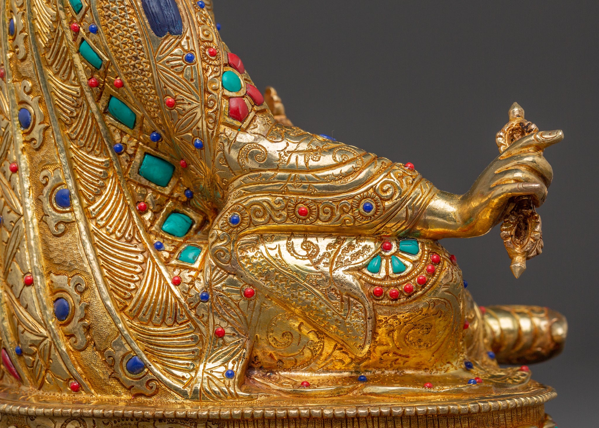 Enhance your space with this majestic Padmasambhava Enlightened Guide statue, which stands 36cm (14.17 inches) tall and has a 24cm (9.45 inches) base, radiating a deep spiritual presence. Weighing 3.89kg, it is made from a sturdy copper body and decorated with 24K gold gilding, acrylic paintings, gemstones, and hand-carved gemstones. This deity captures the essence of Vajrayana Buddhism, providing a substantial, grounded, and inspiring focal point for any devotee or collector of Buddhist art.