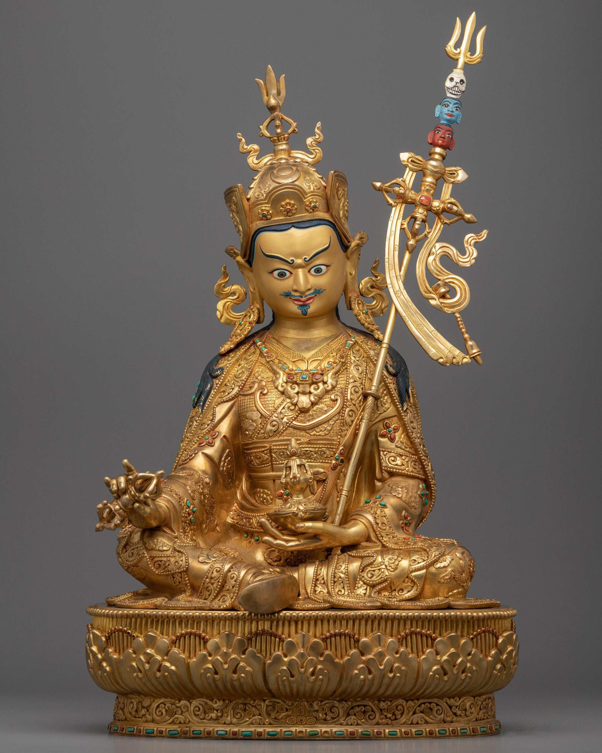 This exquisite piece of Padmasambhava Guru Rinpoche statue employs traditional Himalayan motifs and designs delicately produced in our studio. The statue's copper body is gilded in gold, giving it its sheen and brilliance. The Lotus-Born is majestically seated atop a moon disc lotus seat holding a vajra in his left hand and a skull vase with a jar of immortality in his left. He holds the Khatvanga trident, his celestial ally of bliss and emptiness, in the arc of his left hand. The Guru's body is filled with artistically placed turquoise adding to the statue's prominence.