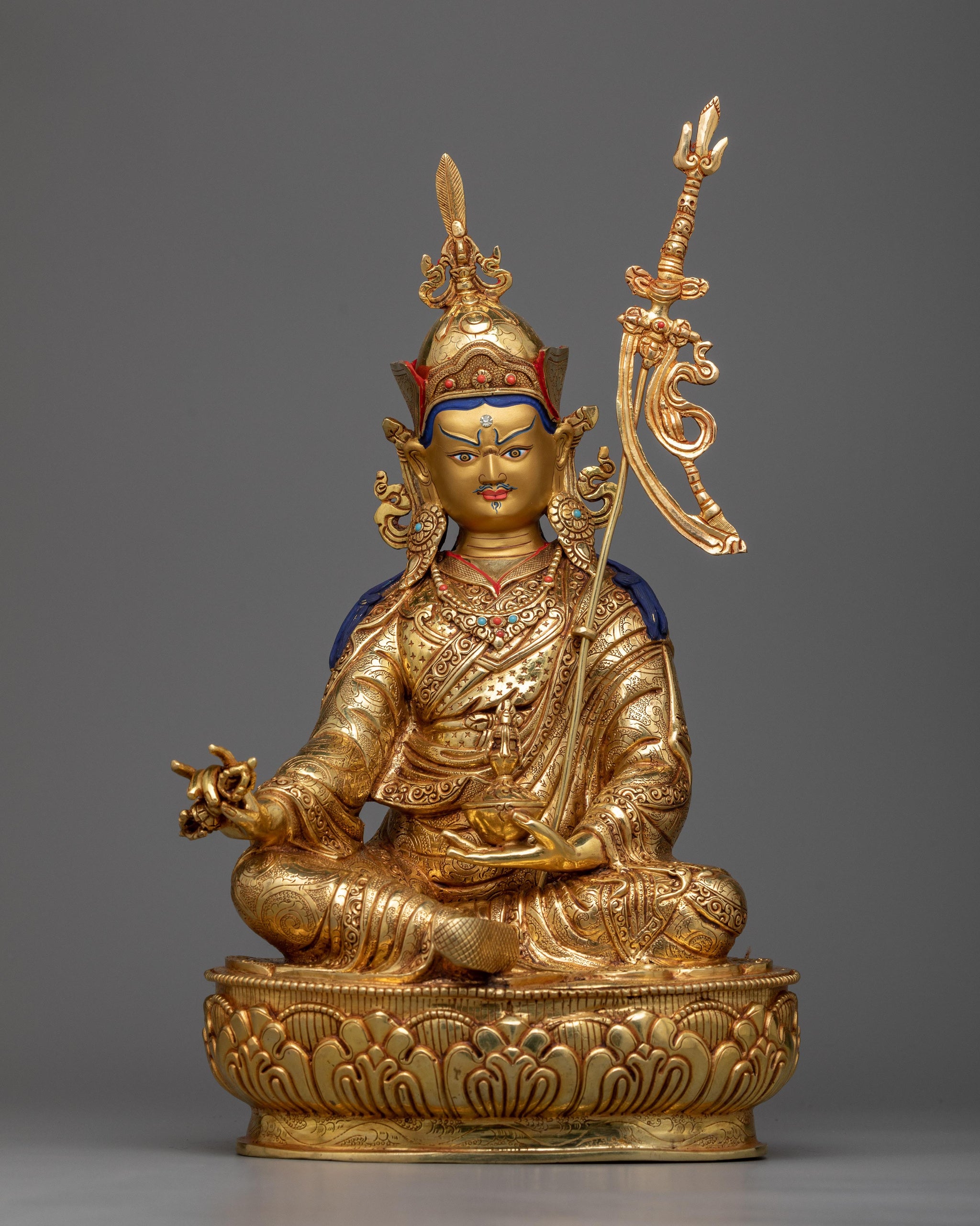 The sculpture is expertly made from a copper body, which was chosen for its strength and spiritual resonance. It is gilded in exquisite 24K gold, symbolizing the statue's sacred nature and the spiritual illumination that Padmasambhava provides. The gold finish is enhanced by elaborate gold and acrylic paints that highlight the delicate nuances of Padmasambhava's regal yet compassionate demeanor.