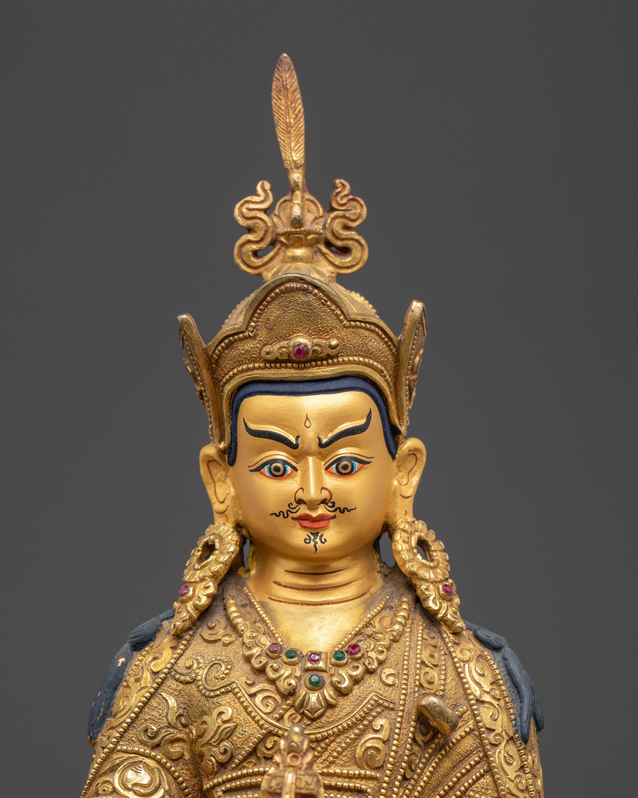 The Padmasambhava Tibetan Sculpture, also known as the Lotus-Born Master, stands at 9.1 inches (23 cm) in height with a 5.9-inch (15 cm) base and weighs 1.36 kilograms. Made from copper, covered with a triple layer of 24K gold gilding, and carved with deeply engraved carvings that produce a magnificent 3D-like effect. This sculpture, adorned with hand-carved gemstones, handcrafted by expert Nepalese artisans, elegantly symbolizes Himalayan Buddhism's sacred traditions, making it an appropriate addition to altars, meditation places, or sacred collections.