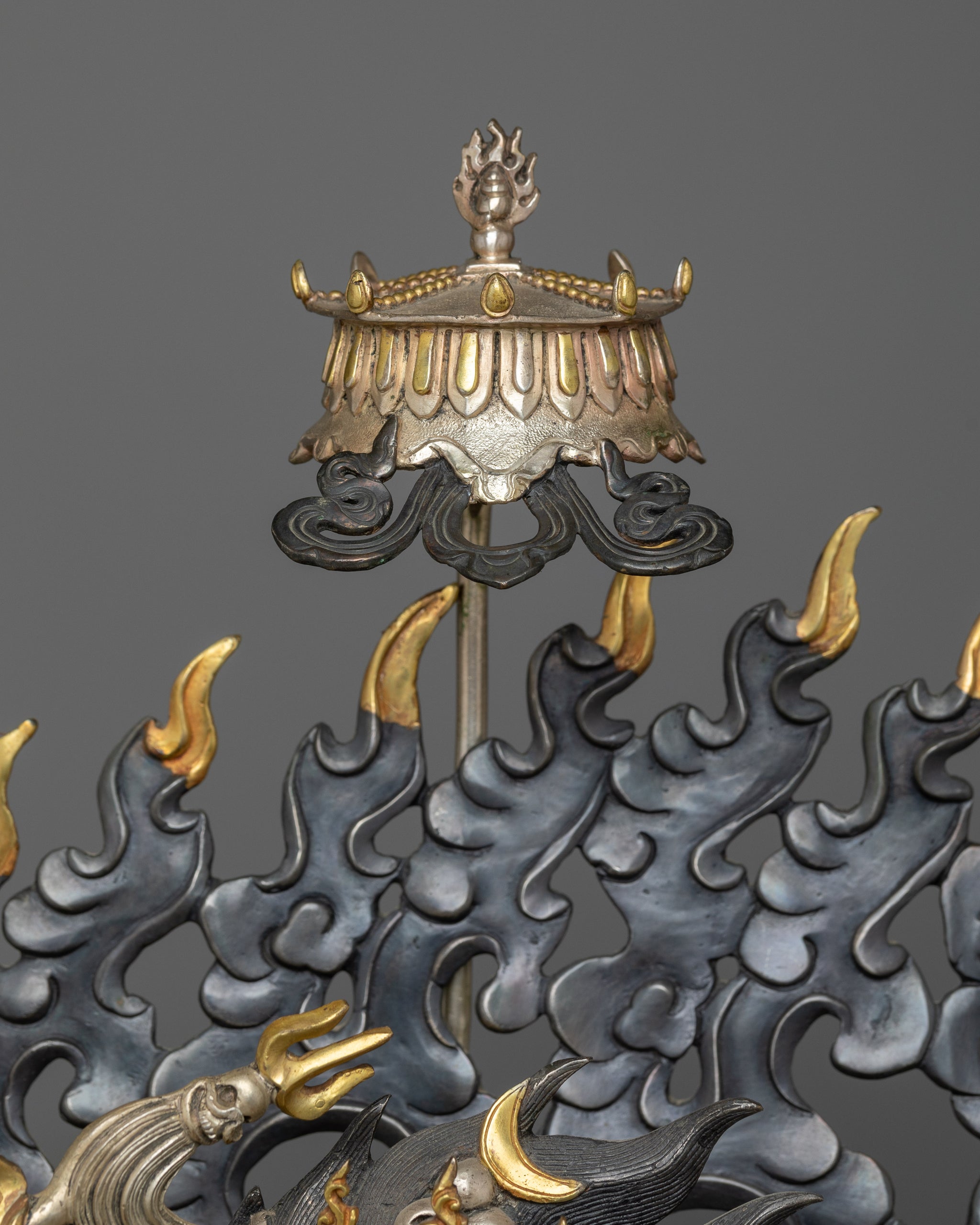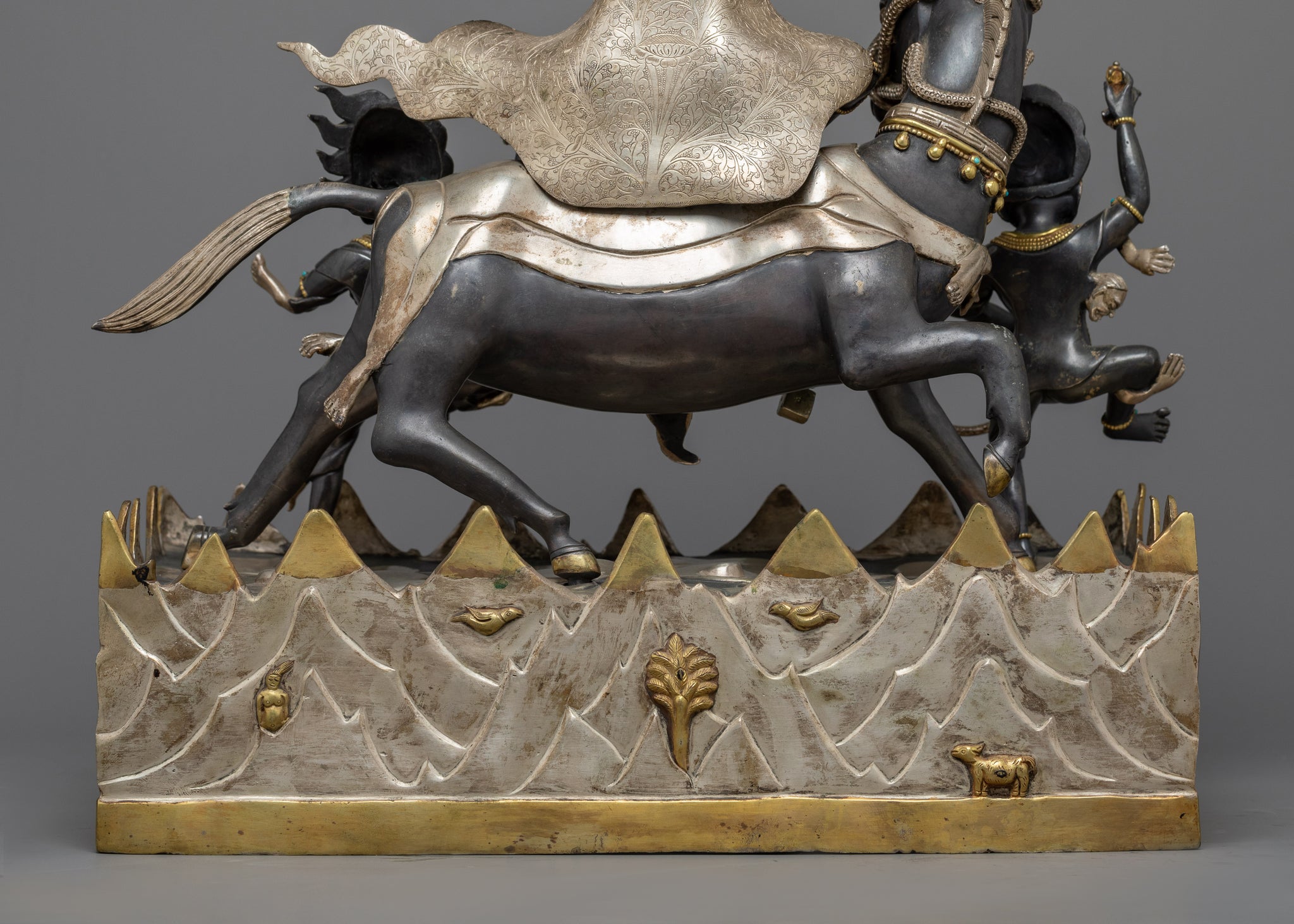 We, Vajrayana artists from Kathmandu Valley, have masterfully hand-carved the Palden Lhamo Empowerment statue in the traditional Himalayan style. The deity is depicted in this statue riding a mule over blazing flames, signifying both her prowess in negotiating treacherous terrain and her function as a defender of the Dharma. She bears a trident in her left hand, signifying her ability to overcome challenges, and a skull cup in her right hand, signifying the transience of life and the need to develop objectivity. She can also be seen wearing a crown made of skulls and a garland of human heads. Every detail has been crafted with care and precision using hammers and chisels, resulting in a truly magnificent work of art.