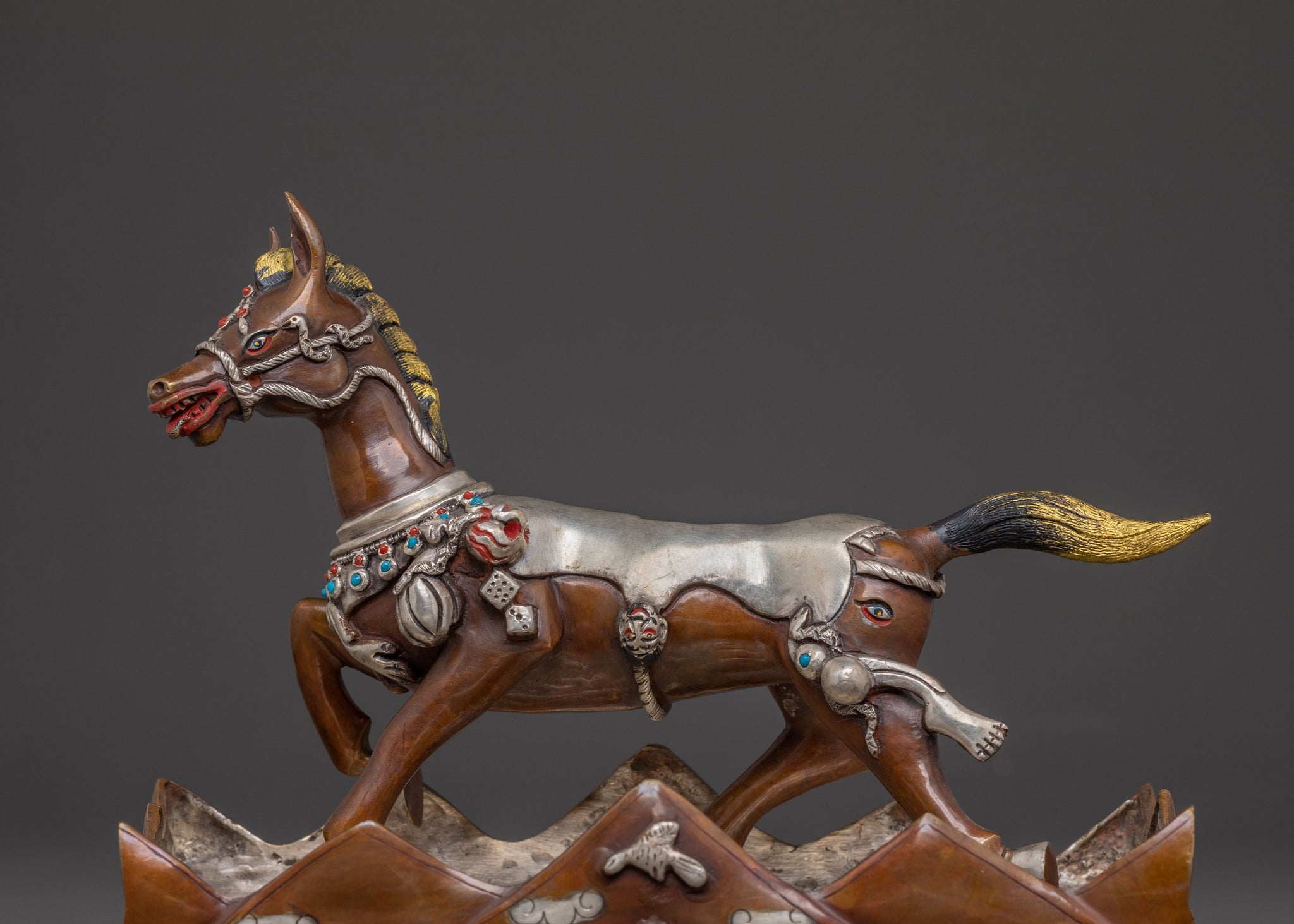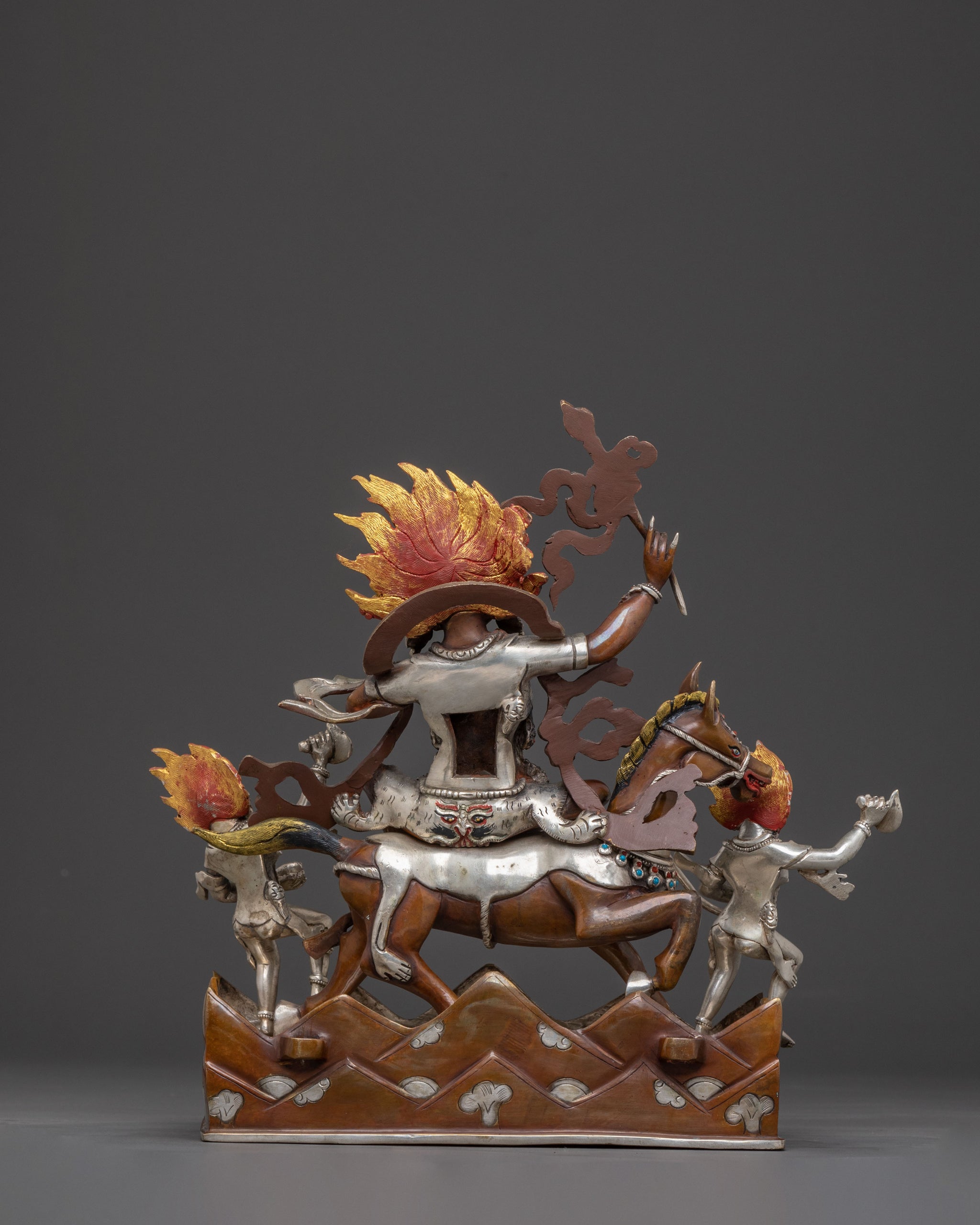 Palden Lhamo, the fierce protector deity, commands attention astride her midnight steed—a symbol of unstoppable momentum and divine authority. Adorned with a crown of five skulls representing mastery over ignorance, attachment, anger, pride, and jealousy, she embodies wrathful compassion in its most potent form. Her three penetrating eyes pierce through time itself, witnessing past, present, and future simultaneously. In her hands rest sacred implements: the khatvanga staff crowned with a vajra symbolizing indestructible spiritual power, and a kapala skull cup transforming suffering into enlightened wisdom. Her mount, bedecked with skulls including her son's visage, gallops through a blazing aureole of spiritual fire that incinerates all obstacles and negativities. Flanked by two fierce attendants against a dramatic mountain backdrop, this copper sculpture captures her dual nature—a wrathful guardian whose fierce protection springs from boundless compassion, eternally vigilant over those walking the sacred path.