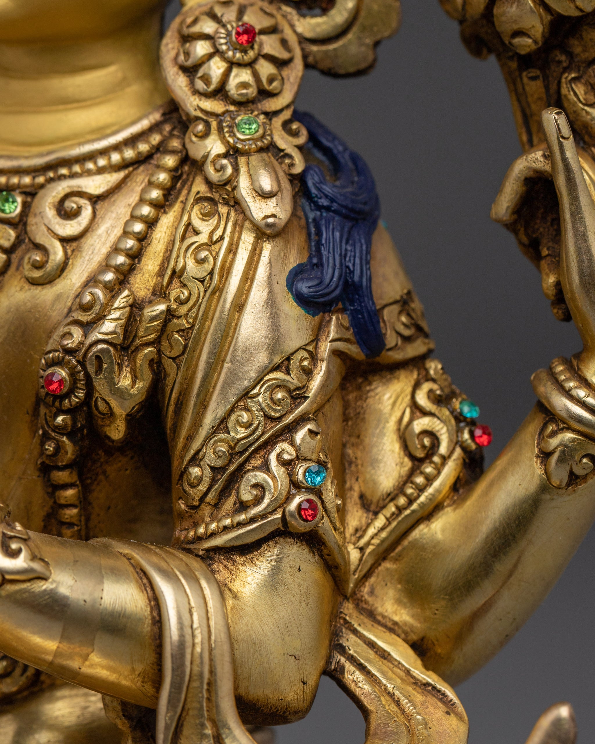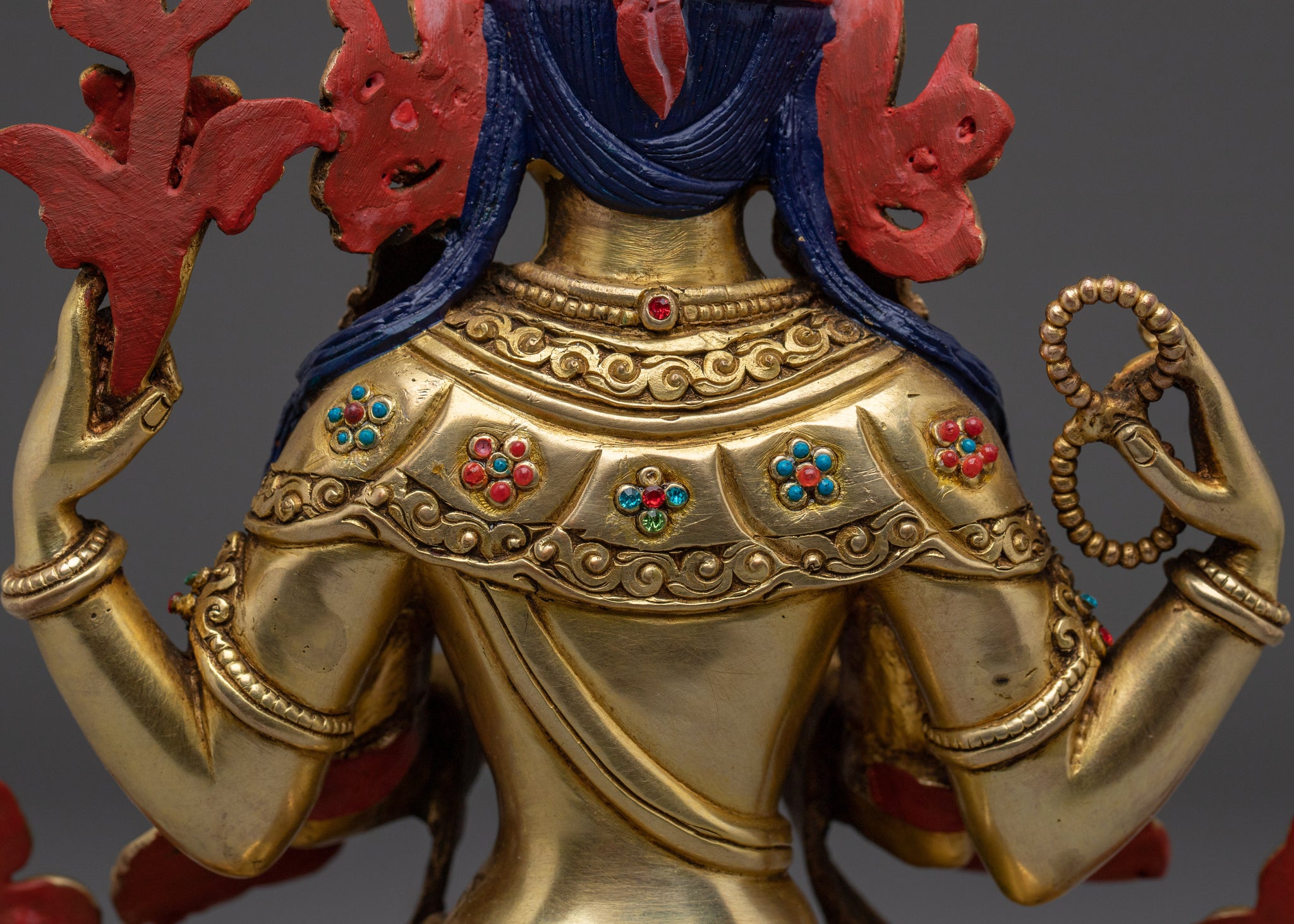 Vajrayogini is stunning. The details are amazing. It's easy to make out her facial expressions, skulls, feet, and the ring of fire around her. You can tell she's handmade. There is a consecration hole in her back.