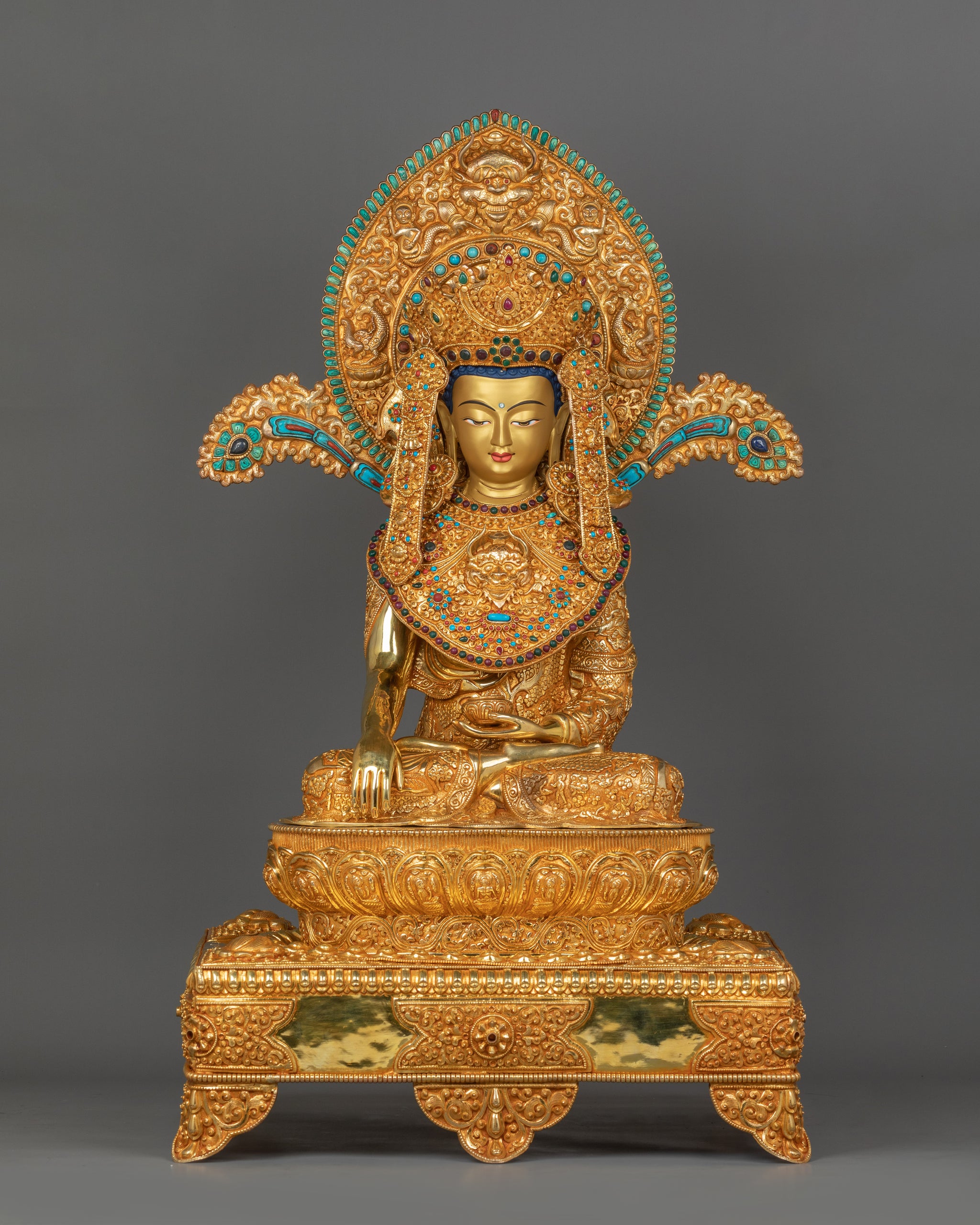 The Peaceful Crown Shakyamuni Buddha Figurine symbolizes the Buddha's deep teachings and the path to spiritual awakening. This handcrafted statue is 33.1" (Height) x 20.9" (Base) and weighs 21.1 kg. It is made of copper, covered with triple layer 24K gold gilding and carved with deeply engraved carvings that produce a magnificent 3D-like effect. This sculpture, adorned with hand-carved gemstones, and handcrafted by expert Nepalese artisans, elegantly symbolizes Himalayan Buddhism's sacred traditions, making it an appropriate addition to altars, meditation places, or sacred collections.