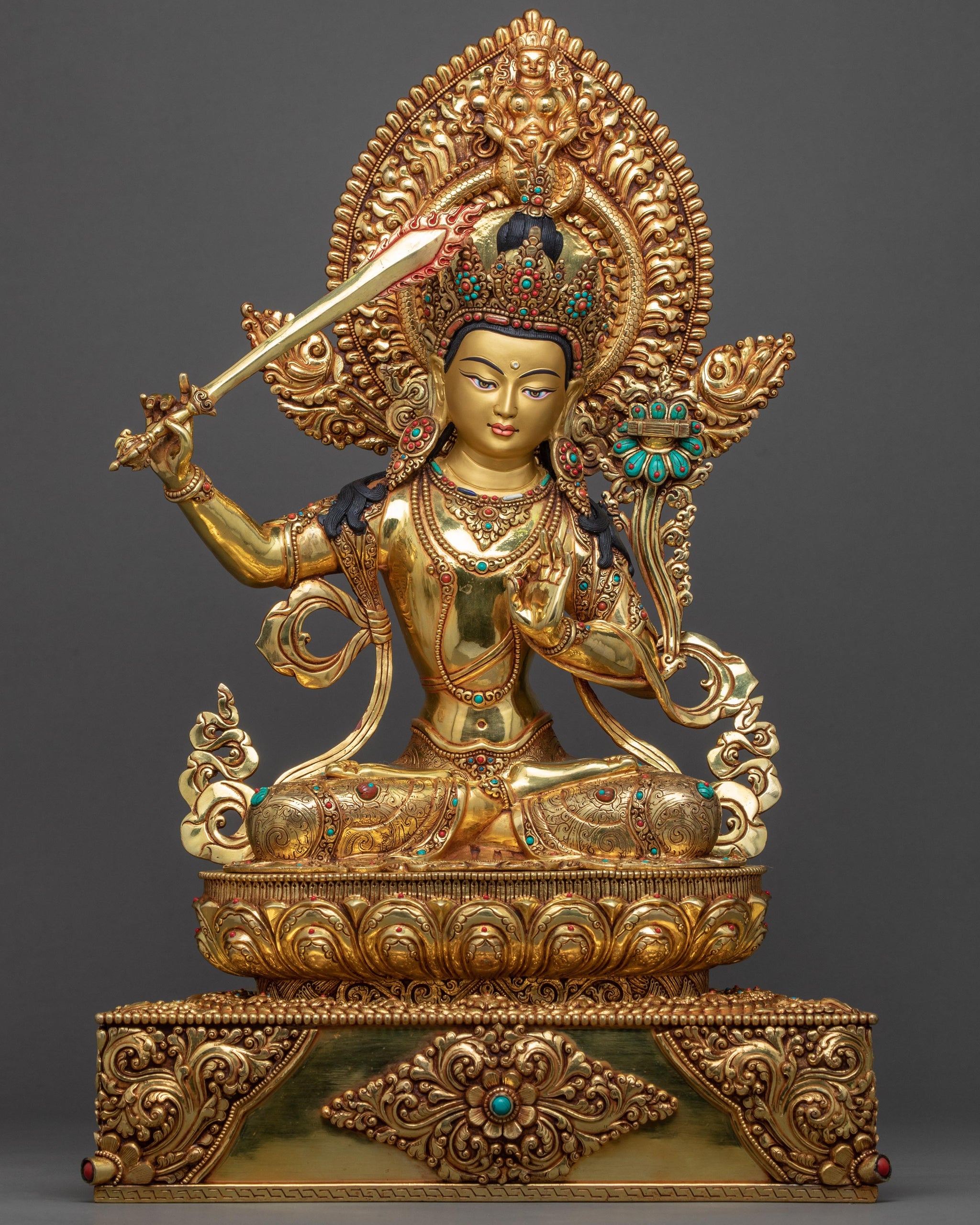 We have traditionally hand-carved the Peaceful Manjushri Sculpture with flawless intricate design patterns in our studio in Nepal. Carved from a copper body and gilded with genuine 24k gold over the body of the statue. The statue is highlighted more by the acrylic paint, giving it a captivating appearance. With a serene look, we have portrayed a deity sitting atop a moon disc lotus seat and clutching the wisdom sword in his right hand while holding a lotus in his left hand with a wisdom book propped up on top. This form of art can be applied to many Buddhist celebrations, daily yoga or meditation routines, and a variety of interior pursuits. The artists of Nepal have worked tirelessly for months to carve the intricate design patterns of the statue which are exclusively found in the Kathmandu valley.