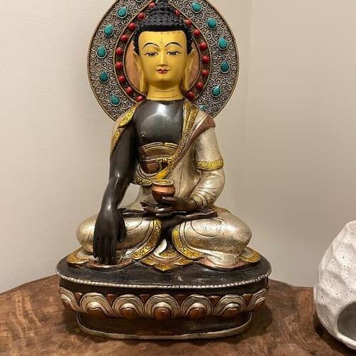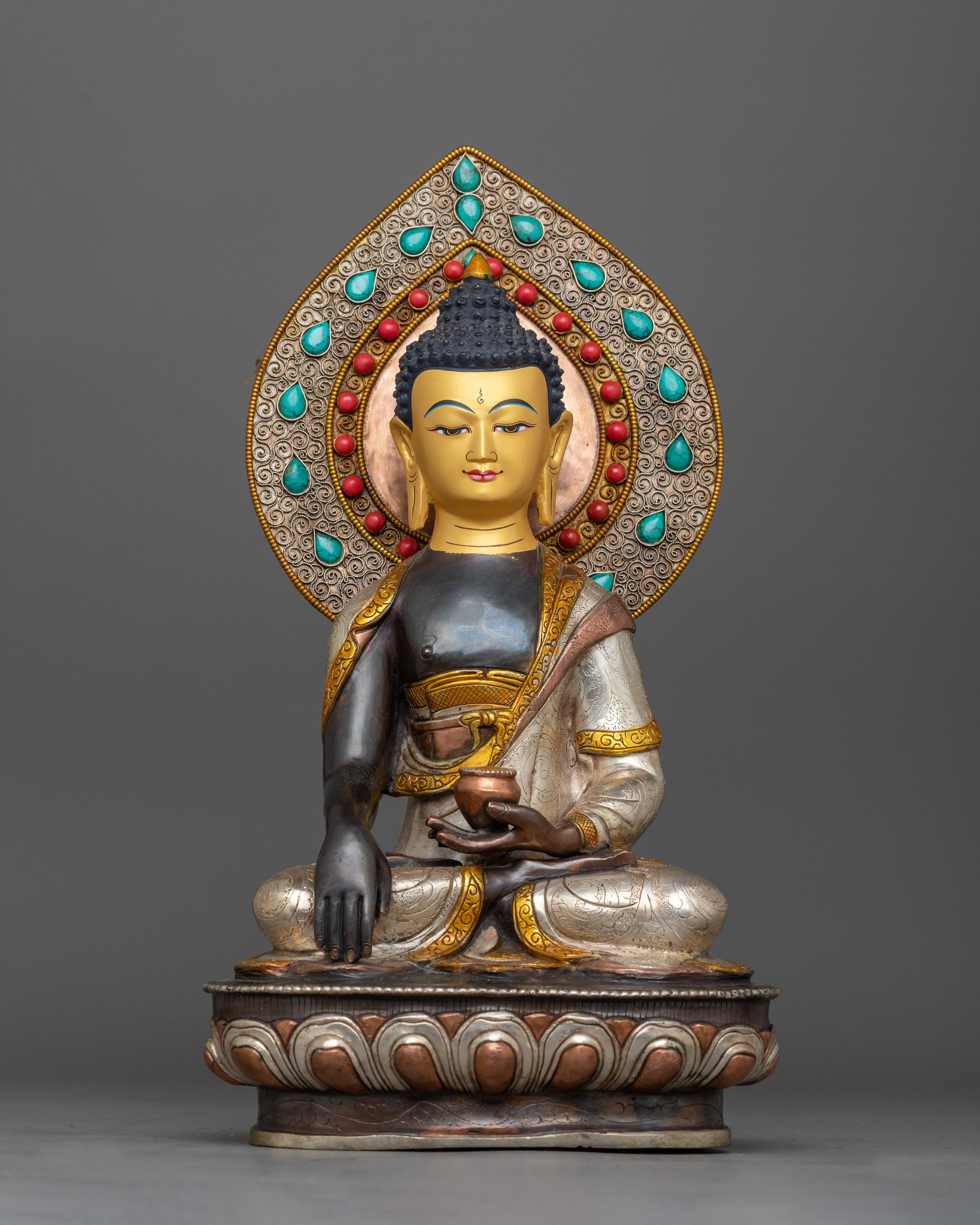 Introducing the Peaceful Shakyamuni Buddha Statue, an exquisite portrayal of Siddhartha Gautama, the founder of Buddhism, in his most serene and enlightened form. Measuring 14.7 inches in height, set upon an 8.2-inch base, and weighing 3.76 kg, this statue is a testament to the profound peace and wisdom that Shakyamuni Buddha embodies. Crafted from an oxidized copper body and adorned with silver plating, enhanced by delicate gold and acrylic paintings, it captures the radiant calm and deep spiritual presence of the Buddha.
