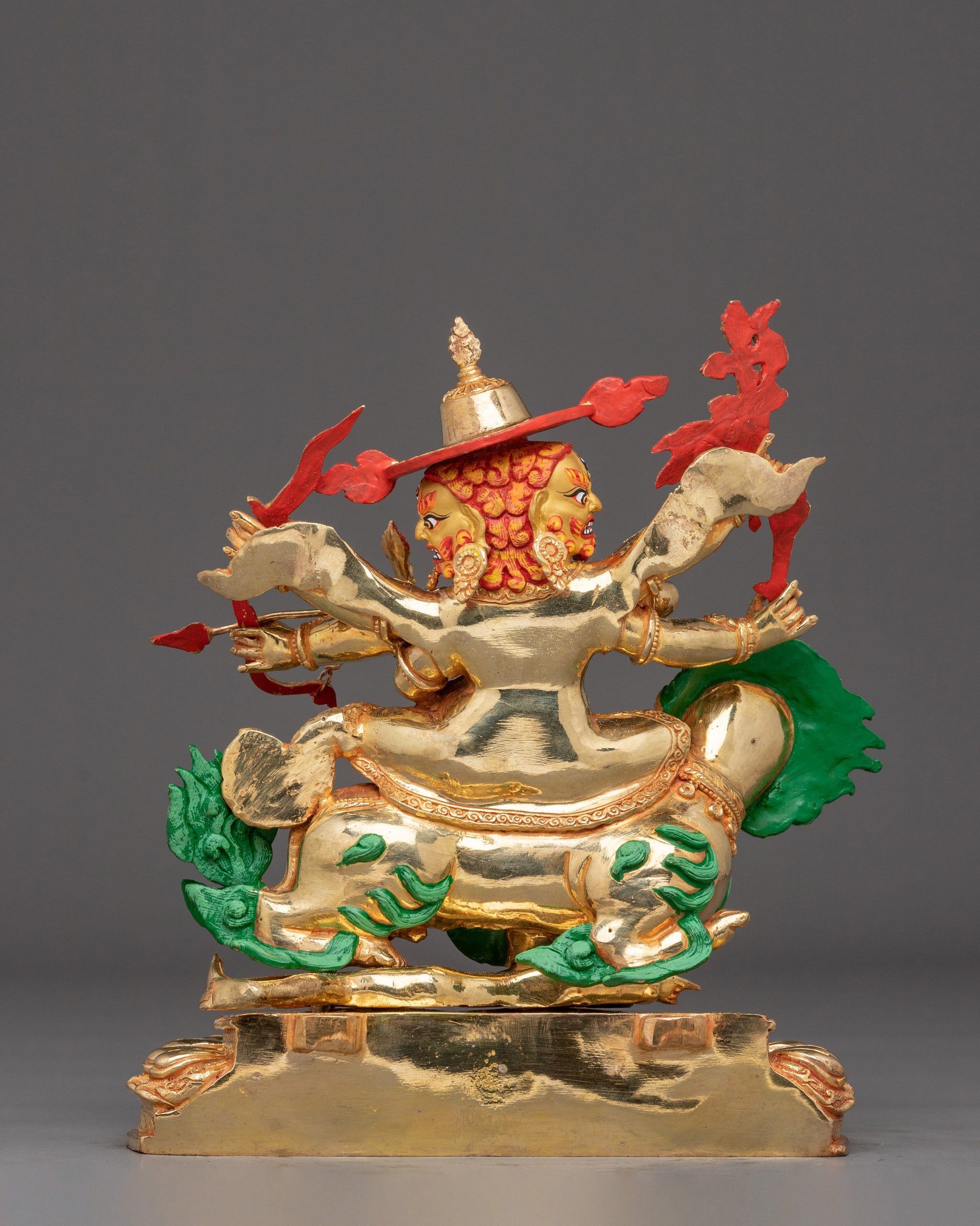 This 10.6 Inch Statue of Pehar Gyalpo, also known as the Chief Protector of Samye Monastery, measures 10.6”/27cm in height and 8.3”/21cm in width, weighing 3.87kg. Expertly crafted from a copper body and adorned with 24K gold gilding and intricate gold and acrylic paintings, it reflects the skill and devotion of Nepali artisans, making it a striking addition to altars, meditation spaces, or spiritual collections.