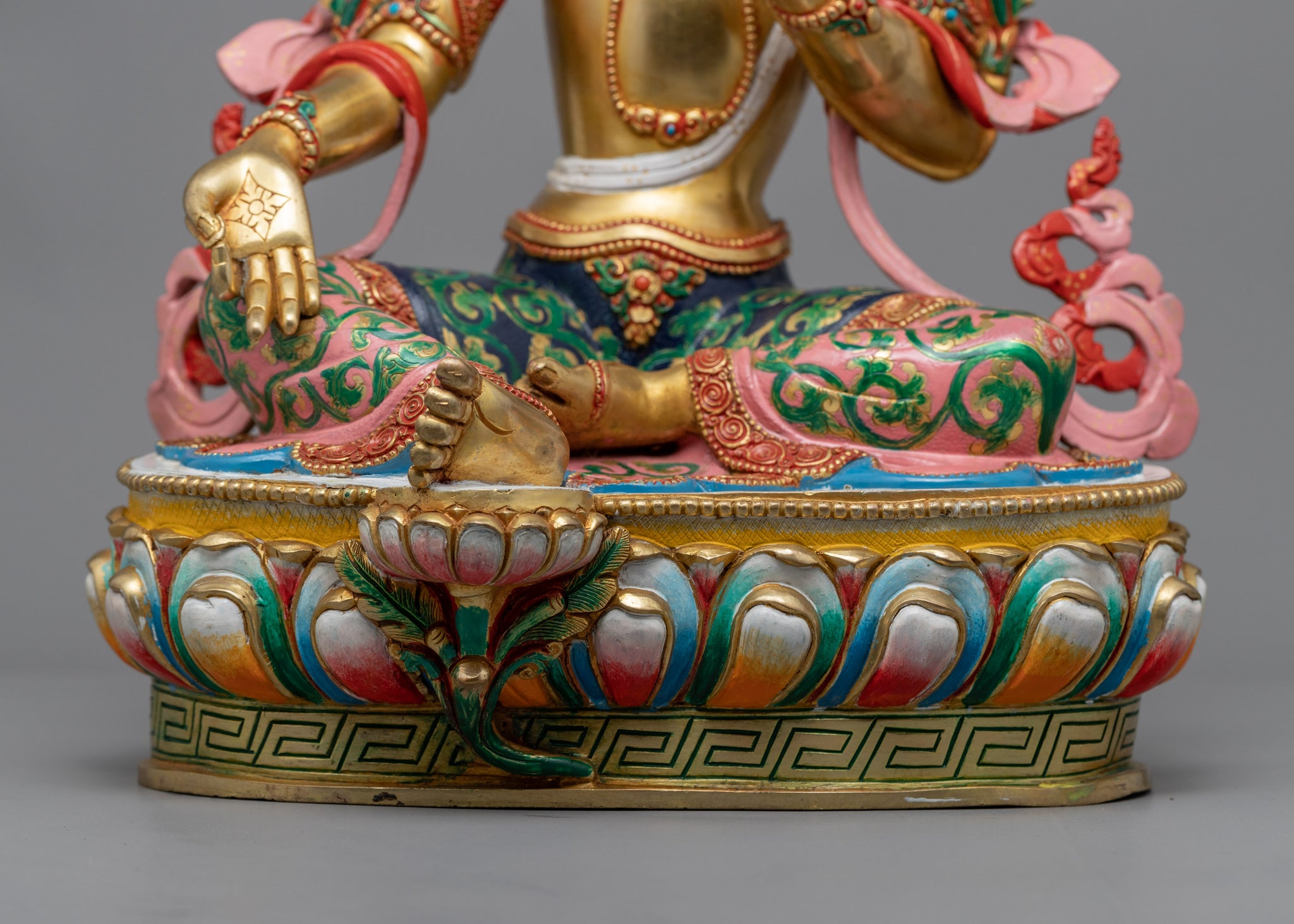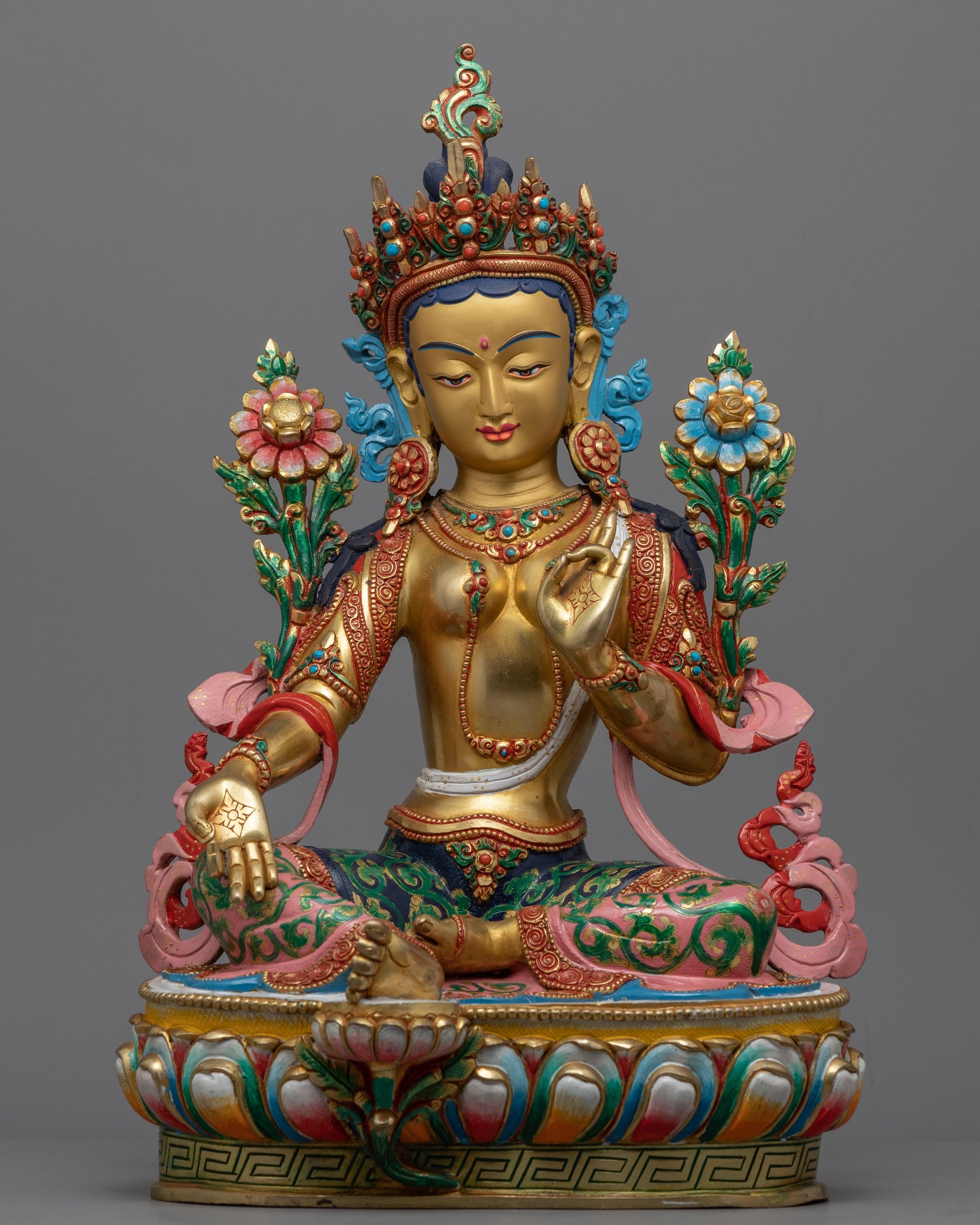 We created the magnificent Nepali Princess Tara Gold Statue using traditional Himalayan methods. The deity is perched atop a moon-shaped lotus seat. She is depicted in the statue holding an utpala stem with both hands while doing the vitarka and varada mudras with her right and left hands, respectively. She has a serene facial expression. Valuable turquoise and corals have been used to embellish the deity's crown, halo, and various body adornments. Copper was used to molding the figure. It has been intricately hand-carved with creative patterns. It is afterward gilded with real 24K gold. We combined a variety of acrylic paints to capture the actual spirit of the deity. Both utpalas have a mix of several color schemes. We worked hard for several months to finish the figure. The elaborate design patterns were hand-carved using a hammer and tiny chisels. Artists must have years of skill since delicate carvings require them to carve out elaborate designs on a small surface.