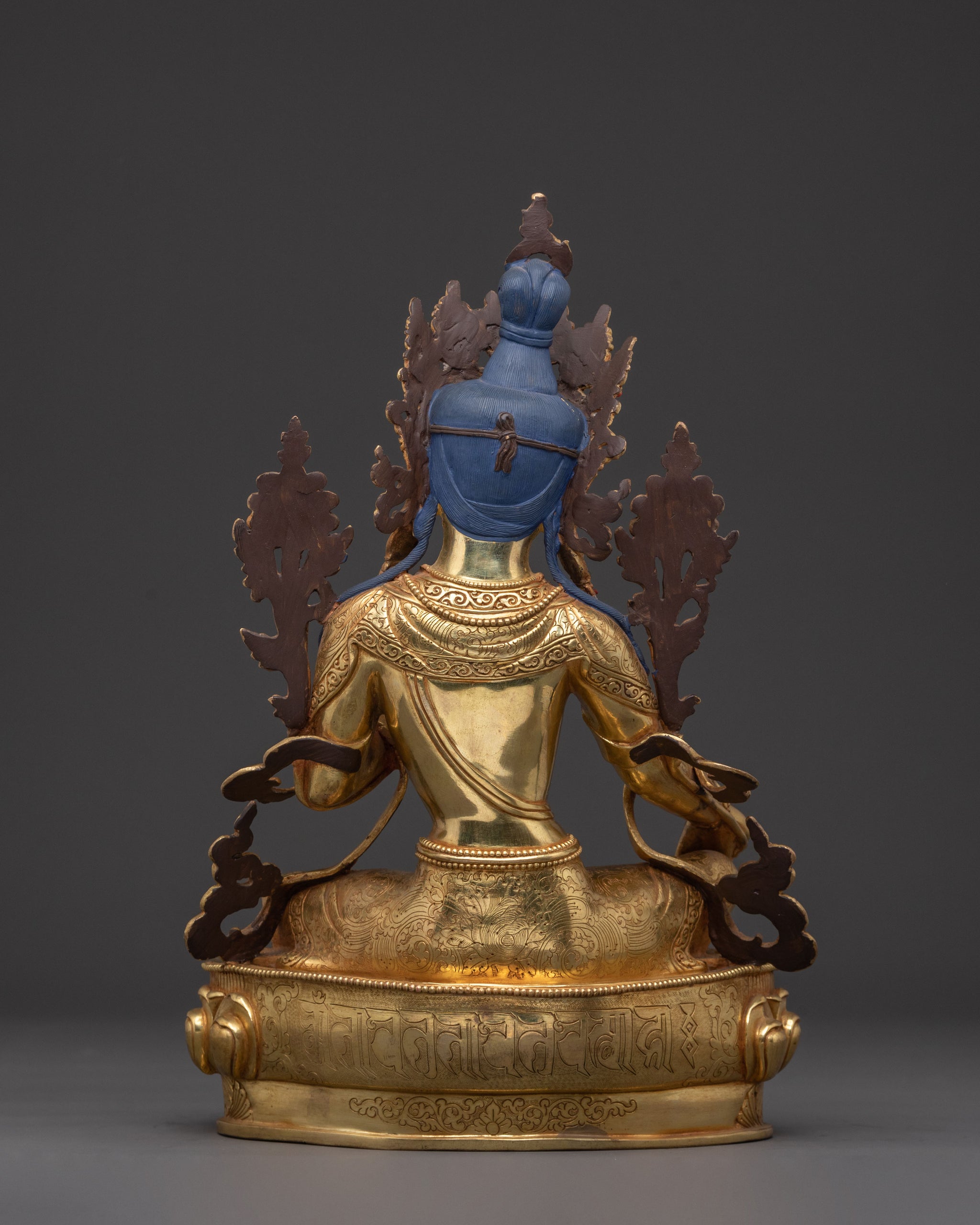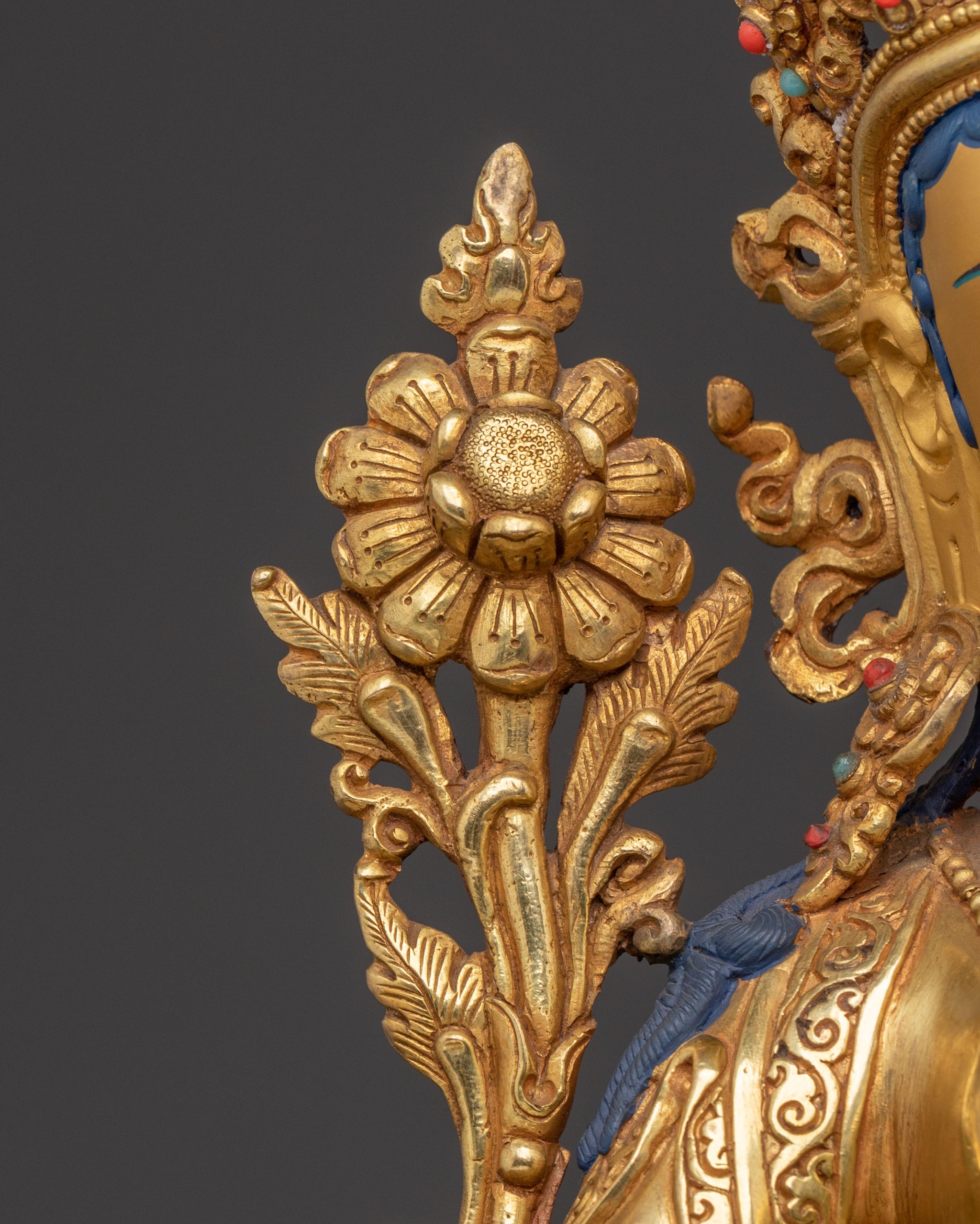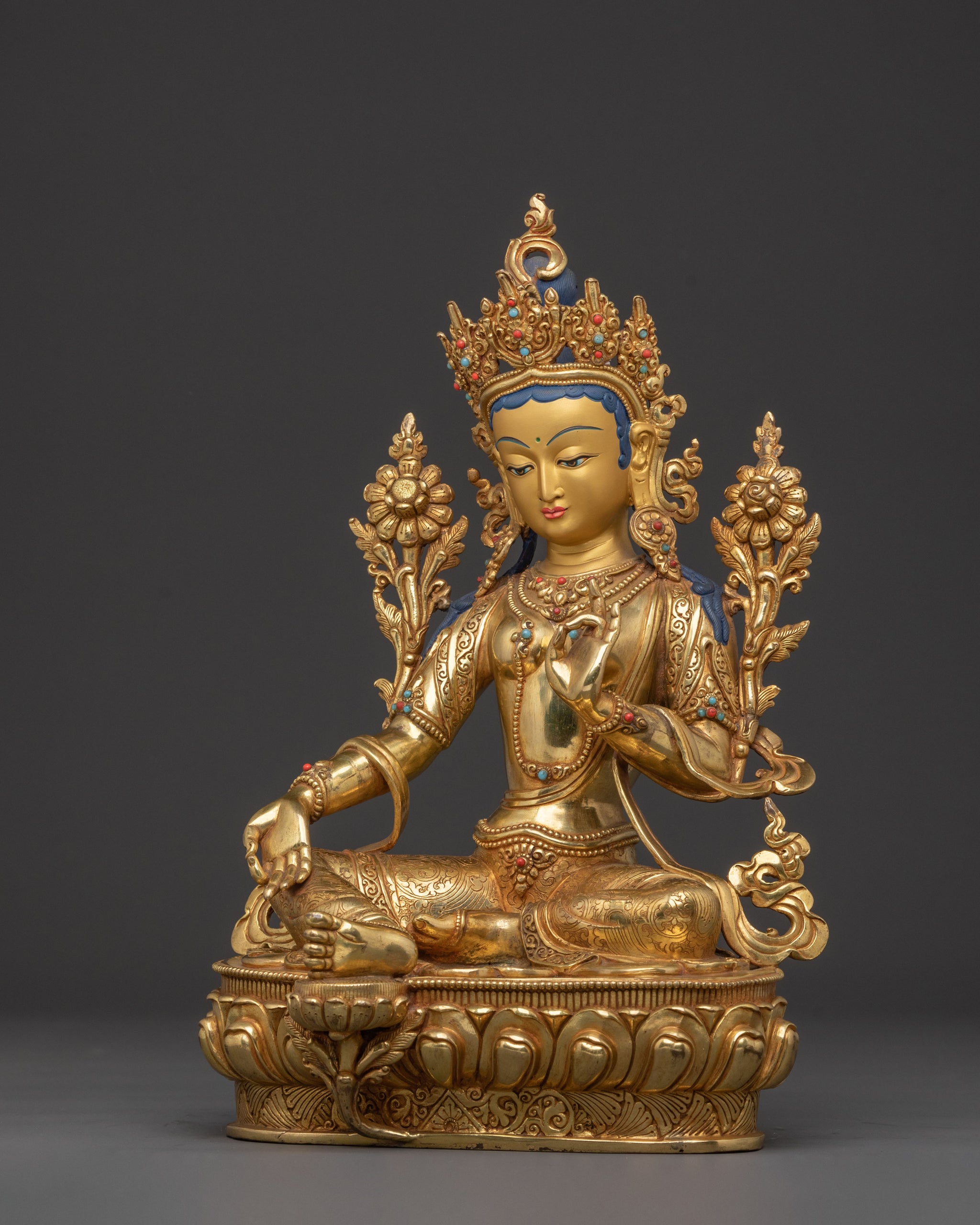 Green Tara, revered as the 'Swift Liberator,' is depicted with her right leg extended, ready to spring into action to alleviate suffering and overcome obstacles. Her right hand rests on her knee in the mudra of supreme generosity, while her left holds the stem of a blue lotus (utpala), symbolising purity and power. She offers immediate aid and boundless compassion, making her a powerful meditation statue.