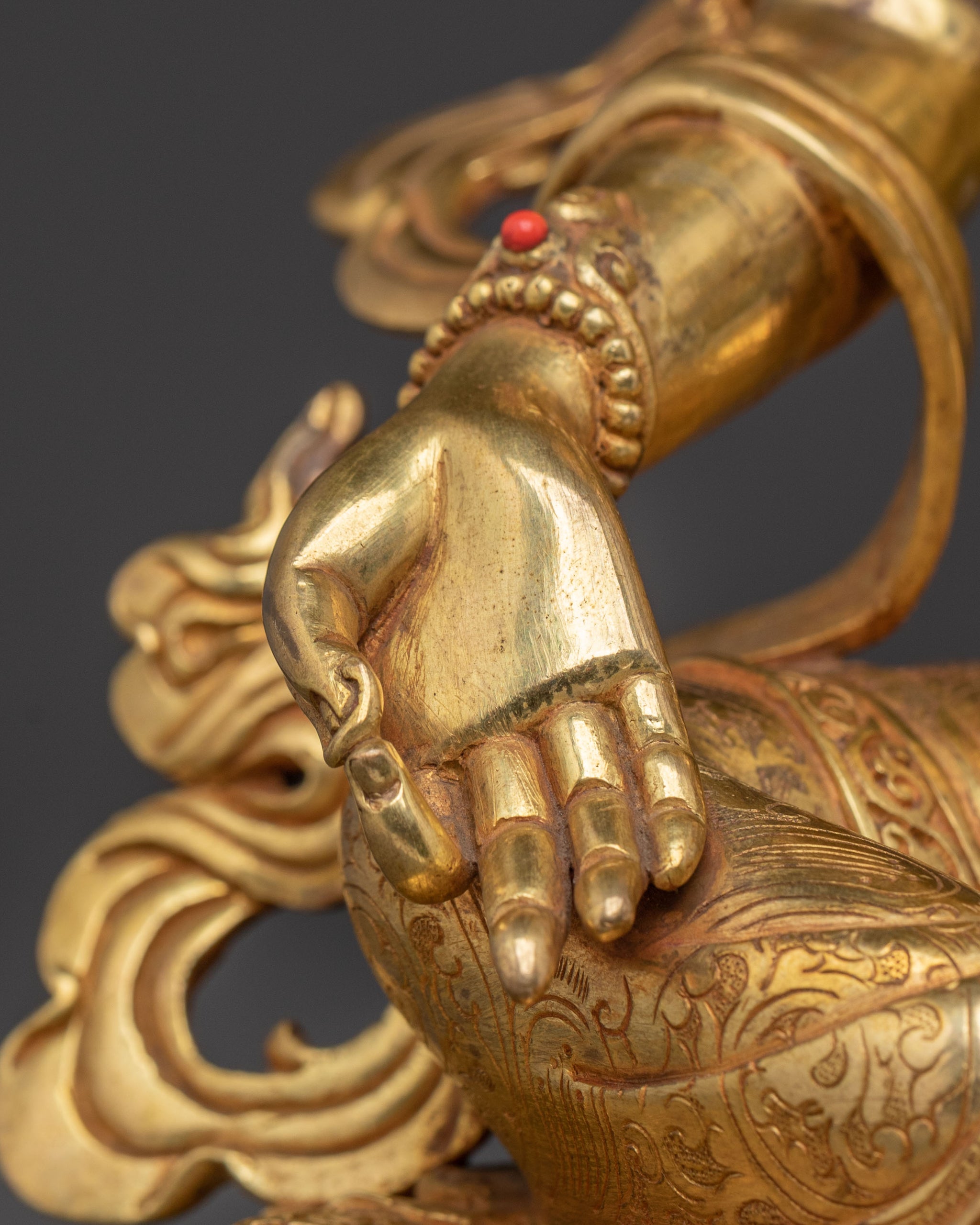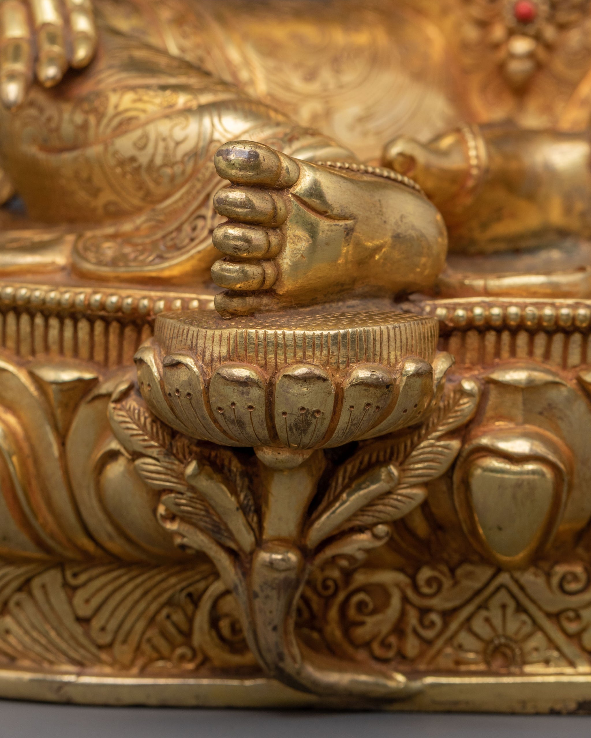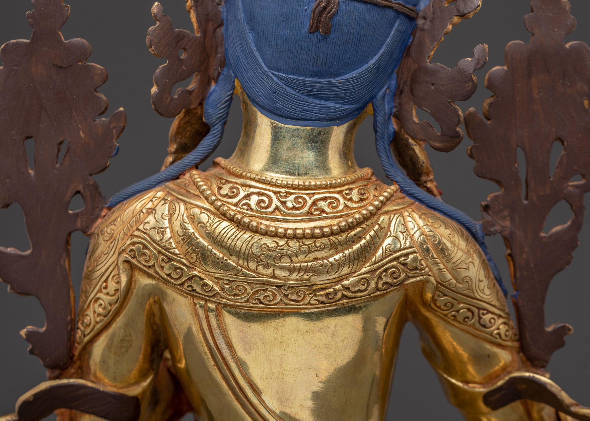 Green Tara, revered as the 'Swift Liberator,' is depicted with her right leg extended, ready to spring into action to alleviate suffering and overcome obstacles. Her right hand rests on her knee in the mudra of supreme generosity, while her left holds the stem of a blue lotus (utpala), symbolising purity and power. She offers immediate aid and boundless compassion, making her a powerful meditation statue.