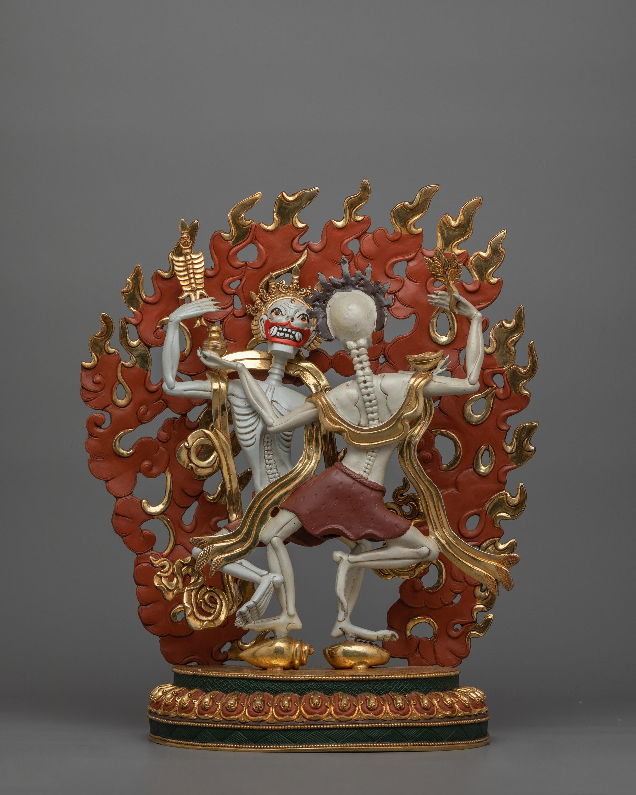 With both male and female skeletons joyfully raising their arms in celebration of being free from ego, this sculpture depicts the Chitipati in their distinctive dance. Their joyful dance symbolizes the fire of wisdom that destroys ignorance and illusions amid flames. The figures are surrounded by fire, which is a potent reminder of the transforming potential of spiritual knowledge. In addition to representing the Chitipati's role as guardians, the building itself is a powerful representation of impermanence that offers a place of reflection on life's transient nature.