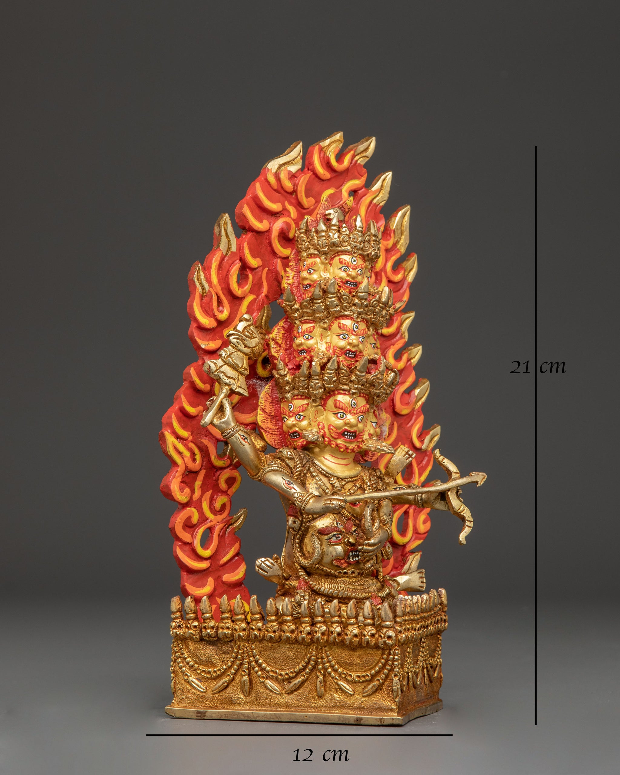 Rahula, one of the powerful protector deities in Tibetan Buddhism, is depicted with a fierce and awe-inspiring appearance symbolizing his power to overcome obstacles and demonic forces. His body is covered with eyes, representing his all-seeing awareness that perceives all actions in the universe. Rahula’s face is terrifying, with gaping fangs and a wrathful expression, showing his ability to subdue negativity. At the center of his stomach is a large face, symbolizing his all-consuming energy that devours evil. He is often depicted holding a bow and arrow, signifying his focused determination to destroy ignorance and harmful influences.