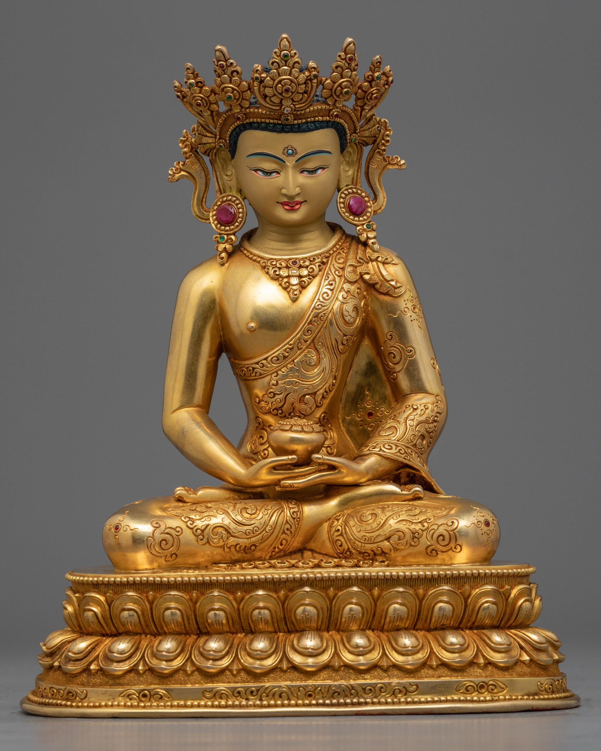 This Pure Land Buddhism Art of Amitabha Buddha has been hand-carved in the traditional Himalayan technique. The statue was made with a copper body and then gilded with 24-karat real gold, emphasizing the intricate design patterns. In Buddhism, Amitabha is characterized as having limitless brightness. The god is shown holding an alms bowl in both hands while seated on a moon disc lotus in the Dhyana Aasan or meditation position. Beautiful precious jewels are placed for the Buddha's ornaments, accentuating the statue's beauty.